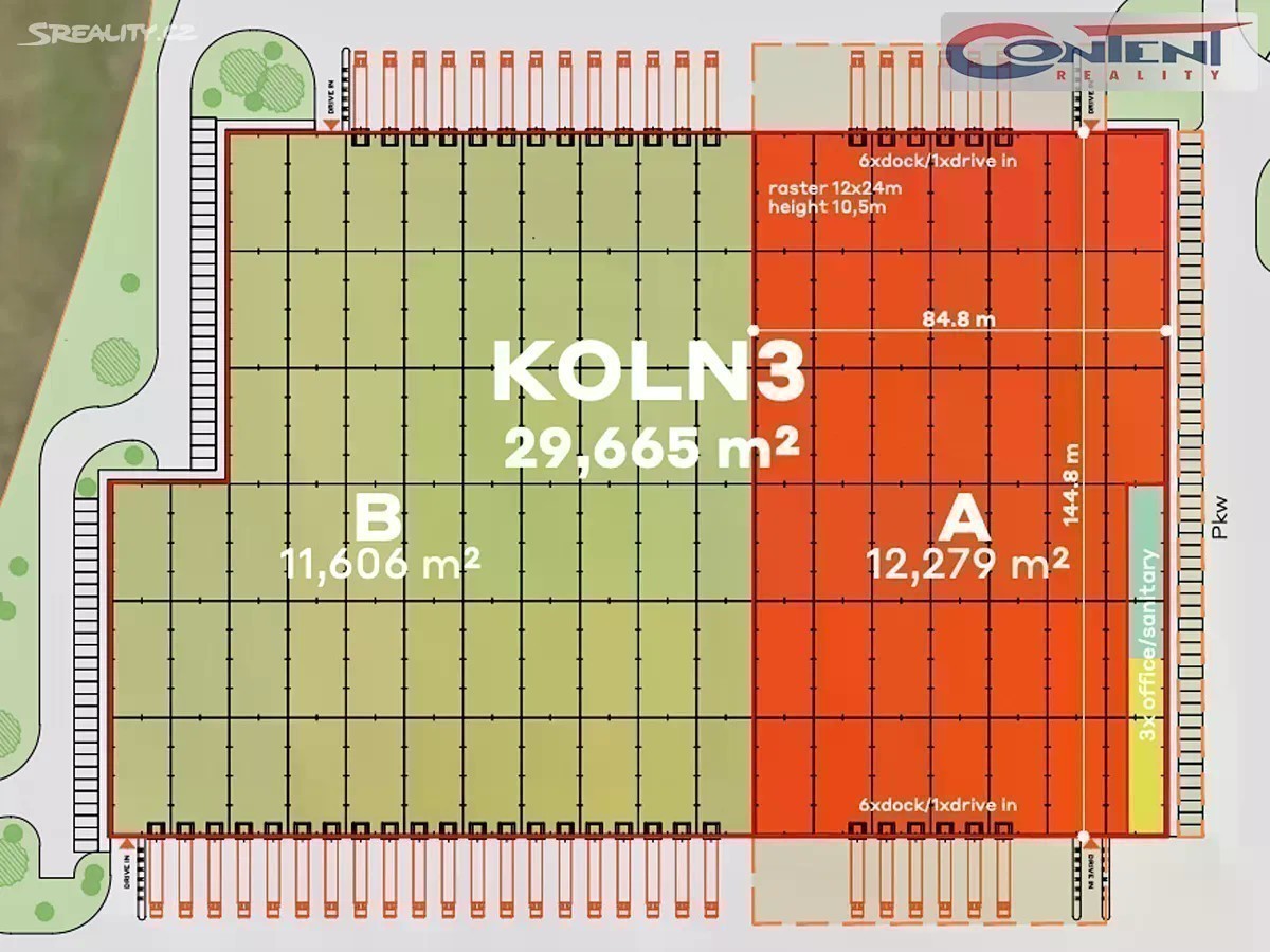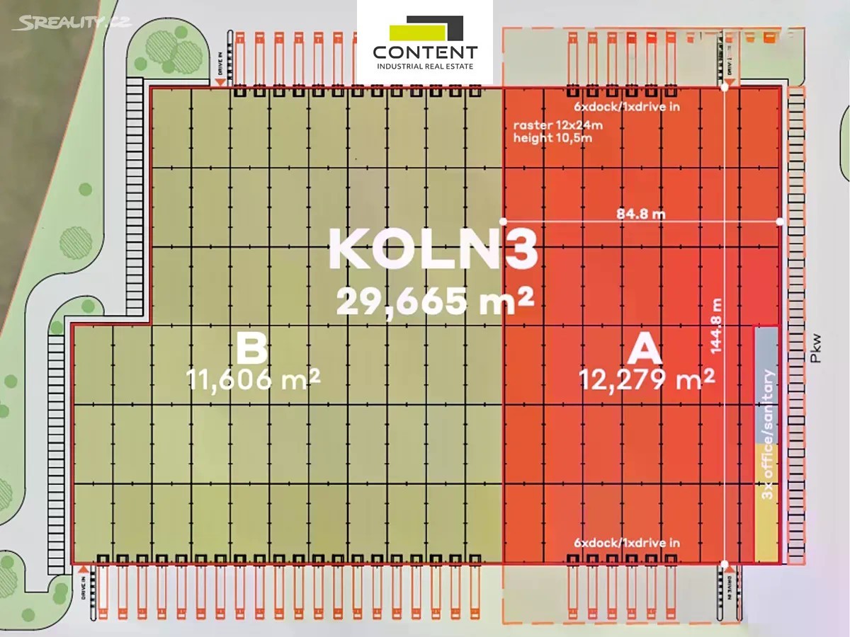Pronájem skladu, výrobních prostor Kolín - Ovčáry, D11. V zastoupení majitele a bez provize nabízíme novostavbu skladu nebo výrobních prostor 12000 m², umístěných v komerční budově o celkové velikosti 29665 m² v rámci zcela nového industriálního parku, který je v těsné blízkosti výrobního závodu Toyota Motor Manufacturing. Lze je využít především pro skladování a výrobu. Svou polohou mají jednoduché napojení na dálnici D11, EXIT 42 a 50. - ve výstavbě, k dispozici do 6 měsíců - samostatná budova až 29665 m² (budova KOLN3) - prostory lze dělit na jednotky od cca 3000 m², dle požadavků - výška 10 m - vstupy v úrovni vozovky i pomocí hydraulických ramp - bezprašné podlahy s minimální nosností 7 t/m² - kanceláře, showroom, zázemí budou vestavěny na míru, dle potřeby - osvětlení technologií LED - další úpravy možné, dle potřeb konkrétního klienta - příjezd pro TIR samozřejmostí, dostatečné manipulační i parkovací plochy - v rámci areálu možnost pronájmu až 60000 m² Cena nájmu je individuální, bude stanovena dle dalších podmínek smlouvy. Fotografie jsou pouze ilustrativní. Pro více informací nás kontaktuje, rádi Vám zajistíme prohlídku nemovitosti.