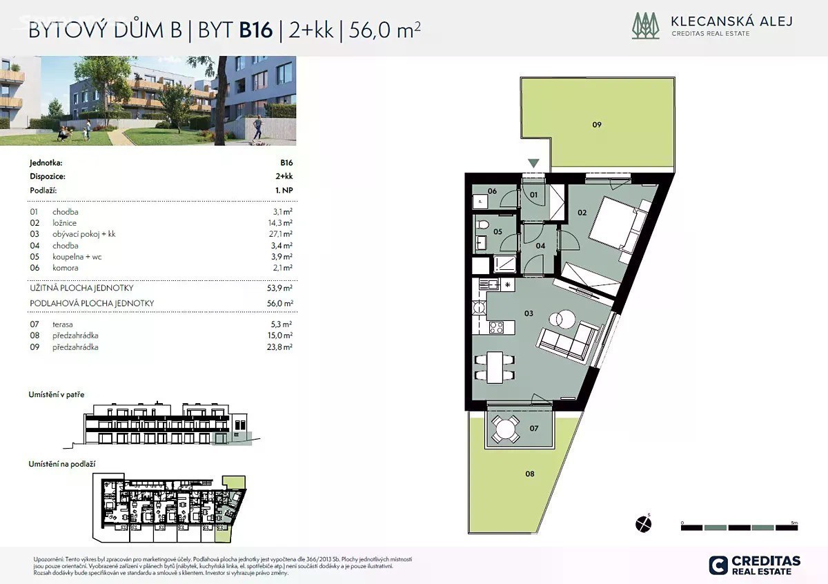 Dovolujeme si vám nabídnout byt 2+kk o celkové výměře 56 m², umístěný v 1.NP, který je součástí projektu Klecanská alej nedaleko od hlavního města. Projekt se nachází v ulici Topolová v Klecanech, které jsou nejmenším městem v okrese Prahavýchod a nachází se 5 km severně od okraje hlavního města Prahy na pravém břehu Vltavy. Život v Klecanské aleji vám přinese bydlení v klidném a moderním prostředí, krásnou okolní přírodu včetně řeky a dobrou občanskou vybavenost. Klecany nabízí díky hlavnímu tahu E55 výborné automobilové napojení do hlavního města. Zastávka MHD je tři minuty chůze od projektu a za 15 minut vás autobus dopraví na pražské metro Kobylisy. V obci funguje také přívoz Klecánky - Roztoky u Prahy, takže se rychle přepravíte na druhou stranu Vltavy. Projekt představuje 31 samostatně stojících budov typu vila, rodinný dům, rodinný řadový dům a 37 bytových jednotek 1+kk 4+kk. V projektu je kladen důraz na promyšlené dispoziční uspořádání interiérů, úložné prostory, dostatek parkovacích stání a zeleň. Plánované dokončení projektu 1. polovina roku 2027. Uvedená cena zahrnuje venkovní žaluzie. K bytu je možné přikoupit venkovní parkovací stání či sklep. Jednotková cena stání je 300 000 Kč vč. DPH. Cena sklepu je dle velikosti, jednotková cena je 33 600 Kč/m2 vč. DPH. V případě zájmu nás neváhejte kontaktovat. Prodej přímo od majitele. Více informací o tomto bytu a kompletní nabídce najdete na webu creditasre.