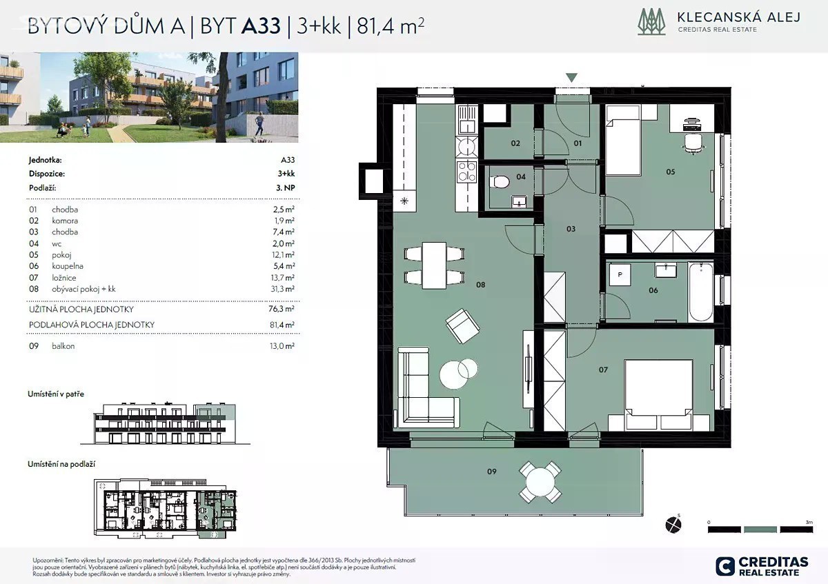 Dovolujeme si vám nabídnout byt 3+kk o celkové výměře 81 m², umístěný ve 3.NP, který je součástí projektu Klecanská alej nedaleko od hlavního města. Projekt se nachází v ulici Topolová v Klecanech, které jsou nejmenším městem v okrese Prahavýchod a nachází se 5 km severně od okraje hlavního města Prahy na pravém břehu Vltavy. Život v Klecanské aleji vám přinese bydlení v klidném a moderním prostředí, krásnou okolní přírodu včetně řeky a dobrou občanskou vybavenost. Klecany nabízí díky hlavnímu tahu E55 výborné automobilové napojení do hlavního města. Zastávka MHD je tři minuty chůze od projektu a za 15 minut vás autobus dopraví na pražské metro Kobylisy. V obci funguje také přívoz Klecánky - Roztoky u Prahy, takže se rychle přepravíte na druhou stranu Vltavy. Projekt představuje 31 samostatně stojících budov typu vila, rodinný dům, rodinný řadový dům a 37 bytových jednotek 1+kk 4+kk. V projektu je kladen důraz na promyšlené dispoziční uspořádání interiérů, úložné prostory, dostatek parkovacích stání a zeleň. Plánované dokončení projektu 4.Q 2026. Uvedená cena zahrnuje venkovní žaluzie. K bytu je možné přikoupit venkovní parkovací stání či sklep. Jednotková cena stání je 300 000 Kč vč. DPH. Cena sklepu je dle velikosti, jednotková cena je 33 600 Kč/m2 vč. DPH. V případě zájmu nás neváhejte kontaktovat. Prodej přímo od majitele. Více informací o tomto bytu a kompletní nabídce najdete na webu creditasre.