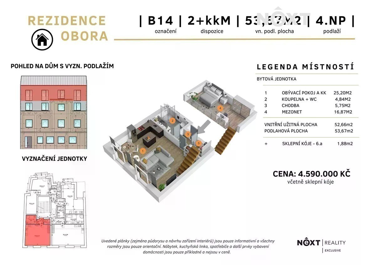 Nový developerský projekt - Rezidence Obora, krásné bydlení v centru Příbrami! Hledáte nové luxusní bydlení v srdci Příbrami? Projekt Rezidence Obora je již zkolaudována. Tento projekt vznikl z původní administrativní budovy, která se z části kompletně rekonstruuje a z části nově přistavuje a zbývá v prodeji poslední mezonetový byt. Byt s označením B14 o dispozici 2+kk ve čtvrtém podlaží disponuje podlahovou plochou 53,67m2 a sklepní kójí o ploše 1,88m2. Čeká na vás podlahové topení a navíc je pro Vás připravena příprava na klimatizační jednotky. S lokalitou budete spokojeni - Příbram je malebné město s bohatou historií a kulturními památkami, ležící přibližně 60 km jihozápadně od Prahy. Město je známé svým hornickým dědictvím a poutním místem Svatá Hora. Okolí Příbrami nabízí krásnou přírodu ideální pro turistiku, cyklistiku a rekreaci Místní infrastruktura poskytuje vynikající občanskou vybavenost, včetně škol, zdravotnických zařízení a nákupních center. Díky pravidelné dopravě do Prahy je Příbram atraktivní volbou pro klidné bydlení s dobrým přístupem do hlavního města. Pravidelnou autobusovou linkou ze zastávky Československé armády (200m od domu) se dostanete za hodinu do Prahy na Smíchov a navíc interval spoje je každých 10-20 minut! Projekt Rezidence Obora v centru Příbrami kombinuje moderní bydlení s přírodním prostředím. Nové byty jsou navrženy s důrazem na komfort a energetickou účinnost, energetická třída vychází na "B“. Rezidence Obora představuje ideální místo pro harmonický život ve spojení města a přírody. Investujte do svého nového kvalitního bydlení v atraktivní lokalitě. Rezidence Obora vám poskytne komfortní a moderní bydlení, které splní vaše představy. Klíčové informace: • Mezonetový byt o dispozici 2+kk • Podlahová plochá 53,67 m2 • 4. nadzemní podlaží • Sklepní kóje o ploše 1,88 m2 • Podlahové vytápění • Příprava na klimatizační jednotky Pro komunikaci uvádějte evidenční číslo zakázky N105382.