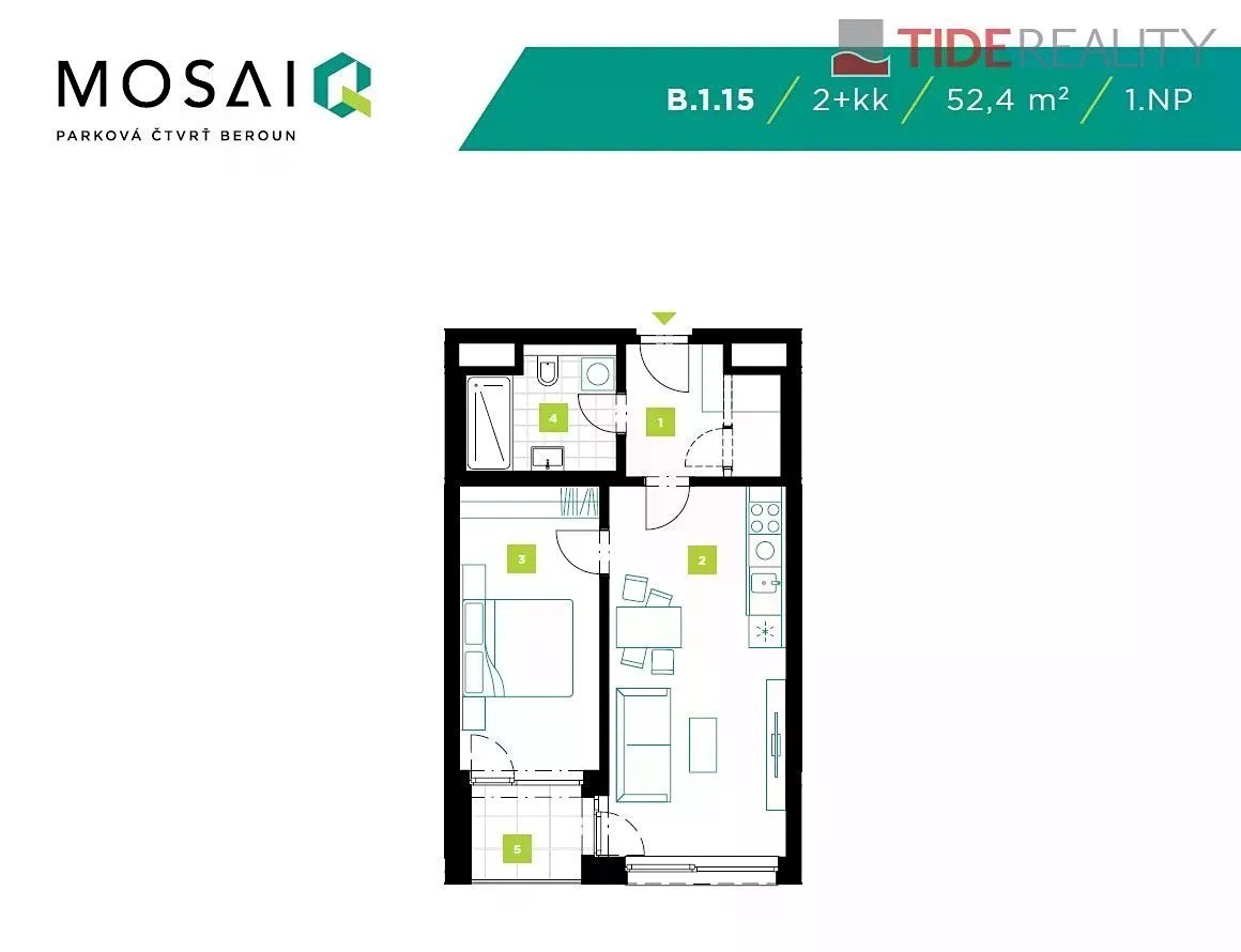 Najděte s námi nový domov v Berouně! Velkoryse koncipovaný soubor bytových domů nabídne široké rozpětí bytů od 1+kk po 5+kk s terasami, balkony či předzahrádkami. Dokončení výstavby v roce 2027. Tento konkrétní byt 2+kk o podlahové ploše 55 m2 s terasou 7 m2 se nachází ve 2.NP pětipodlažní budovy A4 a má velmi příjemnou západní orientaci. Zájemci mají možnost koupě venkovního nebo vnitřního parkovací stání, které není zahrnuto v ceně bytu. V celém projektu je velký výběr menších bytů v rozmezí 4565m2 s balkony či terasami. V současné chvíli je ještě možné přizpůsobit byt některým Vašim požadavkům. Standardní vybavení bytů zahrnuje plovoucí podlahy, interiérové dveře s výškou 210 cm, moderní vybavení koupelen, okna s barevným rámem a izolačním trojsklem, přípravu na vnější žaluzie a klimatizaci. V bytech budou moderní datové rozvody formou strukturované kabeláže a přípojka STA. V projektu bude využita smart technologie pro vytápění, která pracuje se dvěma tepelnými zdroji - tepelnými čerpadly a zemním plynem. Novou obytnou čtvrť ohraničují ulice Na Máchovně a Na Morákově, kde domy vyrůstají v mírném svahu, který se zdvihá k vrcholu Děd. Kvalitní a dostupné bydlení v malebné krajině Berounska s dobrým spojením do Prahy (jen 30 km), ať už po dálnici D5 nebo četnými vlakovými či autobusovými spoji. 20 minut autem na metro Zličín. Beroun je ideální místo pro bydlení pokud hledáte svůj domov v sousedství malebné přírody s širokou nabídkou služeb a aktivního trávení volného času a přesto v komfortním dosahu metropole. V pěší vzdálenosti či v přímém sousedství projektu je síť obchodů, veřejné koupaliště, multifunkční sportovní areál, fotbalové hřiště, škola, školka, síť cyklostezek a další. Potřebujete větší byt, jinou dispozici? Pokud parametry tohoto bytu nesplňují přesně Vaše požadavky, kontaktujte mne a vybereme společně jinou variantu!