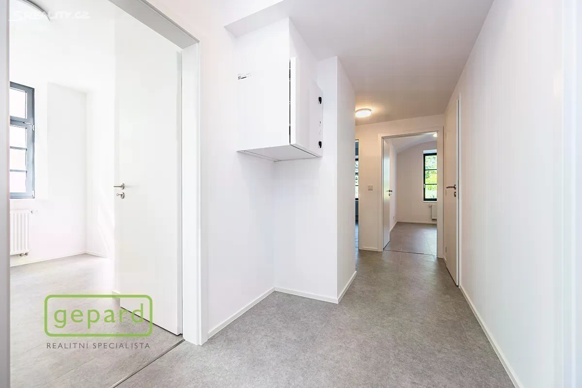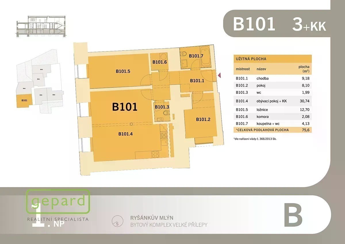 Realitní společnost Gepard nabízí k prodeji byt č. B101 v OV 3+kk, 75,6m2 (užitná plocha 68,9m2), v developerském projektu Ryšánkův mlýn ve Velkých Přílepech vzdálených od Prahy pouhých 6km a 15min autem. Byty v budově B jsou dokončené ve vysokých standardech jako např. plasto-hliníková okna v budově B, podlahy 1.NP vinylové, 2. a 3.NP třívrstvé dřevěné podlahy v barvě dubu, byty jsou vybaveny kvalitní kuchyňskou linkou se spotřebiči Elektrolux a osvětlením, obojí v ceně. Tento byt je navíc vybaven rekuperací. Vytápění je zajištěno společnou plynovou kotelnou v budově. K dispozici je venkovní parkovací stání za 224.000Kč. Budova je zkolaudovaná. Projekt Ryšánkův mlýn zahrnuje dvě zrekonstruované budovy propojené společným vchodem. Původní stavba z 19. století disponuje devíti byty s maximálně možným zachováním dobových prvků od 1kk po 3kk. Druhá budova v industriálním stylu nabízí 16 bytů. Jsou zde i byty se zahrádkou, terasou nebo balkonem. Všechny byty mají sklepní kóji. Velké Přílepy disponují plnou občanskou vybaveností, spojení MHD na metro Bořislavka a Dejvická. Podlahová plocha je uvedená dle nařízení vlády č. 366/2013Sb, tzn. včetně příček. Pro klienty tohoto projektu zajistíme výhodné podmínky financování a případný prodej Vaší stávající nemovitosti. Sjednejte si prohlídku a využijte možnosti výběru bytu ve zcela novém projektu.