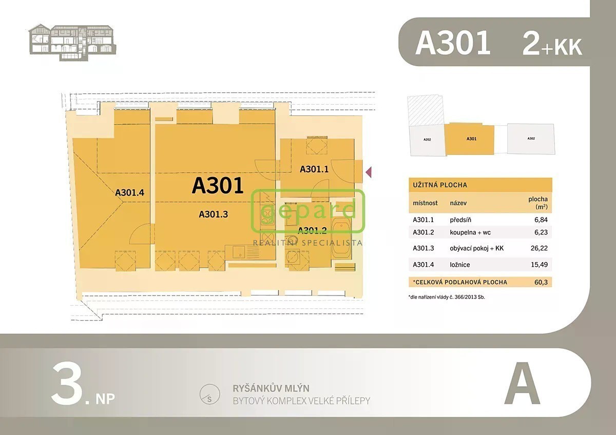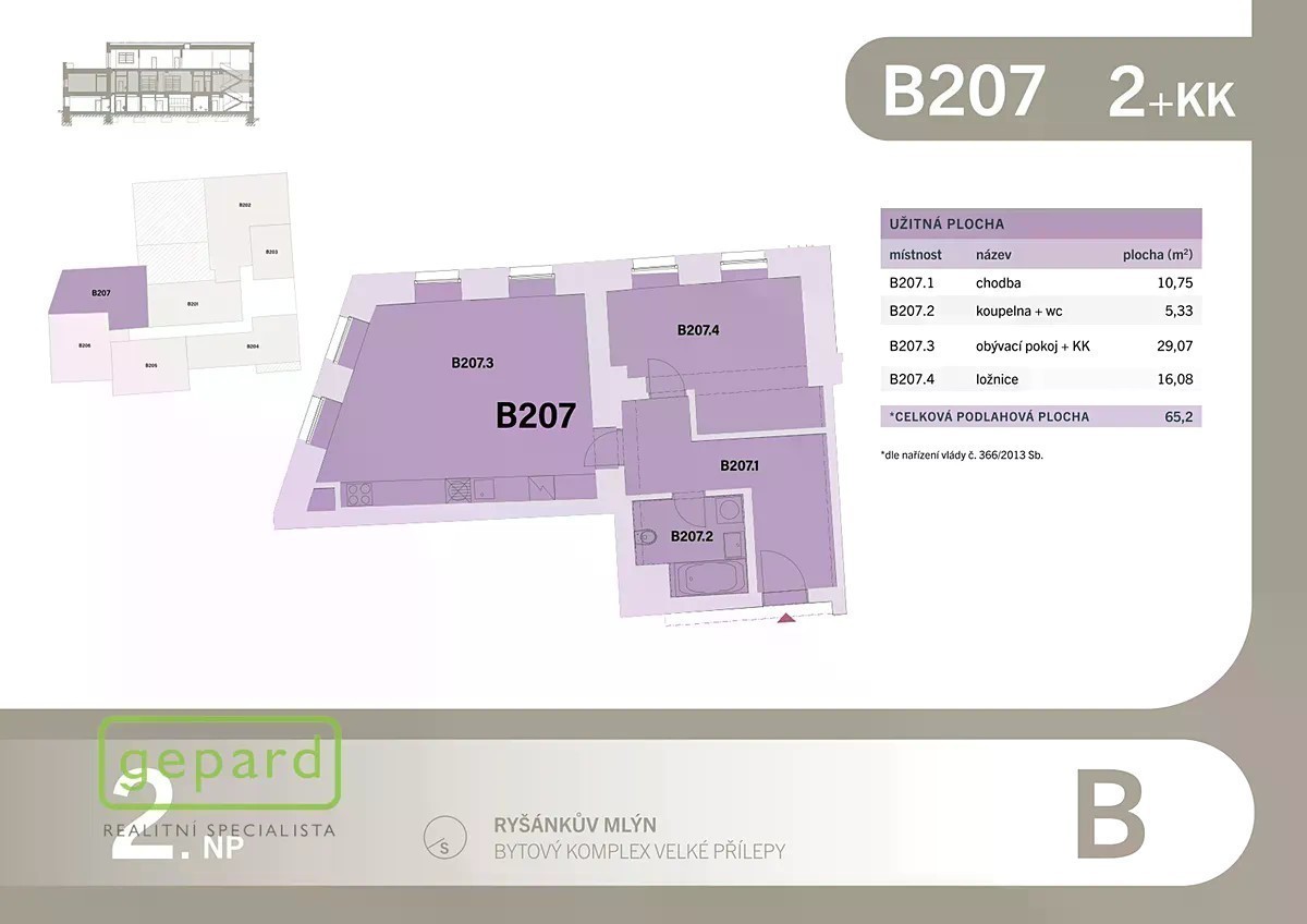 Realitní společnost Gepard nabízí k prodeji byt v OV 2+kk, 58m2, se zahradou 41m2 (byt č. B103) v developerském projektu Ryšánkův mlýn ve Velkých Přílepech vzdálených od Prahy pouhých 6km a 15min autem. Byty v budově B jsou dokončené ve vysokých standardech jako např. plasto-hliníková okna v budově B, podlahy 1.NP vinylové, 2. a 3.NP třívrstvé dřevěné podlahy v barvě dubu, byty jsou vybaveny kvalitní kuchyňskou linkou se spotřebiči Elektrolux a osvětlením, obojí v ceně. Vytápění je zajištěno společnou plynovou kotelnou v budově. K dispozici je venkovní parkovací stání za 224.000Kč. Budova je zkolaudovaná. Projekt Ryšánkův mlýn zahrnuje dvě zrekonstruované budovy propojené společným vchodem. Původní stavba z 19. století disponuje devíti byty s maximálně možným zachováním dobových prvků od 1kk po 3kk. Druhá budova v industriálním stylu nabízí 16 bytů. Jsou zde i byty se zahrádkou, terasou nebo balkonem. Všechny byty mají sklepní kóji. Velké Přílepy disponují plnou občanskou vybaveností, spojení MHD na metro Bořislavka a Dejvická. Podlahová plocha je uvedená dle nařízení vlády č. 366/2013Sb, tzn. včetně příček. Pro klienty tohoto projektu zajistíme výhodné podmínky financování a případný prodej Vaší stávající nemovitosti. Sjednejte si prohlídku a využijte možnosti výběru bytu ve zcela novém projektu.