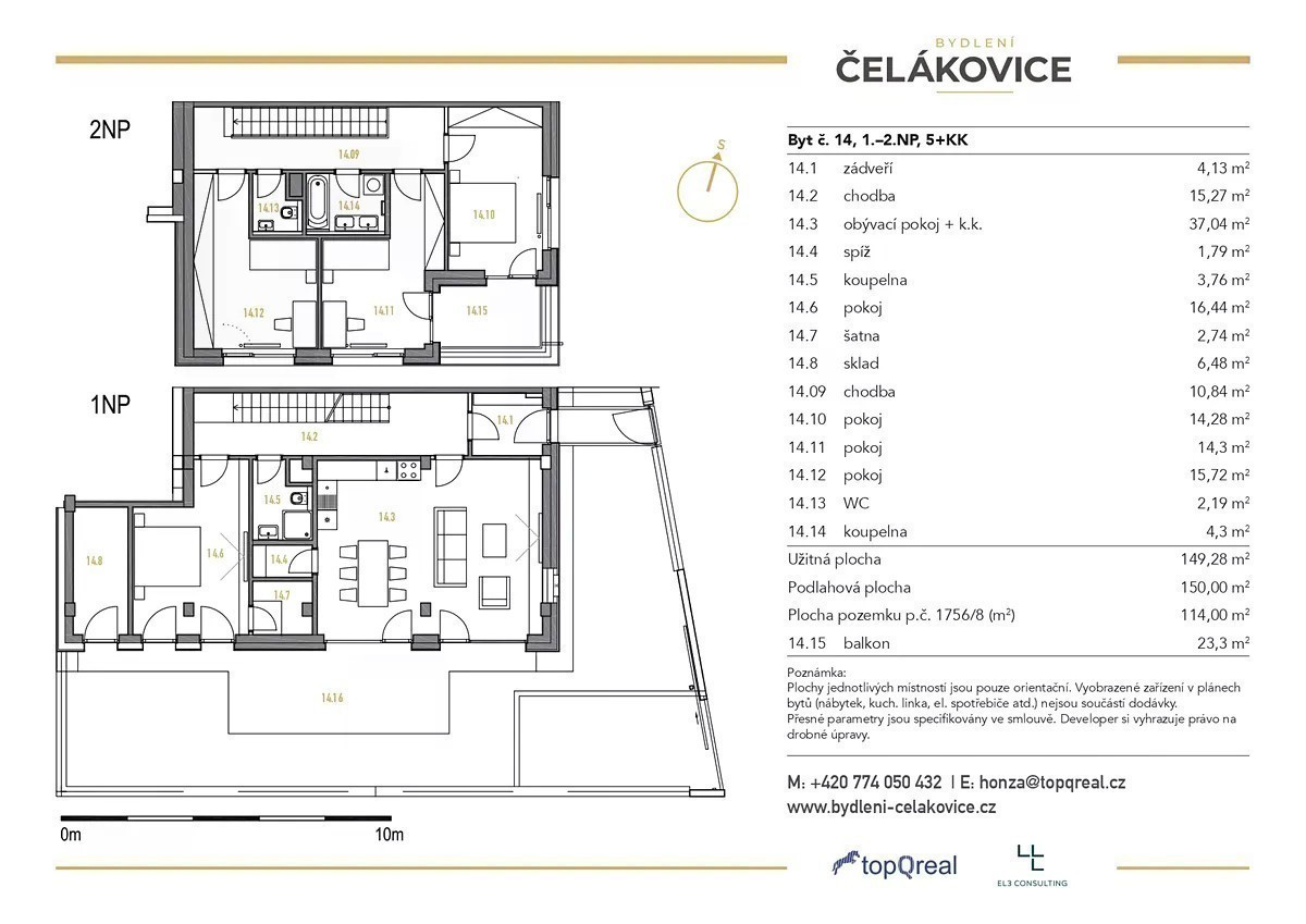 Zlevněno o jeden milion! Nabízíme Vám unikátní mezonetový byt 5+kk, 150,0 m² s předzahrádkou 114,0 m² a balkónem 23,3 m² v 1. patře, v kompletně zrevitalizované administrativní budově Kovohutí v Čelákovicích v těsné blízkosti železniční stanice Čelákovice-Jiřina. Byt se nachází v 1. a ve 2. nadzemním podlaží přístavby administrativní budovy. Ze zádveří se vstupuje do chodby, kterou se dostanete jednak do velkorysého obývacího pokoje s kuchyňskou linkou, koupelny se sprchovým koutem a WC a ložnice se samostatnou šatnou, tak do horního patra bytu. Zde se nachází druhá koupelna s vanou, samostatné WC a tři prostorné pokoje, přičemž ze dvou pokojů je přístup na veliký rohový krytý balkón. Bytový dům navazuje přímo na stávající obytnou zástavbu, která disponuje veškerou občanskou vybaveností. V rámci projektu je realizováno celkem 29 bytových jednotek o dispozici 1+kk až 5+kk, z nichž každá disponuje balkónem nebo předzahrádkou. V ceně tohoto bytu je zahrnuta sklepní kóje i parkovací stání. Čelákovice jsou atraktivní lokalita pro bydlení, podnikání i aktivní odpočinek, rozkládají se u Labe asi 27 km severovýchodním směrem od Prahy. Velkou předností Čelákovic je vlakové dopravní spojení s centrem hlavního města, kam se dostanete za 30 minut. Autem je Praha dostupná po dálnici D11 nebo D10. Čelákovice nabízejí, kromě již zmíněné veškeré občanské vybavenosti, nadstandardní volnočasové vyžití s řadou sportovních areálů, cyklostezek, dětských hřišť, mají krásné historické centrum, ve kterém najdete spoustu možností kulturního a společenského vyžití. V roce 2022 byla na Labi dokončena realizace přístaviště pro malá vodní plavidla. V případě zájmu nás neváhejte kontaktovat. Prodej přímo od developera.