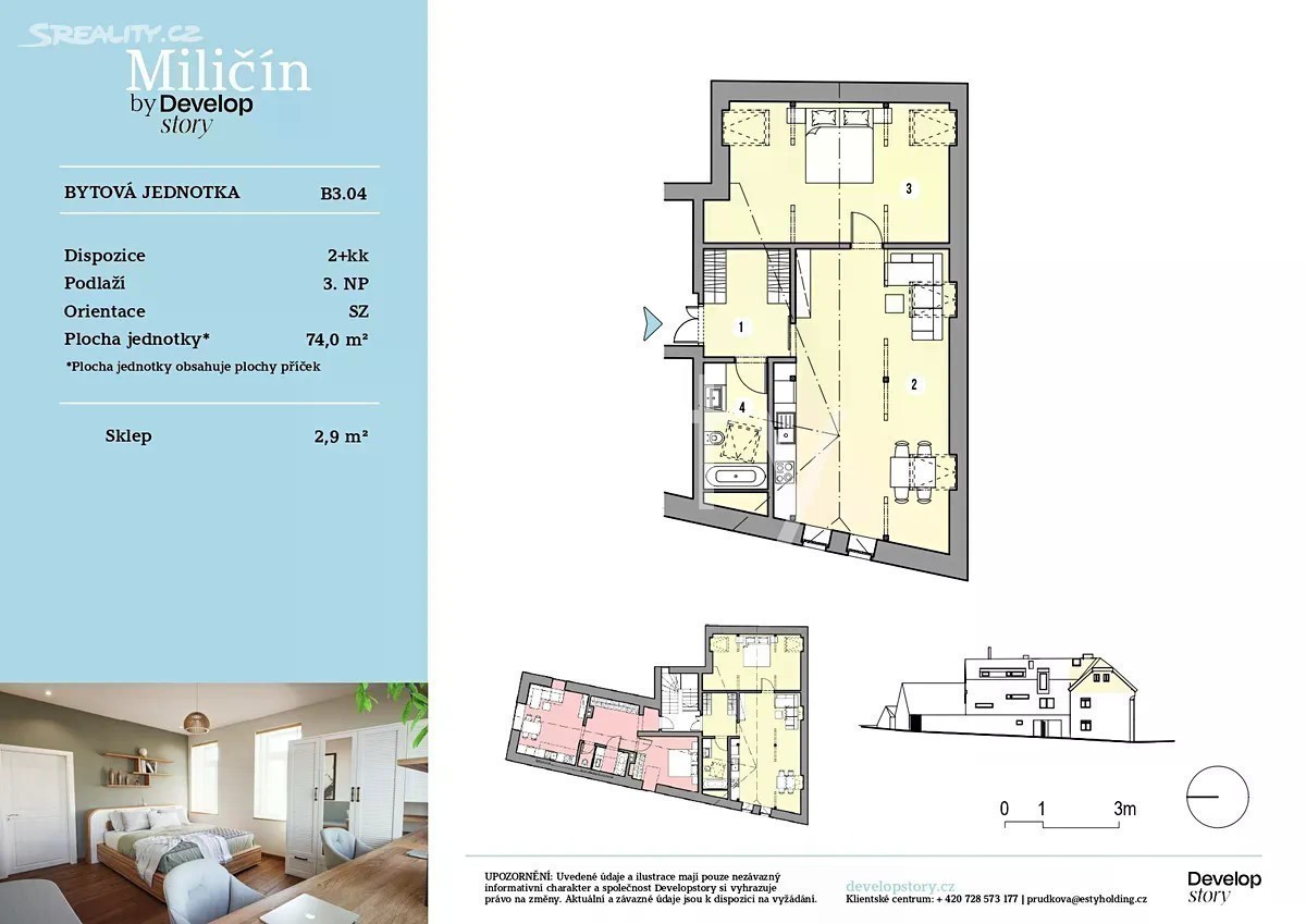 V srdci české sibiře Vám nabízíme byt 2+kk v nově vzniklém bytovém projektu ve městě Miličín, okres Benešov. Bytový dům vychází ze soudobé architektury okolního rázu a stávajícího objektu a je vytvořený v souladu s okolní tradiční zástavbou. V domě je k dispozici celkem 5 bytových jednotek o velikosti 3+kk a 2+kk ve 3 nadzemních podlažích s vlastním parkovacím stáním. Nabízená jednotka 2+kk se nachází ve 3NP. Skládá se z obývacího pokoje 20,09 m2, ložnice 13,96 m2, haly 11,74 m2 a koupelny 7,7m2. Okna jednotky jsou orientována JZ. Dům je cihlový, zateplený a má ve standardech plastová okna s dvojskly. Byt je vybaven kuchyňskou linkou, která na fotkách ještě nebyla hotová. Najdete zde vinylové podlahy, keramické obklady a dlažby, elektrické podlahové vytápění a ohřev vody slouží bojler. Město Miličín disponuje základní občanskou vybaveností. V městě je mateřská a základní škola, obchod, pošta a restaurační zařízení. Kompletní občanskou vybavenost najdete v 20 km vzdáleném Táboře nebo Benešově. Bližší informace o projektu najdete na webových stránkách Developstory projekt Miličín