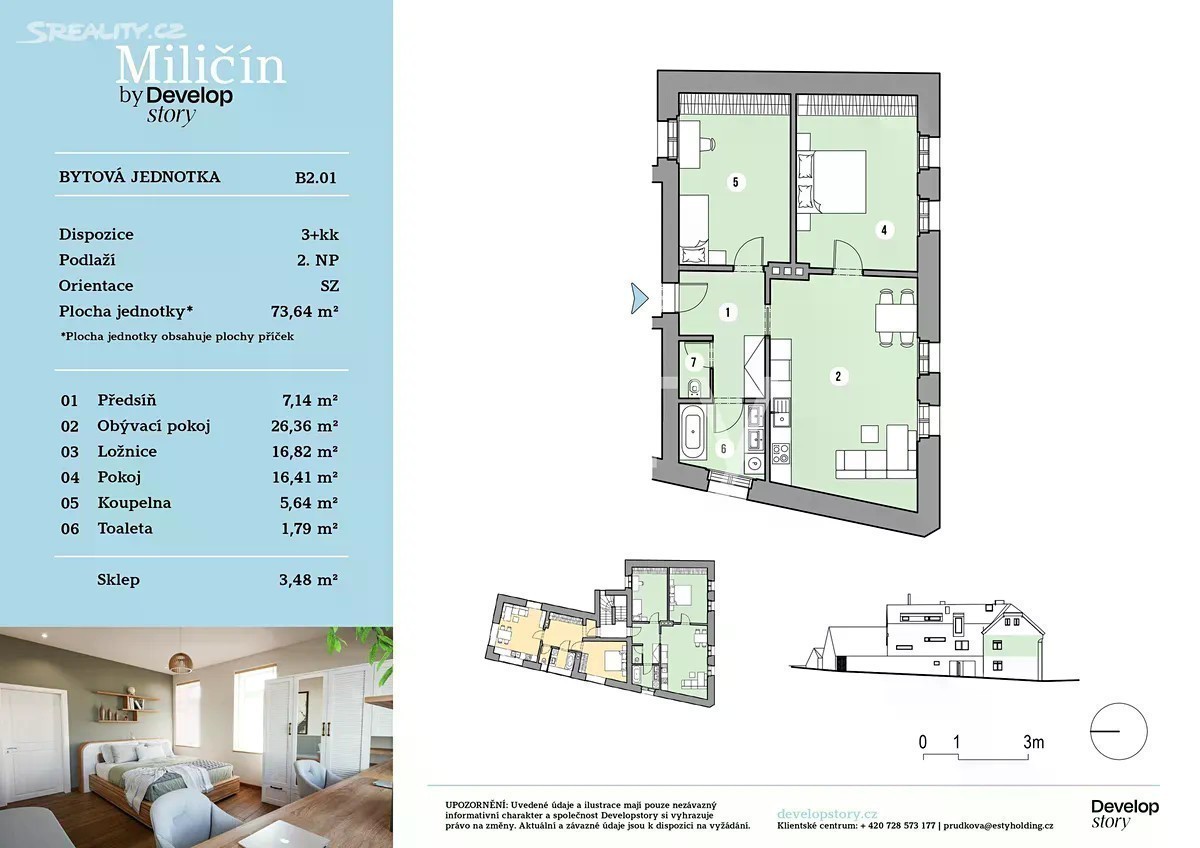 V srdci české sibiře Vám nabízíme byt 3+kk v nově vzniklém bytovém projektu ve městě Miličín, okres Benešov. Bytový dům vychází ze soudobé architektury okolního rázu a stávajícího objektu a je vytvořený v souladu s okolní tradiční zástavbou. V domě je k dispozici celkem 5 bytových jednotek o velikosti 3+kk a 2+kk ve 3 nadzemních podlažích. Nabízená jednotka 3kk se nachází ve 2NP a skládá se z předsíně 7,14 m2, obývacího pokoje 26,36m2, ložnice 16,82m2, pokoje 16,41m2, koupelny 5,64m2 a wc 1,79m2 a je orientovaná převážně na jih. Dům je cihlový, zateplený a má ve standardech plastová okna s dvojskly. V bytech pak kuchyňská linka, vinylové podlahy, keramické obklady a dlažby, elektrické podlahové vytápění a ohřev vody slouží bojler. Město Miličín disponuje základní občanskou vybaveností. Ve městě je mateřská a základní škola, obchod, pošta a restaurační zařízení. Kompletní občanskou vybavenost najdete v 20 km vzdáleném Táboře nebo Benešově. Bližší informace o projektu najdete na webových stránkách Developstory projekt Miličin.