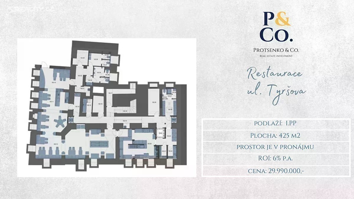 Společnost ″Protsenko & Co.″ v exkluzivním zastoupení majitele nabízí k prodeji dvě nadzemní podlaží (1PP a 1NP) činžovního domu nacházejícího se na rohu ulic Legerova a Tyršova, Praha 2 - Nové Město 1PP o ploše 425 m2 (restaurace) s kapacitou 70 míst, aktuálně v dlouhodobém pronájmu, kde ROI tvoří 6% p.a. 1NP o ploše 230 m2 (kavárna) s kapacitou 43 míst, také aktuálně v dlouhodobém pronájmu a kde ROI tvoří 4% p.a., nicméně tržní potenciál je 6% p.a. Prostory prošly nákladnou a technicky náročnou rekonstrukcí, která byla dokončena v roce 2015. Nové inženýrské sítě, vzduchotechnika, která vede na střechu, klimatizace, interiérové prosklené dveře, okna s venkovním tepelně izolačním dvojsklem, dřevěné podlahy v místnostech a dlažba v předsíních a wc. Schodiště je dřevěné a skleněné zábradlí s dřevěným úchytem. Do budovy jsou dva vstupy, jak z Legerovy ulice, tak i z Tyršovy ulice. Ulici Legerova, která je dlouhá 2 km, spojuje Nuselský most a Wilsonova ulice. Větší část ulice patří do pražské čtvrti “Nové Město”, která je 200 m od metra C, stanice I.P.Pavlova a tramvajové zastávky I.P.Pavlova. 7 min chůze jste u Porodnice u Apolináře. 225 m se konají farmářské trhy na Tylově náměstí či náměstí Míru, které je 10 min chůze. Také nesmíme zapomenout na novou budovu Národního muzea, které je pouhých 12 min chůze a známé, často navštěvované turisty Václavské náměstí a to je 10 min chůze. 30 min chůze městem, můžete zažít romantickou procházku po Vyšehradě z kterého je okouzlující výhled na Vltavu, park Folimanka nebo Havlíčkovy sady. V případě spolupráci s naši RK, kromě kouzelné nemovitosti, vždy dostanete zdarma: - konzultační servis - jazyková vybavenost (mluvíme česky, anglicky, francouzsky, italsky) - právnický servis od AK Hafner & Partneři - servis daňové amortizace - analýzy trhu