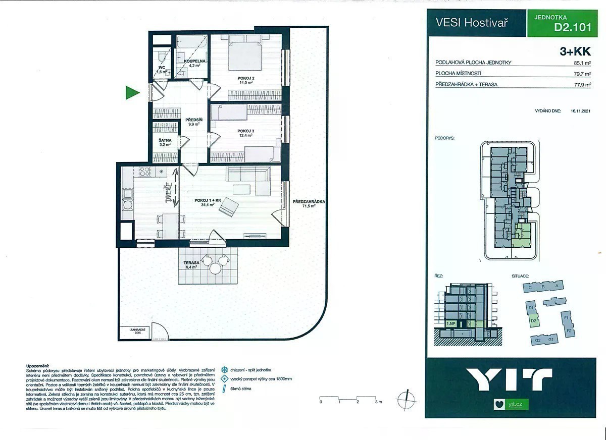 Prodej jedinečné, světlé apartmánové jednotky o dispozici 3 + 1 (na LV psáno jako jiný nebytový prostor) s tím, že dle kol. rozhodnutí jde o stavbu nazvanou ubytovací areál Vesi Hostivař s apartmánovými jednotkami k dlouhodobému ubytování, v novostavbě kolaudované v září 2023 s recepcí, s jednací místností a posezením, skládající se ze 4x místností o celkové podlahové ploše 85,1 m2 (dle prohlášení vlastníka), nacházející se ve 1. podlaží novostavby ubytovacího areálu Vesi Hostivař. Jednotka orientována na jihovýchod o dispozici 3+1 a celkové vnitřní podlahové ploše 80 m2, se zahrádkou o velikosti 78 m2 s terasou 16 m2 a se sezonní zimní zahradou o velikosti 13,2 m2 (hliníková zimní zahrada od spol. Hobbytec s bezpečnostním sklem a integrovaným vývodem vody, o rozměrech 4 x 3,3 m2), komorou (sklep) umístěnou v 1. NP budovy o velikosti cca 4,2 m2 a podzemním garážovým stáním. Původně byla jednotka koncipována jako 3+kk, ale v rámci klientských změn byla developerem upravena na 3+1 tj. 4x místnosti - možnost úpravy zpět na 3+kk tj. 3x místnosti. Jednotka se skládá z předsíně s chodbou, 3x samostatných neprůchozích místností a 1x menší průchozí místnosti, oddělené od největší místnosti posuvnými dveřmi a plní funkci kuchyně, z koupelny s vanou, samostatného WC, komory a předzahrádky 78 m2. K jednotce náleží komora (sklep) 4 m2 a parkovací místo v garážích. V jednotce je instalována kompletní kuchyňská linka od spol. Ikea se spotřebiči (el. trouba s el. indukční varnou sklokeramickou deskou, digestoří a myčkou). Jednotka je provedena v nadstandartním provedení - v rámci klientských změn byly v jednotce provedeny nadstandartní úpravy jako zejména úprava na 3+1 včetně úpravy elektroinstalace a posuvných dveří, nadstandartní dlažby, obklady, dveře, zárubně, kování a sanita, provedení vinylové podlahy, zástěna v koupelně, příprava pro pergolu - betonový základ včetně podloží a včetně rozšíření terasy včetně pokládky nadstandartní dlažby na míru a obrubníků, venkovní elektroinstalace apod. V jednotce jsou instalovány 2x velké vestavěné skříně na míru a 1x skříň na míru na chodbě včetně botníku, na oknech závěsy a záclony na míru včetně konzolí a zákrytových lišt a ukončovacích prvků, dále i elektricky ovladatelné venkovní žaluzie na míru a osvětlení, v koupelně skříňka, zrcadlo, úchyty na osušky, na zahrádce 2x vývody vody a el. zásuvka, dále je domovní telefon s funkcí domácího vrátného, datová a TV zásuvka v místnostech, na WC i v koupelně ventilátor s doběhem, v místnostech fasádní větrací prostupy. Výborná dopravní dostupnost na metro C - Háje a metro A - Skalka a kompletní občanská vybavenost. Vhodné jednak pro obchodní i kancelářské účely, např. kancelář, sídlo firmy, ordinace, kosmetický salón, pro výuku jazyků a školení, provozovna, vzorkovna apod. tj. pro činnosti s poskytováním služeb méně hlučné povahy či k ubytovacím službám (celý komplex je kolaudován jako ubytovací zařízení). Autobusová zastávka Hostivařský hřbitov se nachází ve vzdálenosti cca 250 metrů. Energetická třída B - velmi úporná. Je možná koupě na firemní či hypoteční úvěr. K nastěhování dle dohody. Tuto jednotku, která svou dispozicí i standardem vybavení plně odpovídá standartním bytům, pouze z důvodu možností funkčního využití pozemků nelze označit jako byt. K ceně nutno připočítat + DPH 21 %. Plátci si mohou nárokovat zpět odpočet DPH v plné výši. Výhodou je však i fakt, že lze mít na této adrese i trvalý pobyt pro fyzické osoby, neboť je v komplexu 1x jednotka kolaudována jako bytová. Jedna z mála jednotek o dispozici 3+1 v novostavbě. Ideální např. pro spojení bydlení s podnikáním. Kamerový systém u recepce, u vjezdu a vchodu, vjezd přes závoru na čip, možnost venkovního parkování v komplexu pro návštěvy. Ideální poloha v rámci tohoto projektu, orientace do vnitrobloku i s částečným výhledem na les, jde o velmi světlou jednotku s polohou, která zaručuje velkou světlost v jednotce a zároveň i velkou bezpečnost (na rozdíl od mnoha jednotek v tomto projektu, orientovaných na les). Ve vnitrobloku se nachází soukromé dětské hřiště - ideální pro rodinu s m