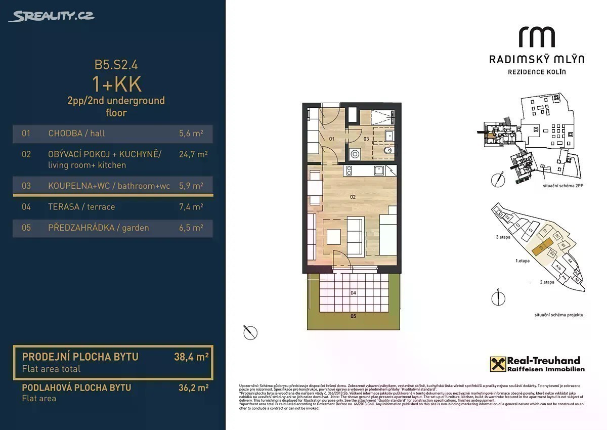 Nabízíme Vám ke koupi byt 1kk s terasou (předzahrádkou) v unikátním projektu Radimský mlýn v Kolíně. Byt je orientován na jih a má jedinečný výhled na historické centrum města a řeku Labe. Při návrhu rezidenčního řešení lokality jsme kladli velký důraz na kvalitu architektury a respektování unikátnosti místa a jeho bohaté historie. Součástí projektu je i rekonstrukce historické budovy Radimského mlýna, rozšíření cyklostezky na nábřeží a ve spolupráci s Povodím Labe vybudování přístavního mola na řece. Poslední roky navíc naplno ukazují, že doba, kdy každý z nás musel být přítomen v zaměstnání pět dní v týdnu, nejspíš jednou provždy končí. Inspirovali jsme se proto v nedalekých západních metropolích - Mnichově či Frankfurtu - a připravili pro vás bydlení v konkurenceschopné dojezdové době do Prahy s využitím vlaku i vlastního auta, tak jak je v zahraničí zcela běžné. Aktuálně je ve výstavbě I. etapa projektu (prostřední domy B), která zahrnuje 104 bytů a ateliérů s dispozicemi 1kk - 4kk. Naprostá většina bytů má prostorný balkon, terasu či předzahrádku. Ke každému bytu je možné dokoupit sklep a parkovací stání v podzemní garáži. Kolaudace I. etapy je aktuálně naplánována na 2. kvartál roku 2026. V případě, že máte zájem dozvědět se o projektu více a být jeho součástí, neváhejte se obrátit na našeho prodejce.