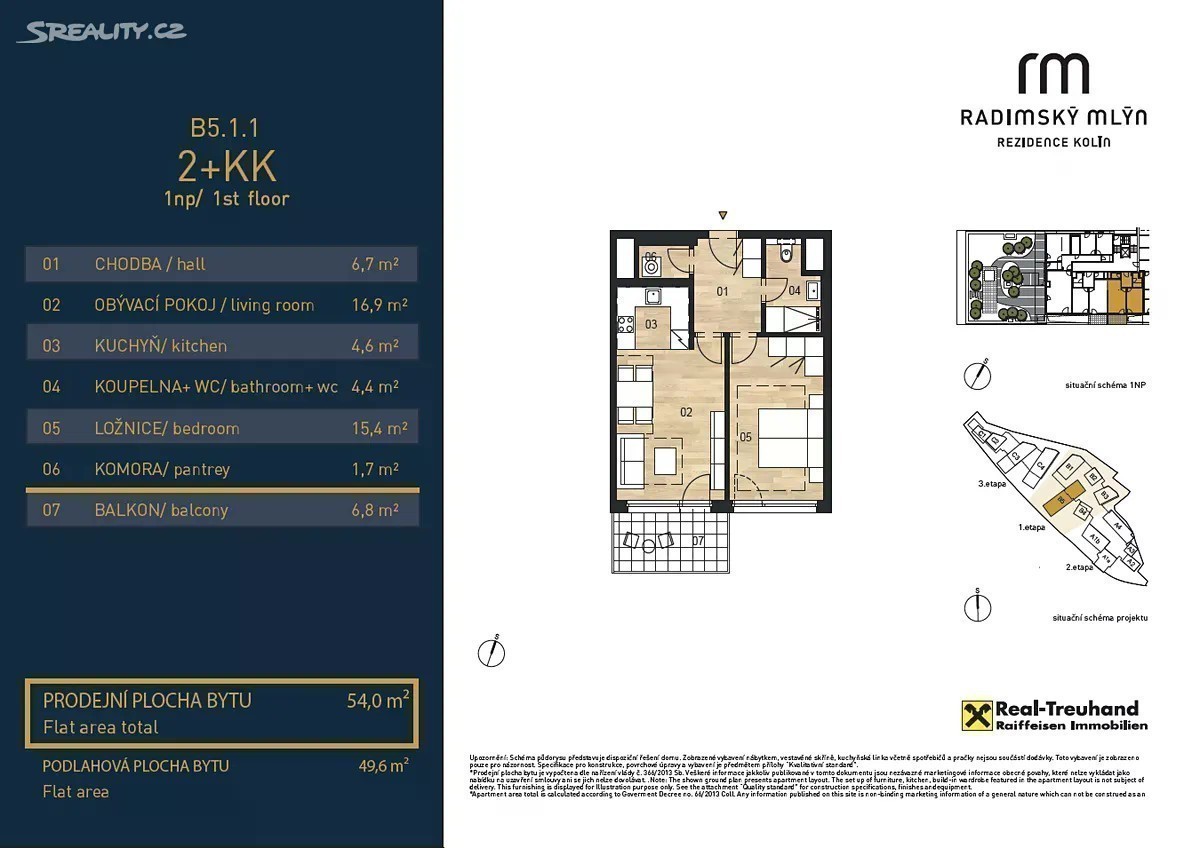 Nabízíme Vám ke koupi byty v unikátním projektu Radimský mlýn v Kolíně. Poloha a rozloha Radimského mlýna je neopakovatelná. Nachází se v bezprostřední blízkosti historického centra města na nábřeží nejdelší české řeky Labe. Jedinečné tak budou i výhledy, které se budoucím obyvatelům nabídnou každý den. Při návrhu rezidenčního řešení lokality jsme kladli velký důraz na kvalitu architektury a respektování unikátnosti místa a jeho bohaté historie. Součástí projektu je i rekonstrukce historické budovy Radimského mlýna, rozšíření cyklostezky na nábřeží a ve spolupráci s Povodím Labe vybudování přístavního mola na řece. Poslední roky navíc naplno ukazují, že doba, kdy každý z nás musel být přítomen v zaměstnání pět dní v týdnu, nejspíš jednou provždy končí. Inspirovali jsme se proto v nedalekých západních metropolích - Mnichově či Frankfurtu - a připravili pro vás bydlení v konkurenceschopné dojezdové době do Prahy s využitím vlaku i vlastního auta, tak jak je v zahraničí zcela běžné. Aktuálně je ve výstavbě I. etapa projektu (prostřední domy B), která zahrnuje 104 bytů a ateliérů s dispozicemi 1kk - 4kk. Naprostá většina bytů má prostorný balkon, terasu či předzahrádku. Ke každému bytu je možné dokoupit sklep a parkovací stání v podzemní garáži. Kolaudace I. etapy je aktuálně naplánována na konci 2. kvartálu roku 2026. V případě, že máte zájem dozvědět se o projektu více a být jeho součástí, neváhejte se obrátit na našeho prodejce.