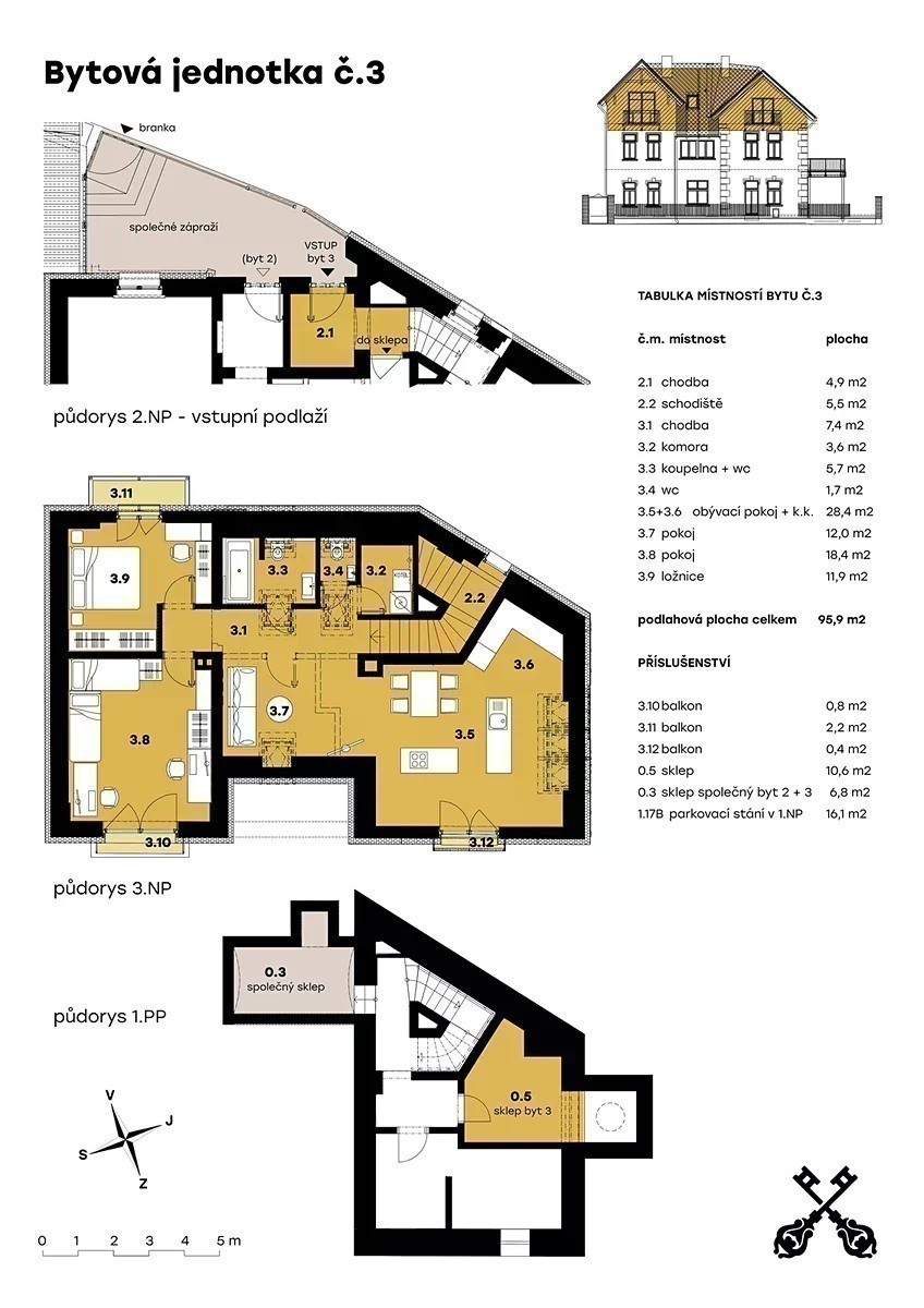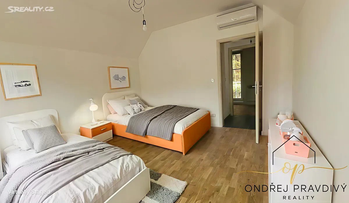 -stavba dokončena- Nabízíme k prodeji výjimečný byt 3+kk o ploše 96 m² + balkón 4 m² v historickém domě z počátku 20. století, situovaném v žádané lokalitě obci Všenory, která se vyznačuje nádhernou přírodou v okolí Berounky a Brd. Tento komorní viladům nabízí jen tři byty se samostatnými vstupy, což zaručuje příjemnou a rodinnou atmosféru. Byt se nachází v posledním 3. nadzemním podlaží a po kompletní přestavbě se může pyšnit nadstandardní kvalitou provedení a použitých materiálů. Provedení zahrnuje dřevěné plovoucí podlahy, dřevěná euro okna s trojskly, designové dlažby a nadčasové obklady. Značková sanita firem Laufen a Hansgrohe. Dále jsou datové rozvody, příprava na zabezpečení a elektromobilitu. Díky zateplení celého domu i vlastnímu kondenzačnímu kotli pro vytápění a ohřev vody budou provozní náklady skutečně příznivé. Převažující orientace na jiho-západ zajišťuje dostatek slunečního světla a stropy s přiznaným trámovím zase útulný pocit s puncem historie. Příslušenství bytu zahrnuje do zeleně orientovaný balkón, vlastní parkovací stání a prostorný sklep 11 m² na jakékoliv sportovní či sezónní vybavení. Další úložné prostory jsou v půdě nad bytem. V okolí se nachází krásné lesy a přírodní rezervace, které nabízejí možnosti pro procházky, cykloturistiku či různé sportovní aktivity. V blízkosti nemovitosti je zastávka autobusu a ani k vlakovému nádraží to není daleko. Vlakem se dostanete za 20 min na Smíchovské nádraží či do 30 min na Hlavní nádraží. Autem jste za pouhé 3 minuty na Strakonické dálnici D4 a odtud za chvíli na dálničním obchvatu či na kraji Prahy. V docházkové vzdálenosti najdete mateřskou a základní školu, lesní školku či dětské hřiště. Ve Všenorech je např. pošta, obchod, restaurace, kulturní dům či knihovna. Kompletní občanskou vybavenost, obchody a služby jsou v okolí - kavárny, supermarkety, lékaři, herny, zimní stadion, bazén, a mnoho dalšího… Tento unikátní byt v historickém viladomě, spojení s přírodou a veškerou občanskou vybaveností dělá z Všenor vyhledávanou lokalitu nejen pro rodiny s dětmi. V případě zájmu o prohlídku mne neváhejte kontaktovat.