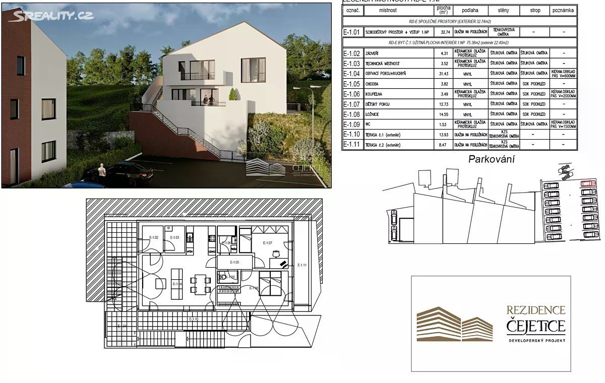 Nabízíme vám moderní byt 3+kk o podlahové ploše 75 m² se dvěma prostornou terasou (9,6 m²) a parkovacím stáním v novém projektu Rezidence Čejetice. Tento byt v novostavbě bytového domu se 2 bytovými jednotkami je ideální volbou pro pohodlný život v klidném a moderním prostředí. Popis bytu: Podlahy: Stylové vinylové podlahy v dekoru dřeva Vytápění: Řešeno tepelným čerpadlem s podlahovým vytápěním - nízkoenergetické řešení šetrné k vašim nákladům Internet: Připojení pomocí optického kabelu pro vysokou rychlost a stabilitu Příprava na předokenní žaluzie: Komfortní řešení pro stínění a soukromí Parkovací stání: Součástí bytu Výhody bydlení: Moderní novostavba: Plánované dokončení a možnost nastěhování již v březnu 2025 Lokalita: Klidné a příjemné prostředí Čejetic s výbornou dostupností do Mladé Boleslavi Komfortní bydlení: Terasy, parkovací stání a nízkoenergetické technologie Pokud potřebujete financování, rádi vám pomůžeme najít optimální řešení. V případě zájmu nás neváhejte kontaktovat.
