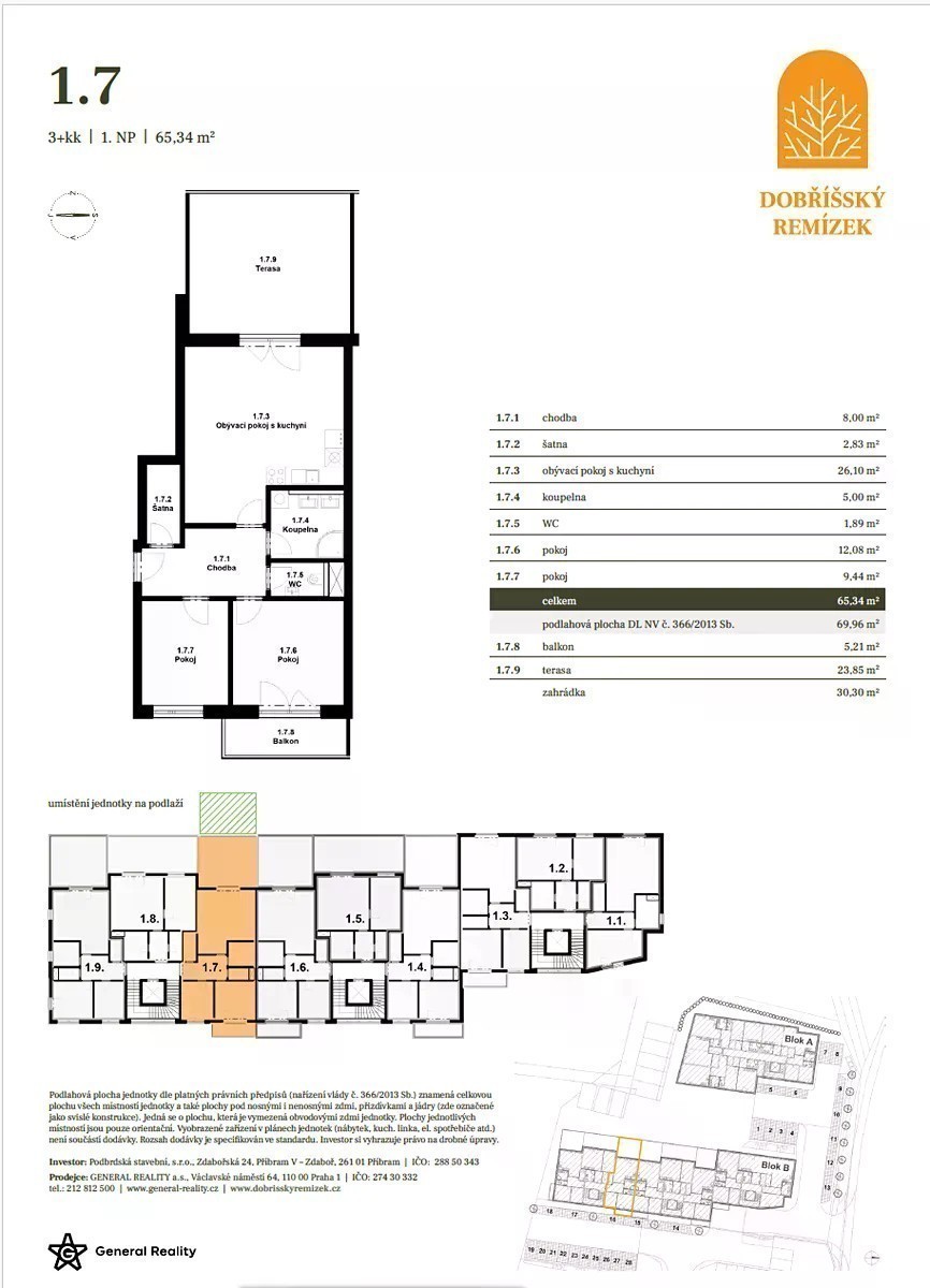 Prodáno! Již pouze jeden byt v Dobříšském remízku v nabídce! Zvolte si i vy bydlení na okraji středočeské Dobříše, kousek od lesa a na dosah Prahy. Byty jsou vhodné pro všechny co mají rádi aktivní život v přírodě, ale i pro ty co hledají klid a odpočinek. Všechny byty mají podlahové vytápění a přípravu na předokenní rolety či žaluzie. Z nabídky vybíráme jednotku 3+kk o výměře 70 m2 s terasou o výměře 23 m2, předzahrádkou o výměře 30 m2 a balkonem o výměře 5 m2, která se nachází v přízemí bytového domu. Zahrádka nabízí prostor pro relaxaci při hřejivých paprscích zapadajícího slunce. Vstup na zahrádku vede z obývacího pokoje s kuchyňským koutem. Byt nabízí také dvě ložnice, předsíň, praktickou šatnu a koupelnu a samostatné WC. Dům je pro pohodlí všech vybaven výtahem. Ohřev teplé vody a vytápění bude zajišťováno prostřednictvím tepelného čerpadla. K jednotkám nabízíme venkovní parkovací stání a sklep. Město Dobříš nabízí veškerou občanskou vybavenost, od škol a školek, přes obchody, restaurace, lékaře, sportoviště, kulturní akce atd. Nenechte si ujít tuto příležitost, zavolejte si nebo napište o detailní informace k dalším nabízeným bytům v projektu Dobříšský Remízek.