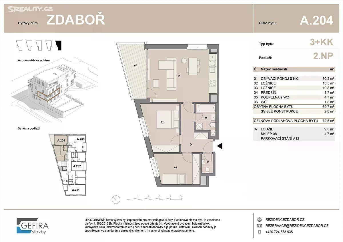 Dovolujeme si Vám nabídnout k prodeji jednopodlažní byt 3+kk v právě vznikající bytové výstavbě Rezidence ZDABOŘ v klidné části města Příbram. Bytový projekt je ve výstavbě a nabízí moderní bydlení s plánovaným datem dokončení v roce 2026. Byt se nachází v 2. podlaží první čtyřpodlažní budovy, která je vybavena výtahem a je plně bezbariérová, což je ideální pro osoby se sníženou pohyblivostí nebo pro rodiny s dětmi v kočárku. Dispozice bytu 3+kk zahrnuje velkorysou podlahovou plochu. K bytu náleží také sklep. Bytové jednotce je vyhrazeno garážové stání (nutno dokoupit), zajišťující pohodlné parkování přímo v objektu. Byt se nachází v blízkosti důležitých dopravních spojení, jako je vlak, dálnice, silnice, MHD a autobus. Toto umístění umožňuje jednoduché a rychlé cestování do centra města i do širšího okolí. Tento byt bude připraven k nastěhování v roce 2026, což vám poskytuje dostatek času na naplánování a zařízení bydlení podle vašich představ. Pokud Vás byt zaujal, neváhejte nám napsat nebo zavolat. Prohlídky jsou možné po předchozí domluvě.