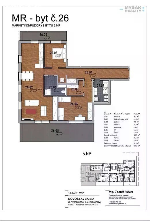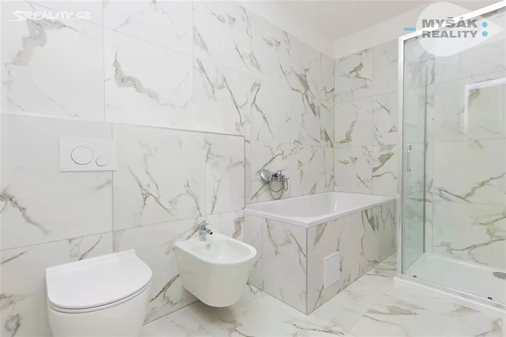 Kladno, to je to město! Možná vám to tak nepřipadá, ale bydlení v Kladně je jedna z nejchytřejších věcí, co můžete udělat. Za polovinu pražské ceny dostanete nadstandardní 3+kk, které má vše co ke spokojenému životu potřebujete a navíc s jistotou, že každých 15 minut jede vlak a autobus do Prahy, kde jste už za 30 minut. Pořád váháte? Byt se nachází v posledním (čtvrtém) patře novostavby z roku 2022, je koncipovaný jako 3+kk s čistou podlahovou plochou 110 m2, má 2 velké terasy (28 a 10 m2), dvě koupelny, šatna, technická místnost a garážové stání. To vše na celkové užitné ploše 148 m2 a při jeho realizaci se opravdu nešetřilo. Pojďme se na to podívat podrobněji. Vnitřní členění bytu je přesně jak má být, chytře řešené, účelné i reprezentativní, dotažené do detailu. Srdcem bytu je 43 m2 velký obývací pokoj, s kuchyňskou linkou s dostatečnou pracovní plochou, značkovými vestavěnými spotřebiči (myčka, trouba, indukční deska), vše chytře řešené a v nadčasovém designu. Vzdušnost a přirozené světlo pokoji dodávají velká okna (vše připraveno na instalaci venkovních rolet) a vstupy na obě terasy. Obě ložnice jsou neprůchozí a mají velkorysou výměru (20 a 11 m2). Ložnice mají vlastní vstup na terasu a jsou opatřeny kvalitní klimatizací. Skvělou velikost mají i obě koupelny (6 m2). Už žádné ranní stresy, při frontě na koupelnu. Obě jsou vybaveny toaletou (jedna má i bidet) a také konec věčného dilematu jestli je lepší vana či sprcha. V jedné koupelně je vana i prostorný sprchový kout a druhá koupelna je vybavena další sprchou. Úložné prostory řeší technická místnost, členitá šatna (4 m2) a niky na vestavěné skříně. Velkolepým finále bytu jsou obě terasy - ta větší (28 m2) otočena na slunný jih, ta menší (10 m2) naopak na severm Terasy díky své šířce budou skvělým místem pro soukromá setkání s přáteli, ranní jógu, pěstování bylinek a večerní skleničku a víkendová grilování. Moderní trendy bydlení - dřevěné vinylové podlahy, přiznané betonové stropy, klimatizace, designové interiérové dveře, moderní svítidla, mramorové obložení koupelen, optické datové kabely. Kvalitně postavený dům je zaměřen na energetickou úspornost odpovídající označení „B“. Přístup do domu je bezbariérový, dům je vybaven moderním výtahem, k bytu naleží jedno garážové stání. S ohledem na bezpečnost rezidentů a jejich majetku je areál vybaven kamerovým systémem a elektronickým vrátným. V zájmu vyšší kvality pitné vody je dům vybaven vlastní úpravnou vody. Dům má vlastní plynovou kotelnu a u bytu je instalován systém vytápění Meibes. K dispozici je také společná kolárna. Pokud by vám i toto bylo málo je možné dokoupit další garážové stání. V ceně bytu je možné využívat střechu jako další terasu ( 150m2). Měsíční poplatky činí 5.000,- Kč včetně fondu oprav. Nabízený byt se nachází v Kročehlavech, té nejlepší kladenské čtvrti, kde je právě zmiňovaná vlaková zastávka a za ní rozlehlý lesopark, dále školy, školky, pošta a obchody. Doporučujeme osobní prohlídku.