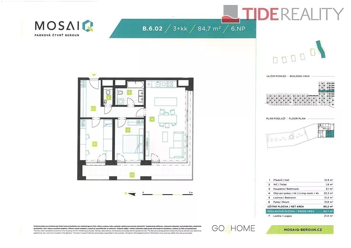 Bydlete v zeleni, v klidné části Berouna! Dokončení 2027. Jednotka 3+kk o podlahové ploše 85 m2 + lodžie 21 m2 se nachází v domě s věží, který je ústřední budovou komplexu, na níž navazuje sestava příjemných čtyřpatrových domů v zeleni. Tato jednotka je situuována v 6. nadzemním podlaží a má krásný ničím nerušený výhled. Tento jihozápadně orientovaný byt tvoří prostorný obývací pokoj s kuchyňským koutem o rozloze 33 m2, 2 ložnice, koupelna, předsíň a dvě toalety. Každý z pokojů má přístup na terasu s jedinečným výhledem! Standardní vybavení bytů zahrnuje plovoucí podlahy, interiérové dveře s výškou 210 cm, moderní vybavení koupelen, okna s barevným rámem a izolačním trojsklem, přípravu na vnější žaluzie. V bytech budou moderní datové rozvody formou strukturované kabeláže a přípojka STA. V projektu bude využita smart technologie pro vytápění, která pracuje se dvěma tepelnými zdroji - tepelnými čerpadly a zemním plynem. Dostatečná kapacita parkovacích míst převážně v podzemních garážích, ale i venku. Kombinace moderní architektury, kvalitních materiálů a propojení interiéru s venkovním prostorem dělá z bytu skutečně výjimečné místo pro život. Velkoryse koncipovaný soubor bytových domů umístěných v zeleni nabídne široké rozpětí bytů od 1+kk po 5+kk s terasami, balkony či předzahrádkami. Novou obytnou čtvrť ohraničují ulice Na Máchovně a Na Morákově, domy vyrůstají v mírném svahu, který se zdvihá k vrcholu Děd. Užijte si bydlení v blízkosti hlavního města s kompletním zázemím města Beroun a Křivoklátskem za humny. Obytný soubor MOSAIQ Beroun navazuje na stávající obytnou čtvrť jejíž součástí jsou i sportovní centra Eden, koupaliště Laguna a také tréninkové centrum fotbalové mládeže. V těsné blízkosti naleznete obchody, školy a školky. Beroun je skvělá lokalita v blízkosti hlavního města s přímým dopravním spojením do centra Prahy. Díky nedaleké dálnici jste na hranici metropole za méně než čtvrt hodiny. Vybírejte z pestré nabídky bytů a kontaktujte mě pro více informací, nebo si domluvte osobní schůzku v naší pražské kanceláři.
