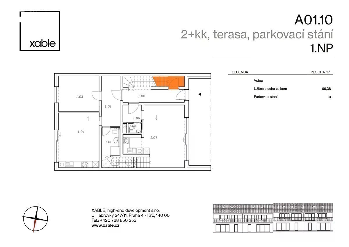 Zveme Vás na prohlídku rozestavěného domu v sobotu ********* hodin. V rámci II. etapy výstavby projektu v ulici Nová v Kouřimi Vám nabízíme byt A01.10, 3+kk v 1. a 2. NP / podkroví, s plochou bytu 69 m2 a terasou o výměře 18 m2. Všechny nabízené byty jsou cihlové, energetická třída B, velmi úsporné. Při výstavbě je kladen důraz na kvalitní provedení. Byty jsou v rozmezí 48 m2 až 95 m2. Ke každému bytu je v ceně parkovací stání na vlastním pozemku, zahrada nebo terasa. Každý byt má vlastní vodoměr a elektroměr. Standardy zahrnují plastová okna s trojskly, v obývacím pokoji je otevírání na posun, veškeré místnosti mají podlahové vytápění, některé vnitřní dveře jsou také na posun do pouzdra. Na konečné podobě bytů se můžete v průběhu výstavby sami podílet a byt tak bude dokončen Vám přímo na míru. Z parkovacího stání je možné postavit garáž. V Kouřimi je plnohodnotná občanská vybavenost - MŠ, ZŠ, ZUŠ, městský úřad, stavební úřad, praktičtí lékaři, gynekolog, veterinář. Je zde možnost nakoupit v různých obchodech na náměstí a v přilehlých ulicích. Ke sportování je možné využít jak rozmanitého terénu v okolí Kouřimi, tak je k dispozici sportovní hala, lehkoatletický stadion, fotbalové hřiště, tenisové kurty a 18ti jamkové golfové hřiště. Vše v docházkové vzdálenosti od bytu. Praha, Kolín, Český Brod, Čáslav, Kutná Hora, Sázava, Říčany jsou obslužné prostřednictvím PID. Vzdálenost do Prahy Černý most - 38 km. V rámci služeb nabízíme vyřízení hypotéky.