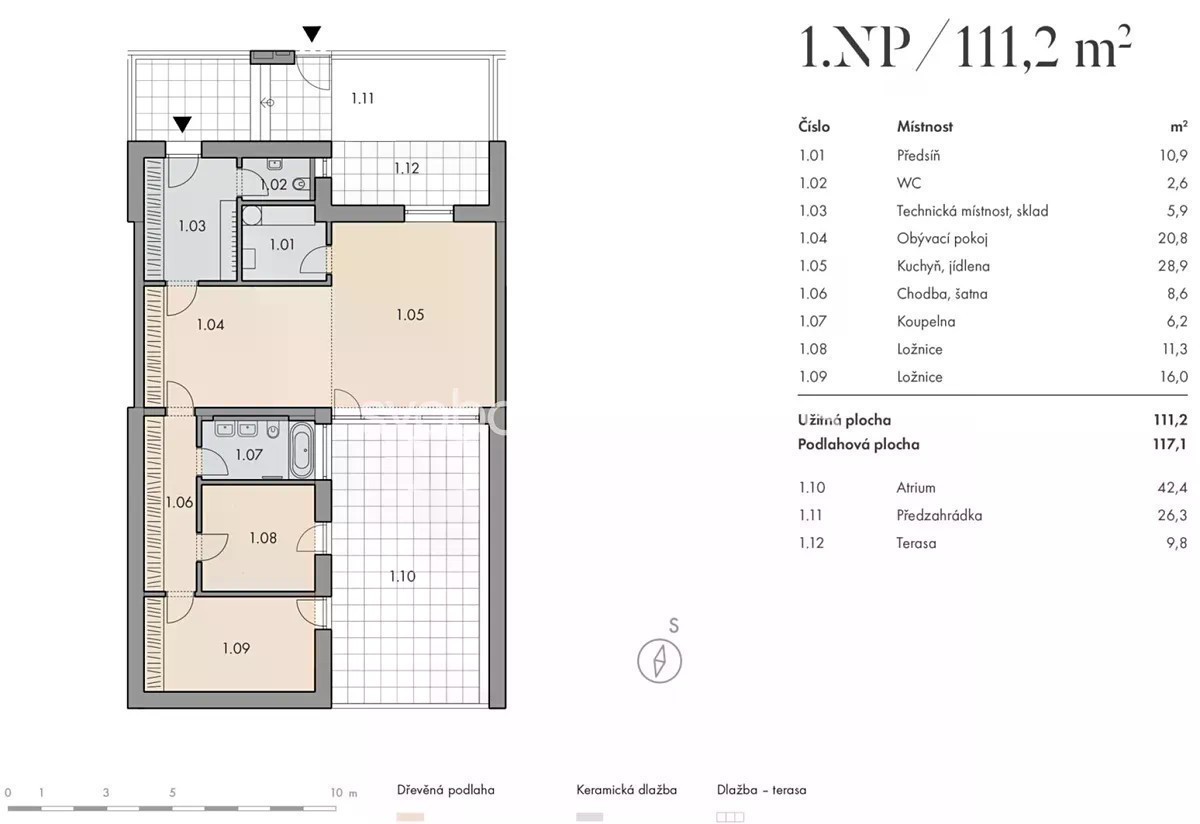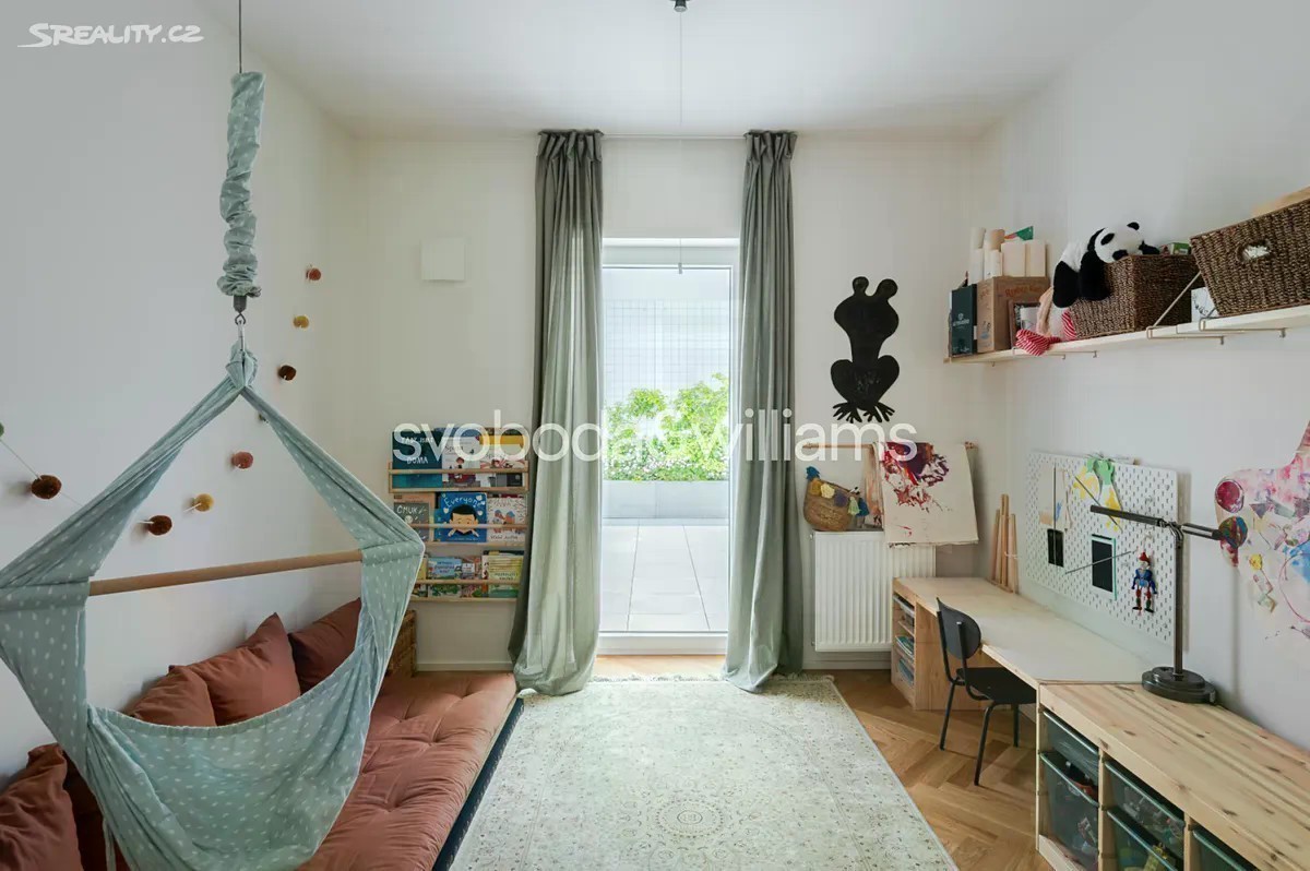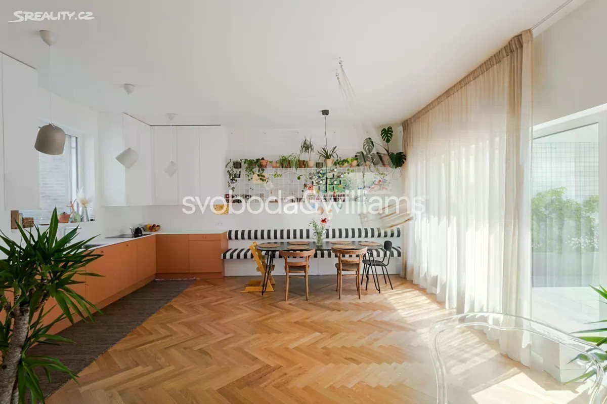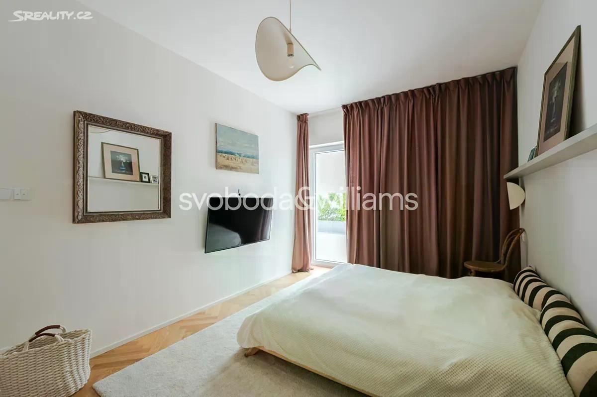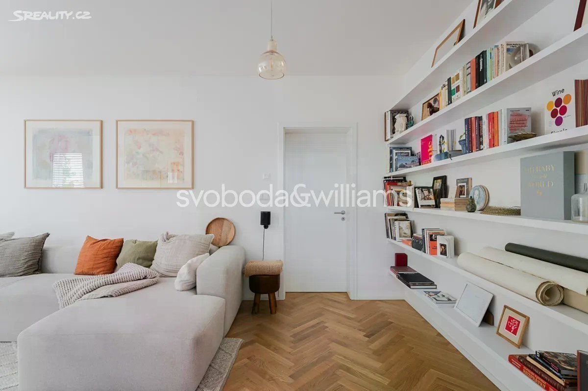 Vkusně zařízený a velmi světlý řadový dům, kolaudovaný jako bytová jednotka s předzahrádkou, dvěma terasami, sklepem a parkováním, tvoří součást moderního rezidenčního komplexu Zátiší Lysolaje. Žádaná lokalita vhodná pro rodinné bydlení v tichém a bezpečném prostředí s výbornou dostupností jak do centra města, tak na Letiště Václava Havla. Interiér se skládá z prostorného obývacího pokoje propojeného s jídelnou a kuchyňským koutem, 2 ložnic, technické místnosti, koupelny s vanou, samostatné toalety, chodby s vestavěnými skříněmi a předsíně. Ze všech obytných místností vede přímý vstup na terasu. Kuchyňský kout nabízí výhled do oplocené předzahrádky. Cena zahrnuje i prostorný sklep a 2 garážová stání umístěná v jeho bezprostřední blízkosti. Součástí vybavení jsou kvalitní dubové podlahy, plastová okna s trojskly a předokenními žaluziemi, nábytek na míru, kuchyňská linka s vestavěnými spotřebiči, podlahové topení v koupelně, rekuperační jednotka a kamerový systém. Vytápění obstarává plynový kotel. Jižně orientovaná terasa s panoramatickým výhledem na Přírodní rezervaci Divoká Šárka si udržuje svěží zeleň díky samozavlažovacím truhlíkům a zelená střecha přispívá k tepelné stabilitě bytu. Bydlení v Lysolajích spojuje to nejlepší z městského komfortu a klidného života v přírodě. Pár minut pěší chůze vede do přírodní rezervace Housle nebo k Lysolajskému biotopu. Milovníky aktivního životního stylu potěší síť cyklostezek, sportovní areál Denkrova pískovna i fitness centrum Spartan Gym, vše v dochozí vzdálenosti. V místě je kompletní občanská vybavenost: mateřská škola, Základní škola Járy Cimrmana, knihovna, areál ČZU či oblíbený Bufet Bar Octopus. Dopravní obslužnost zajišťují autobusové linky ke stanici metra Dejvická, zastávka se nachází přímo u komplexu. Výbornou alternativou je železniční spojení ze stanice Praha-Podbaba, odkud se již od srpna cestující dostanou na nově zrekonstruované nádraží Praha-Bubny v centru města. Celková plocha 170,1 m2, z toho dvě terasy 53,5 m2, předzahrádka 26,3 m2, sklep 12,9 m2.