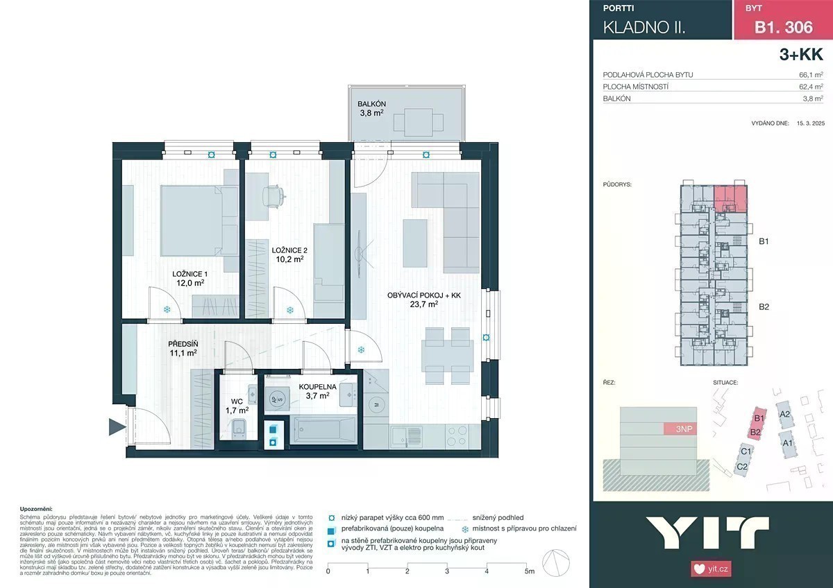 Byt 3+kk o celkové rozloze 70,5 m² s balkónem 4,3 m² je situován v 2.NP projektu PORTTI Kladno II. Cena zahrnuje bytovou jednotku, sklepní kóji a DPH. (K bytu patří i parkovací stání, které není zahrnuto v ceně. ) V rámci našeho prvního mimopražského projektu PORTTI Kladno II nabízíme nové byty v Kladně na prodej. Ve dvou moderních bytových domech vznikne celkem 102 bytů o dispozicích 1+kk až 4+kk a rozloze od 28 m² do 99 m², k nimž budou náležet balkony, terasy či předzahrádky. V parteru vybudujeme rovněž dvě komerční jednotky. V každém bytovém domě bude umístěna kočárkárna a venkovní místo pro mytí kol a psů. Samozřejmostí jsou sklepy a parkovací stání ve vnitřních krytých garážích, jejichž střechy pokryje zeleň. K dispozici bude také venkovní parkování.