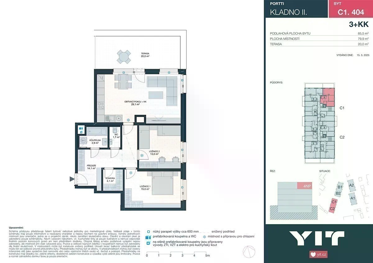 Byt 3+kk o celkové rozloze 82 m² s balkónem 4,3 m² a terasou 31 m² je situován v 4.NP projektu PORTTI Kladno II. Cena zahrnuje bytovou jednotku, sklepní kóji a DPH. (K bytu patří i parkovací stání, které není zahrnuto v ceně. ) V rámci našeho prvního mimopražského projektu PORTTI Kladno II nabízíme nové byty v Kladně na prodej. Ve dvou moderních bytových domech vznikne celkem 102 bytů o dispozicích 1+kk až 4+kk a rozloze od 28 m² do 99 m², k nimž budou náležet balkony, terasy či předzahrádky. V parteru vybudujeme rovněž dvě komerční jednotky. V každém bytovém domě bude umístěna kočárkárna a venkovní místo pro mytí kol a psů. Samozřejmostí jsou sklepy a parkovací stání ve vnitřních krytých garážích, jejichž střechy pokryje zeleň. K dispozici bude také venkovní parkování.