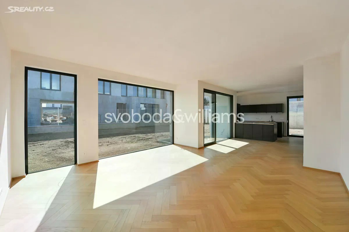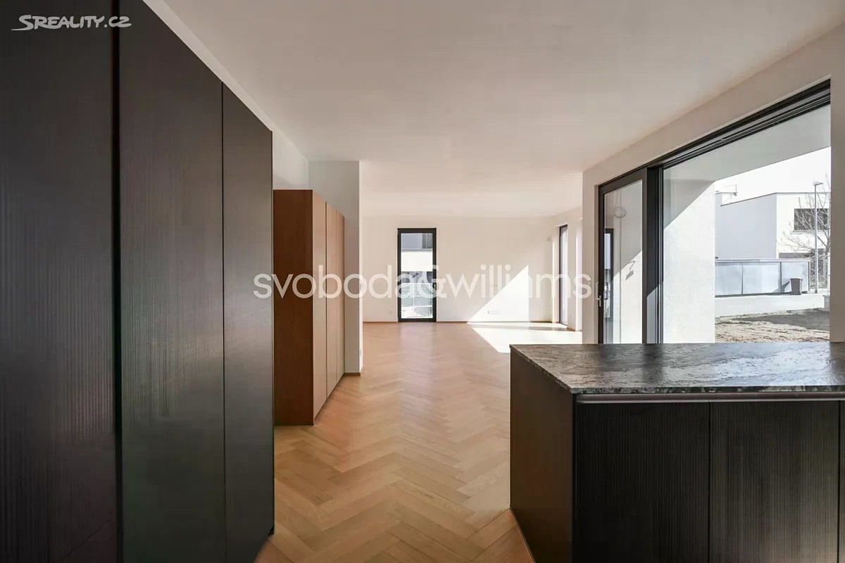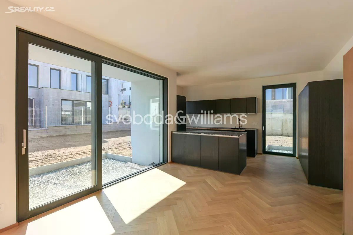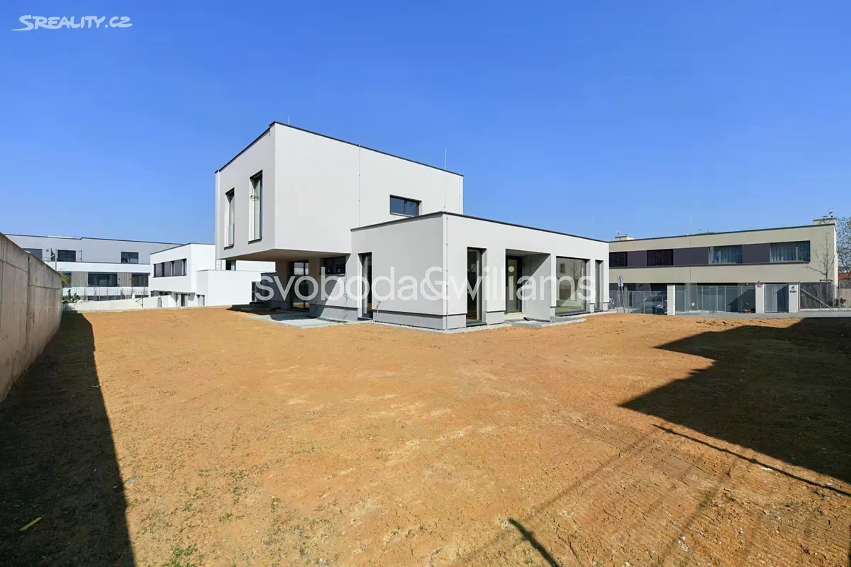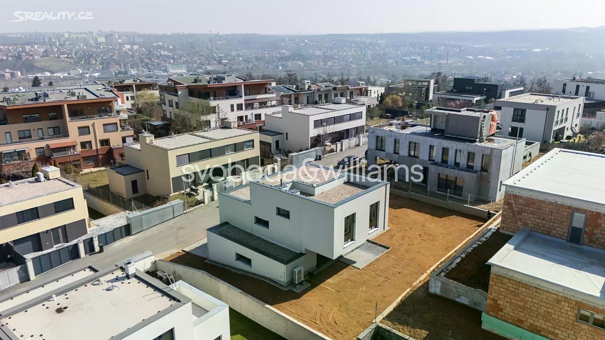 Novostavba nadčasové vícegenerační vily se světlým a vzdušným interiérem je součástí nové obytné čtvrti zasazené do velmi klidného a zeleného místa přímo u Radotínsko-Chuchelského háje. Z nejvyššího patra domu, jenž byl dokončen ve vysokém standardu, se nabízí krásný výhled do okolí. Ve vstupní úrovni se nachází schodišťová hala se šatnou, zádveří a garáž s přímým vstupem do domu a do technické i úložné místnosti. O půl patra výš je situována hlavní obytná část, kterou tvoří jihozápadně orientovaný otevřený prostor pro obývací pokoj, jídelnu a kuchyni, odkud je možné vstoupit na 2 terasy. V mezipatře je umístěna ložnice s koupelnou a šatnou a 2. ložnice. Další poschodí je věnováno 2. obývacímu pokoji s kuchyní, ložnicí a koupelnou, nejvyšší úroveň může sloužit jako dětský pokoj či pracovna. Nízkoenergetická stavba má hliníková okna, vchodové dveře i HS portál (posuvné dveře) s izolačními trojskly, švýcarským teplým nekovovým meziskelním rámečkem a trojitým těsněním. Prvotřídní vybavení domu zahrnuje dřevěné podlahy, dřevěné bezfalcové interiérové dveře, kuchyňskou linku německého výrobce Nolte s pracovní deskou z indické žuly, koupelny v nadstandardním provedení s italskou velkoformátovou dlažbou, sprchovými kouty Hüppe, vanou Villeroy & Boch a bateriemi Hansgrohe, dále podlahové vytápění/chlazení napojené na tepelné čerpadlo Wolf, rekuperaci a přípravu na klimatizaci. V garáži jsou 2 parkovací místa, další stání je na zpevněné ploše před domem. Příjemná poloha obklopená přírodním parkem, v krátké dojezdové vzdálenosti ke všem službám. Mateřská a základní škola jsou vzdálené do 5 minut autem, dopravní spojení zajišťují autobusy, kterým se lze dostat k chuchelskému nádraží nebo ke stanici metra Smíchovské nádraží. Celková plocha 303,8 m2 (z toho garáž 43,2 m2, terasy 16,6 m2 a 12,9 m2), zastavěná plocha 231,6 m2, zahrada 541,4 m2, pozemek 773 m2.