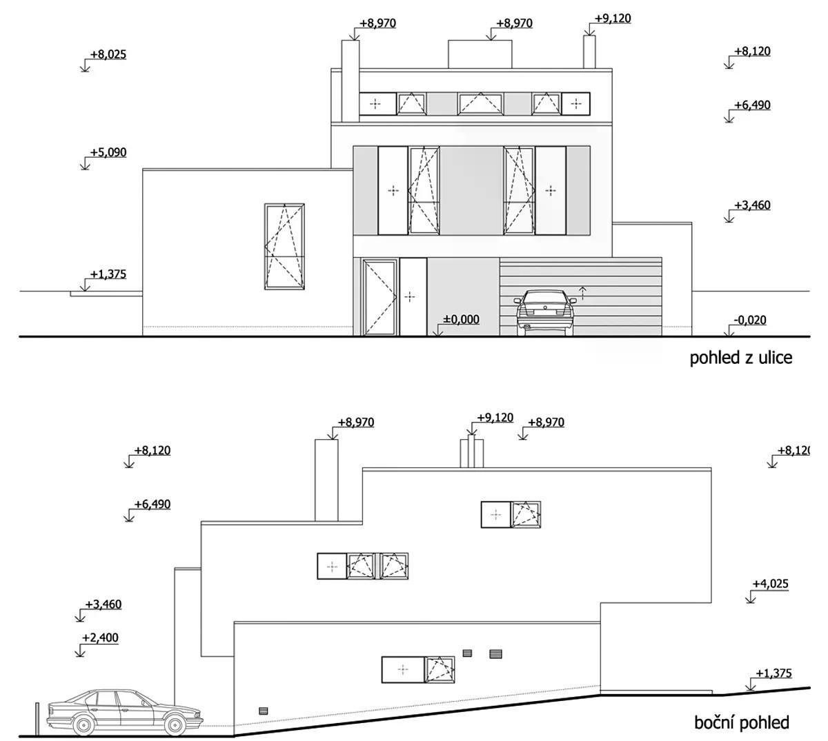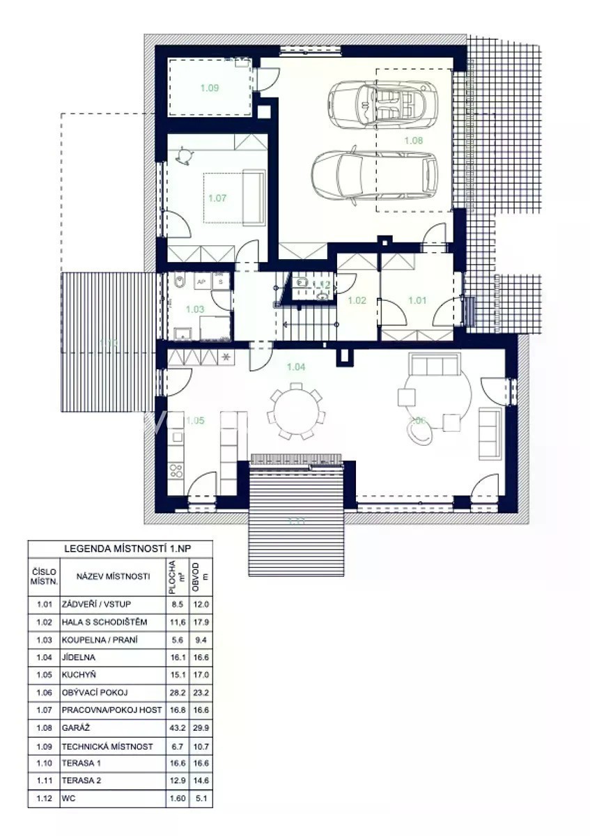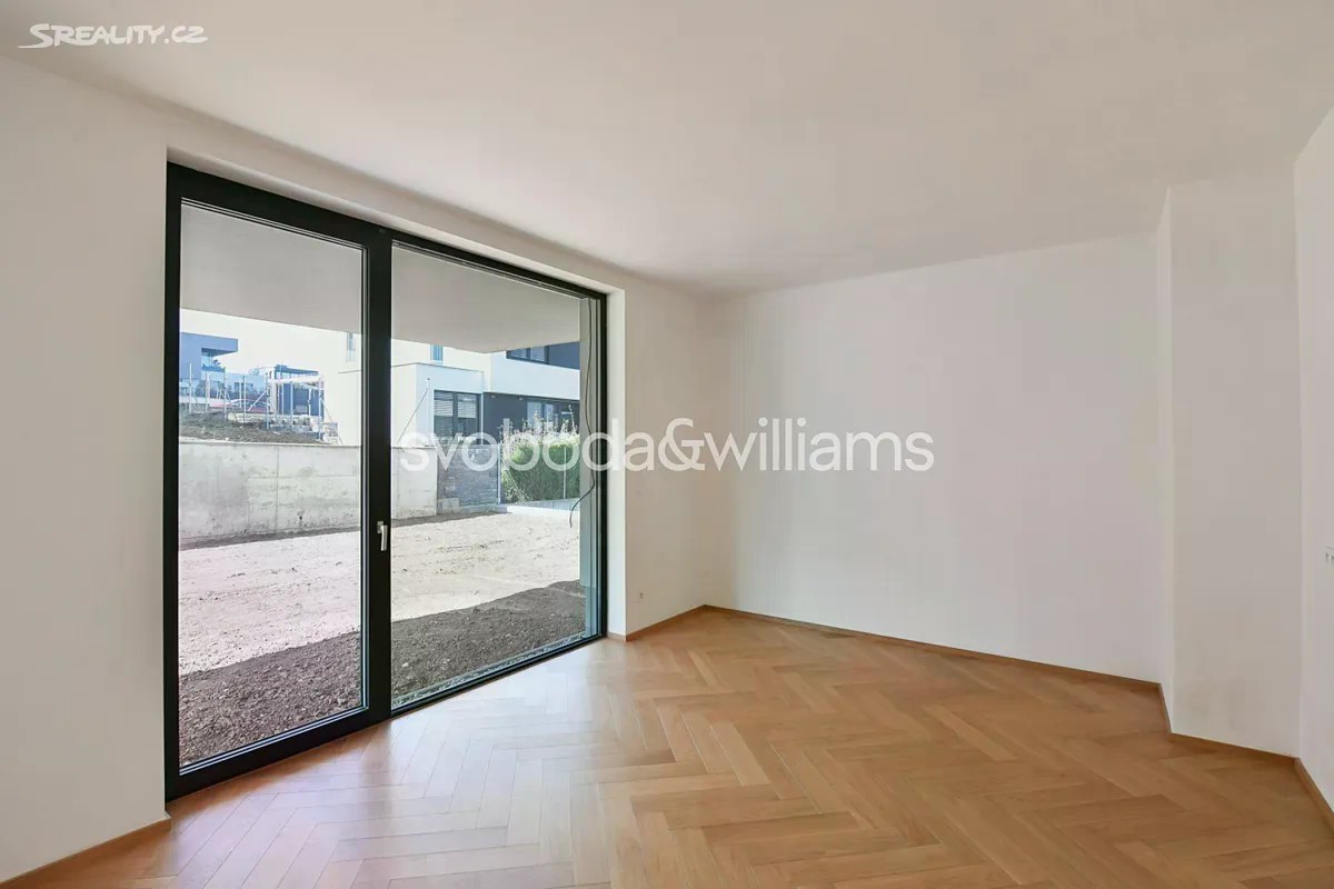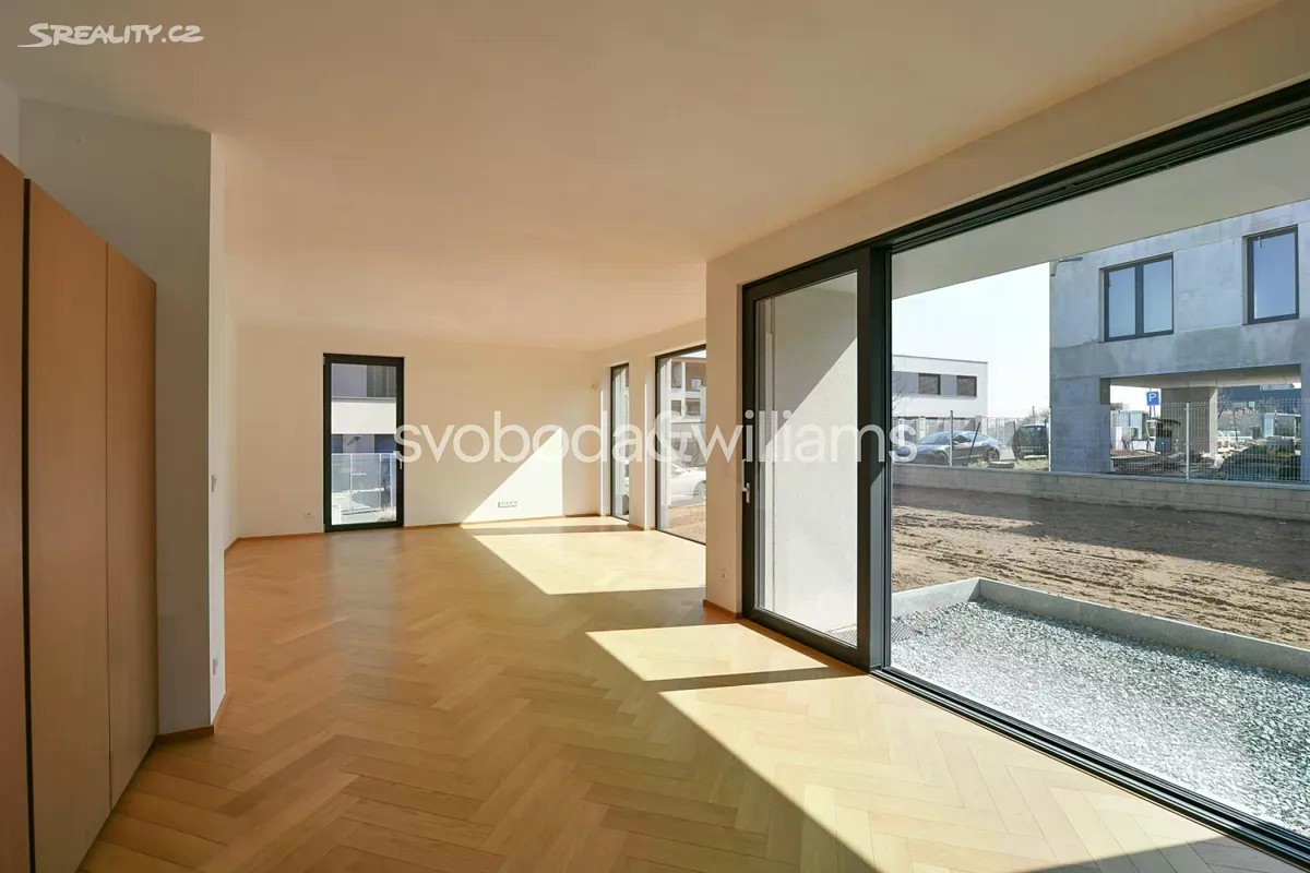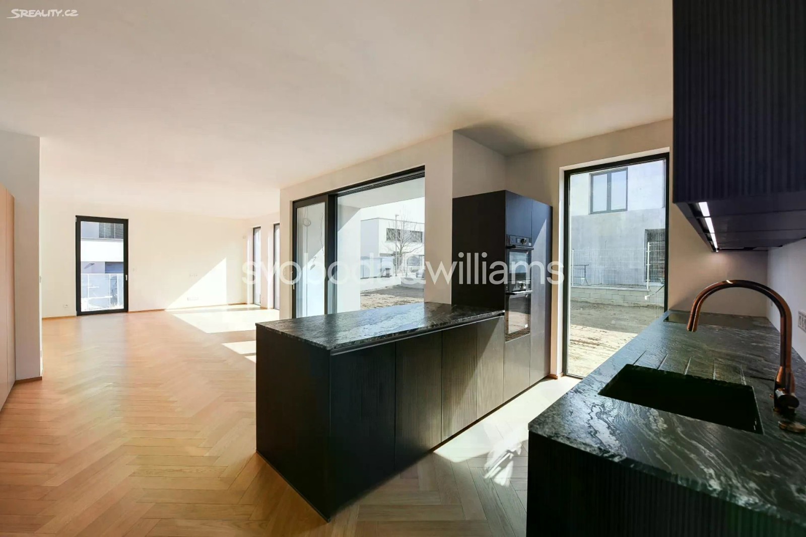 Novostavba nadčasové vícegenerační vily se světlým a vzdušným interiérem je součástí nové obytné čtvrti zasazené do velmi klidného a zeleného místa přímo u Radotínsko-Chuchelského háje. Z nejvyššího patra domu, jenž byl dokončen ve vysokém standardu, se nabízí krásný výhled do okolí. Ve vstupní úrovni se nachází schodišťová hala se šatnou, zádveří a garáž s přímým vstupem do domu a do technické i úložné místnosti. O půl patra výš je situována hlavní obytná část, kterou tvoří jihozápadně orientovaný otevřený prostor pro obývací pokoj, jídelnu a kuchyni, odkud je možné vstoupit na 2 terasy. V mezipatře je umístěna ložnice s koupelnou a šatnou a 2. ložnice. Další poschodí je věnováno 2. obývacímu pokoji s kuchyní, ložnicí a koupelnou, nejvyšší úroveň může sloužit jako dětský pokoj či pracovna. Nízkoenergetická stavba má hliníková okna, vchodové dveře i HS portál (posuvné dveře) s izolačními trojskly, švýcarským teplým nekovovým meziskelním rámečkem a trojitým těsněním. Prvotřídní vybavení domu zahrnuje dřevěné podlahy, dřevěné bezfalcové interiérové dveře, kuchyňskou linku německého výrobce Nolte s pracovní deskou z indické žuly, koupelny v nadstandardním provedení s italskou velkoformátovou dlažbou, sprchovými kouty Hüppe, vanou Villeroy & Boch a bateriemi Hansgrohe, dále podlahové vytápění/chlazení napojené na tepelné čerpadlo Wolf, rekuperaci a přípravu na klimatizaci. V garáži jsou 2 parkovací místa, další stání je na zpevněné ploše před domem. Příjemná poloha obklopená přírodním parkem, v krátké dojezdové vzdálenosti ke všem službám. Mateřská a základní škola jsou vzdálené do 5 minut autem, dopravní spojení zajišťují autobusy, kterým se lze dostat k chuchelskému nádraží nebo ke stanici metra Smíchovské nádraží. Celková plocha 303,8 m2 (z toho garáž 43,2 m2, terasy 16,6 m2 a 12,9 m2), zastavěná plocha 231,6 m2, zahrada 541,4 m2, pozemek 773 m2.