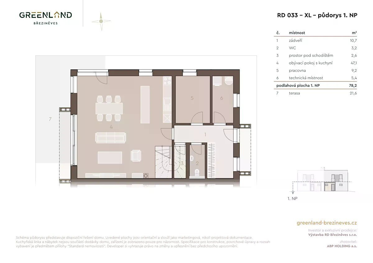 Dům s označením RD 33 je součástí unikátního rezidenčního projektu Greenland Březiněves v pražské Březiněvsi, který nabízí bydlení v dvojdomech nebo samostatných vilách rozmanitých dispozic a velikostí, maximálně respektující soukromí svých obyvatel. Dům velikosti XL má dispozice 5 + kk, užitnou plochu 161 m² a náleží k ní pozemek o rozloze 394 m². Předností domu jsou skvěle řešené dispozice. V přízemí je velkorysý obývací pokoj s kuchyňským koutem, pracovna, toaleta a technická místnost či pokoj pro návštěvy. V prvním patře je master bedroom se šatnou a koupelnou a další dva pokoje umístěné na opačnou stranu patra, čímž poskytují všem potřebné soukromí. Ve všech domech jsou HS portály propojující obývací prostor s terasou a zahradou, které zajišťují dostatek denního světla a pocit volného prostoru. Ve standardním vybavení je podlahové vytápění, skla s izolačním trojsklem, retenční nádrž, příprava na krb a příprava pro venkovní žaluzie. Každý z domů má až dvě vlastní parkovací stání s pohodlným vjezdem z ulice. Benefitem celého projektu je použití moderních řešení a kvalitních materiálů již ve standardním vybavení. Domy jsou navíc navrženy v energetické třídě B - úsporná stavba, což jejich vlastníkům přinese výrazně nižší provozní náklady. Přijďte se podívat do VZOROVÉHO DOMU a posoudit sami výjimečnou atmosféru bydlení.