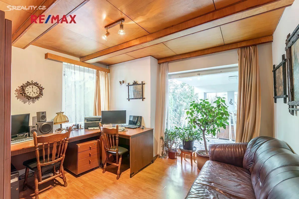 V pražském Radotíně, jedné z nejlepších lokalit pro bydlení, nabízíme skvělý rodinný dům z 80. let. Zajímavá stavba nabízí promyšlenou dispozici, dvě obytná podlaží a je také částečně podsklepena. Velkou výhodou je možnost plnohodnotného dvougeneračního užívání se samostatnými vstupy. Dům je ve velmi dobrém stavu, technicky v pořádku, proběhla v něm výměna podlah a obkladů, položení zámkových dlažeb kolem domu a průběžně dochází ke kultivaci zahrady. První podlaží nabízí samostatný vstup s chodbou do centrální místnosti, z níž je příčkou oddělena pracovna, kuchyni, ložnici, koupelnu s WC, vstup do sklepa a do garáže, ze které lze snadnou úpravou vybudovat další obytnou místnost. Ve druhém podlaží přístupném z odděleného centrálního schodiště najdeme pohodlný byt 5+1. Skládá se z chodby, kuchyně se spíží, šatny, 3 pokojů, jídelny, obývacího pokoje a koupelny s odděleným WC. Většina místností je propojena s exteriérem lodžií, velká okna zajišťují dostatek světla. Sklep překvapí dalším prostorem, je zde k dispozici odpočinková místnost s krbem, toaleta, prádelna, sklad potravin a kotelna. O vytápění domu se stará elektrický kotel, topení lze přepojit i na starší kotel na tuhá paliva, který slouží jako záložní. Plyn je na hranici pozemku také k dispozici. Zahrada je udržovaná ve skvělém stavu, její osázení vzrostlými stromy a keři zajišťuje dostatek soukromí. Obývací pokoj ve 2.NP příjemně zakrývá terasu nacházející se na pozemku pod ním, další posezení je za domem. Na pozemku je místo pro pohodlné parkování 3 aut. Radotín nabízí svým obyvatelům opravdu kompletní vybavenost, najdete zde školu, školky, gymnázium, velké množství sportovišť včetně koupaliště (Biotop Radotín) a krytého bazénu, obchody, lékárny, kino. Kousek od domu stojí autobus místní okružní linky pražské MHD. Autem je to do centra 25 minut, na letiště 20 minut. Bydlení v Radotíně, to je život v přírodě a současně s veškerým komfortem města.