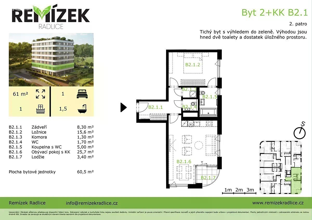 AKČNÍ NABÍDKA: 2+kk byt s garážovým parkovacím stáním v ceně! Představujeme jihovýchodně orientovaný byt 2+kk o velikosti 62 m², který kombinuje komfort, praktičnost a dostatek světla. Lodžie bytu nabízí výhled do okolní zeleně a zástavby. Obývací pokoj je propojen s místem pro kuchyňskou linku a díky oknům na jih a východ působí vzdušně a svěže. Součástí bytu jsou úložné prostory ve vstupní hale, v obytných místnostech i v samostatné komoře s přípojkou na pračku. Ložnice disponuje vlastní koupelnou se sprchovým koutem, umyvadlem a toaletou, další samostatná toaleta s umyvadlem je dostupná ze vstupní haly. Byt je vhodný pro všechny, kteří hledají klidné, světlé a praktické bydlení s dostatkem úložného prostoru a komfortní dispozicí. Garážové parkovací stání je v ceně.
