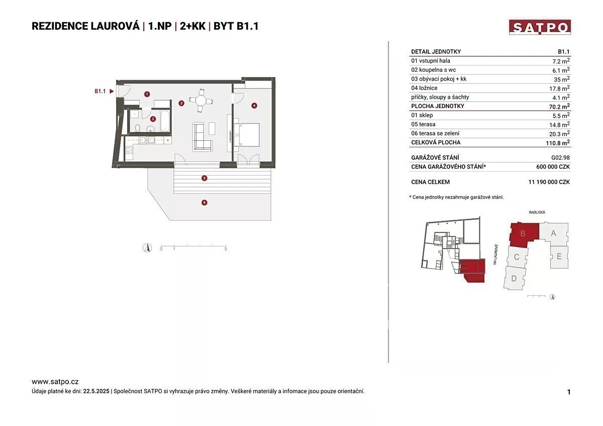 Hledáte výjimečný prostor, kde se snoubí velkoměstský styl s klidem a soukromím? Představujeme vám netradiční byt 2+kk s velkou terasou se zelení v 1. NP moderní novostavby Rezidence Laurová v atraktivní lokalitě Prahy 5 - Smíchov. Elegantní bydlení, kde se budete probouzet s výhledem do zeleně, a přitom jen pár minut od centra. Architektonicky výjimečný dům s propracovanými detaily a službami na úrovni moderního městského života právě vzniká v lokalitě s duchem i perspektivou. Nabízí celkem 123 bytových jednotek s dispozicemi 1+kk až 5+kk a také 8 komerčních prostor. Nachází se mezi ulicemi Radlická a Na Laurové. Jedná se o jedinečnou a vyhledávanou oblast, kde se prolíná příroda, zázemí pro sport, nákupy i společenský život. Nabízí klidné prostředí pro relaxaci, přesto i vynikající dostupnost centra a dalších důležitých lokalit hlavního města. Už na jaře 2027 bude připravený vám zajistit nadčasové bydlení ve vysokém standardu. Celková užitná plocha bytu včetně terasy se zelení a sklepa je 110,8 m2. Byt tvoří obývací pokoj s přípravou na kuchyňský kout o výměře 35 m2 se vstupem na terasu orientovanou na jih do klidného vnitrobloku. Dále ložnice - rovněž se vstupem na terasu - o výměře 17,8 m2 a samostatná koupelna s toaletou. K bytu je možné dokoupit i garážové stání. Byt i celý dům je v prémiovém standardu s důrazem na moderní technologie: - podlahové vytápění - rekuperace vzduchu - videotelefon, čipový vstupní systém - dřevěné podlahy a bezfalcové dveře o výšce 2,1 m - balkony a terasy s keramickou mrazuvzdornou dlažbou. Rezidence Laurová je privátním prostorem, který nabízí moderní životní styl pod jednou střechou. Součástí společných prostor je reprezentativní vstupní hala s recepcí 24/7, zasedací místnost pro soukromá jednání, prostor pro kočárky, kola a koloběžky a oplocený vnitroblok s parkovou úpravou. Na střeše domu je umístěna společná pobytová střešní zahrada SKY TOP se zelení, kuchyňkou a pergolou. Jste připraveni psát nový příběh na mimořádném místě? Napište nám! Rádi vás vaším novým domovem provedeme prostřednictvím virtuální reality.