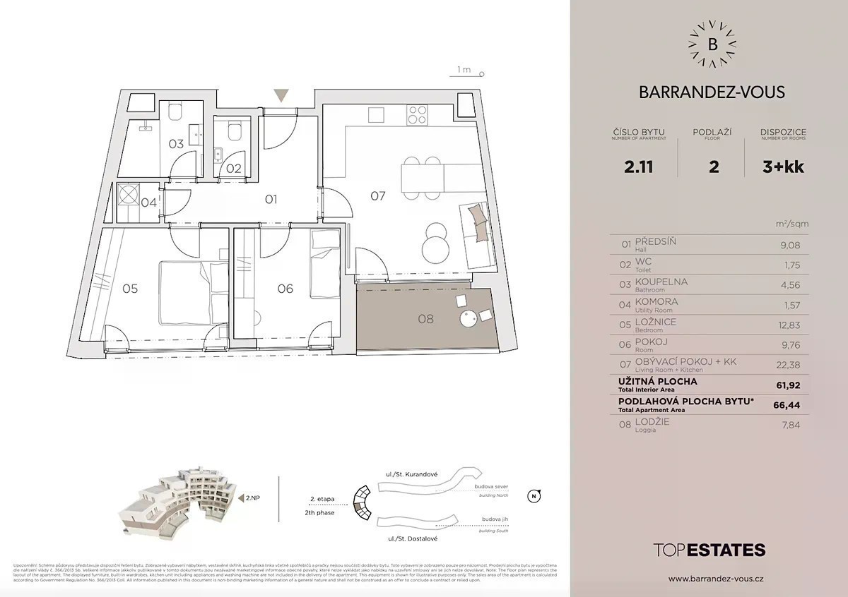 ŽIVOT V PRAZE I PŘÍRODĚ? Objevte svět BARRANDEZ-VOUS. V novém rezidenčním projektu se potkalo vše. Moderní design, vysoký standard, nový domov i pro váš elektromobil, bydlení s výhledy na panorama Prahy i propojení s přírodou. Developerská skupina TOP ESTATES zahájila výstavbu druhé etapy v 02/2024, hrubá stavba je již dokončena a kolaudace bytového domu ZÁPAD je naplánována na konec roku 2025. K rezervaci bytu nyní stačí pouze 15% a zbývající částka až po dokončení. Byt 3.11 je umístěn ve 3.NP 6-ti podlažní budovy a orientovaný na západní stranu. Nabídne Vám dvě ložnice a obývací pokoj s kuchyňským koutem. Obytný prostor prodlužuje prostorná krytá lodžie s obkladem z přírodního dřeva, kde bude celé odpoledne příjemné posezení s odpoledním sluncem. K příjemné atmosféře domova budou přispívat světlé prostory díky velkoformátovým hliníkovým oknům. Poskytnou dostatek přirozeného světla a moderní snížené parapety vytvoří posezení, odkud si můžete vychutnávat krásné výhledy v každém ročním období. Rozšířené snížené parapety navíc přímo vybízí k vytvoření nejútulnějších míst vašeho nového domova. Představte si, jak se usadíte přímo u okna do polštářů a s knížkou v ruce se necháte unášet příběhem. Pro tepelnou pohodu i stínění jsou již ve standardu venkovní žaluzie. Promyšlené dispozice a prostorné interiéry s vyšší světlou výškou budou doplňovat dřevěné podlahy a designové koupelny s podlahovým vytápěním, celkový komfort bydlení zajistí moderní technologie a parkování v podzemních garážích s možností dobíjecích stanic pro elektromobily. Dalším výjimečným benefitem je v BARRANDEZ-VOUS venkovní prostor. Originální rukopis Ferdinanda Lefflera, krále českých zahrad, je tady znát na každém kroku. Sdílený park uprostřed nejsou jen stromy a květiny. Součástí jsou i venkovní relaxační a herní prvky, které jsou citlivě zasazeny do celého konceptu zeleně. Pro děti vznikla bezpečná místa pro zábavu a hry a pro všechny ostatní věkové kategorie zóny pro odpočinek i setkávání. Neváhejte se přijít podívat i na dokončenou I. etapu na sousedním pozemku, překvapí vás klidná lokalita, relaxační zóny a příjemná atmosféra nového parku. Naleznete jej v ulici Kurandové na Barrandově, v lokalitě s kompletní občanskou vybaveností a přímým spojením do centra jak MHD, tak autem. V okolí můžete k procházkám do přírody využít blízký Chuchelský háj, Červený lom i kouzelné Prokopské údolí. Unikátnost a kvalitu I. etapy projektu několikrát ocenila také odborná porota prestižními cenami za architekturu a veřejný prostor. OBJEVTE propojení města s přírodou a ŽIJTE SPOKOJENĚ v BARRANDEZ-VOUS. Kompletní nabídku bytů naleznete na stránce projektu.