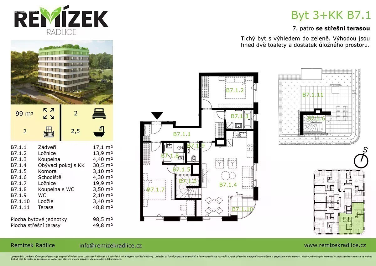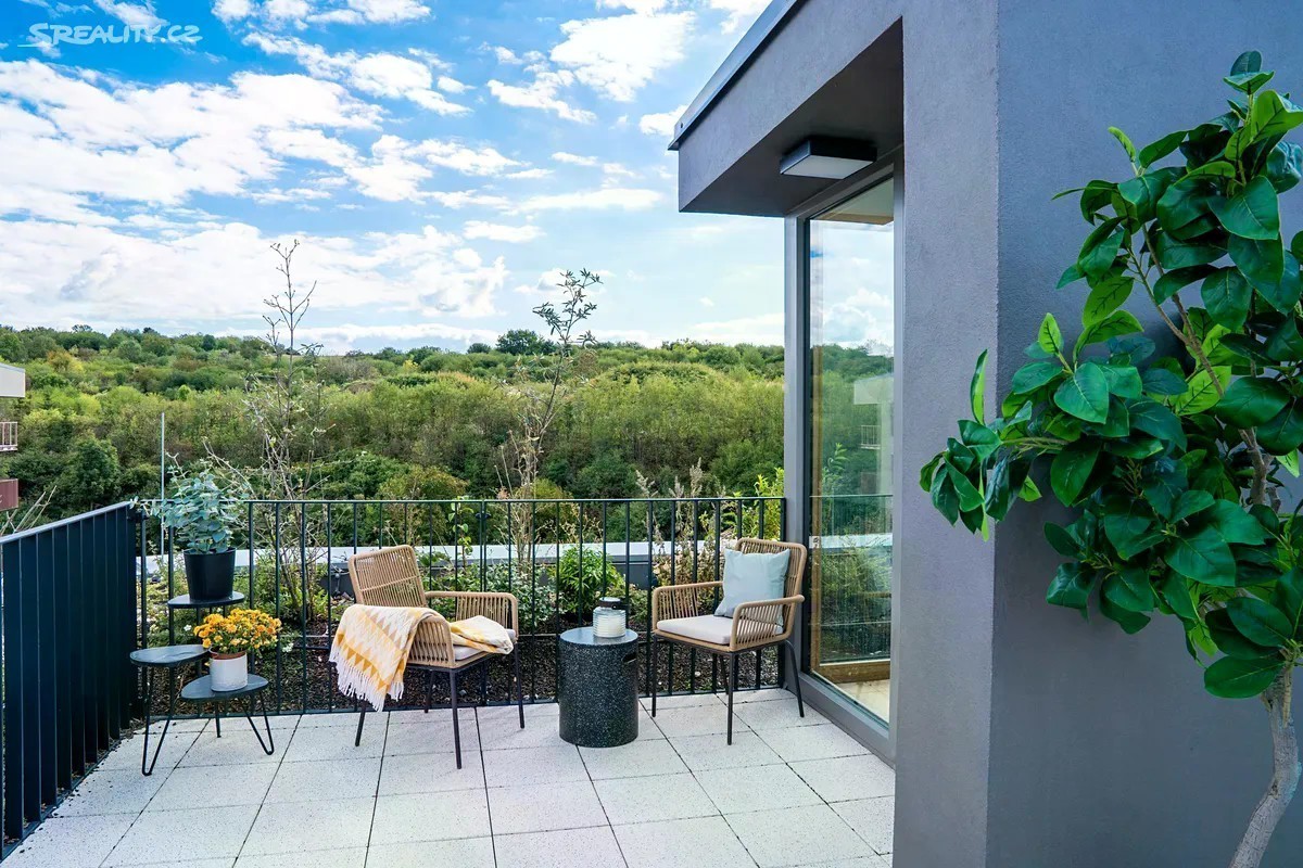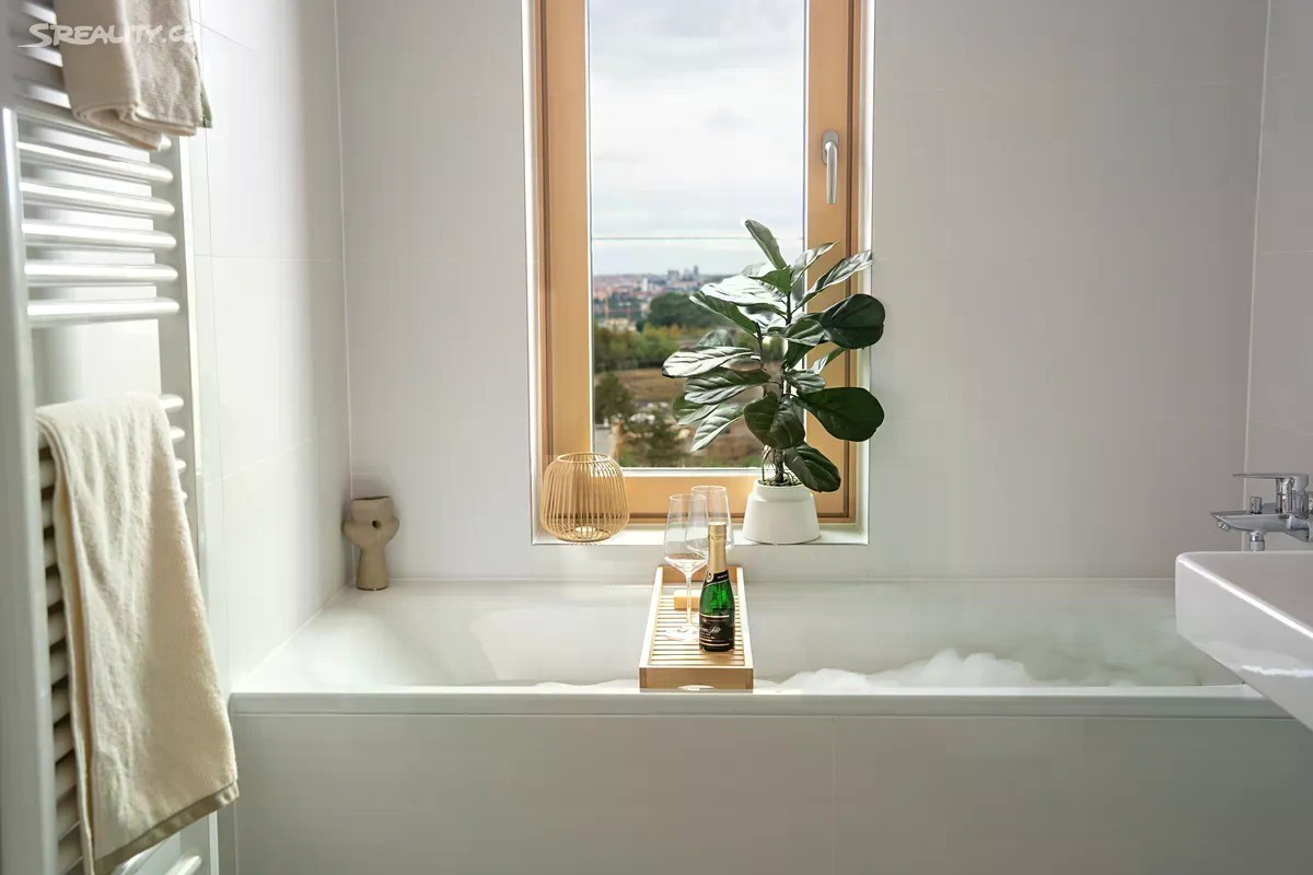 Nabízíme jihovýchodně orientovaný byt 3+kk o rozloze 100 m², který zaujme velkorysým prostorem, soukromou střešní terasou s možností umístění vířivky a nádherným panoramatickým výhledem. Dominantou bytu je světlý obývací pokoj s přípravou pro kuchyňský kout, vstupem na rohovou lodžii a vnitřním schodištěm vedoucím na terasu. Pod schodištěm se nachází praktický úložný prostor. Hlavní koupelna je vybavena vanou a přípojkou na pračku, samostatné WC s umyvadlem je umístěno hned vedle. Druhá koupelna se sprchovým koutem a toaletou je přístupná z prostorné ložnice, kde je také místo pro pracovní kout nebo šatnu. Byt působí světlým, vzdušným dojmem, nabízí dostatek úložných prostor i maximální soukromí. Ideální volba pro ty, kteří hledají komfortní a výjimečné bydlení s dostatkem prostoru a výhledem, který jen tak neomrzí. K bytu lze dokoupit sklep a parkovací stání. Více informací naleznete na webových stránkách.