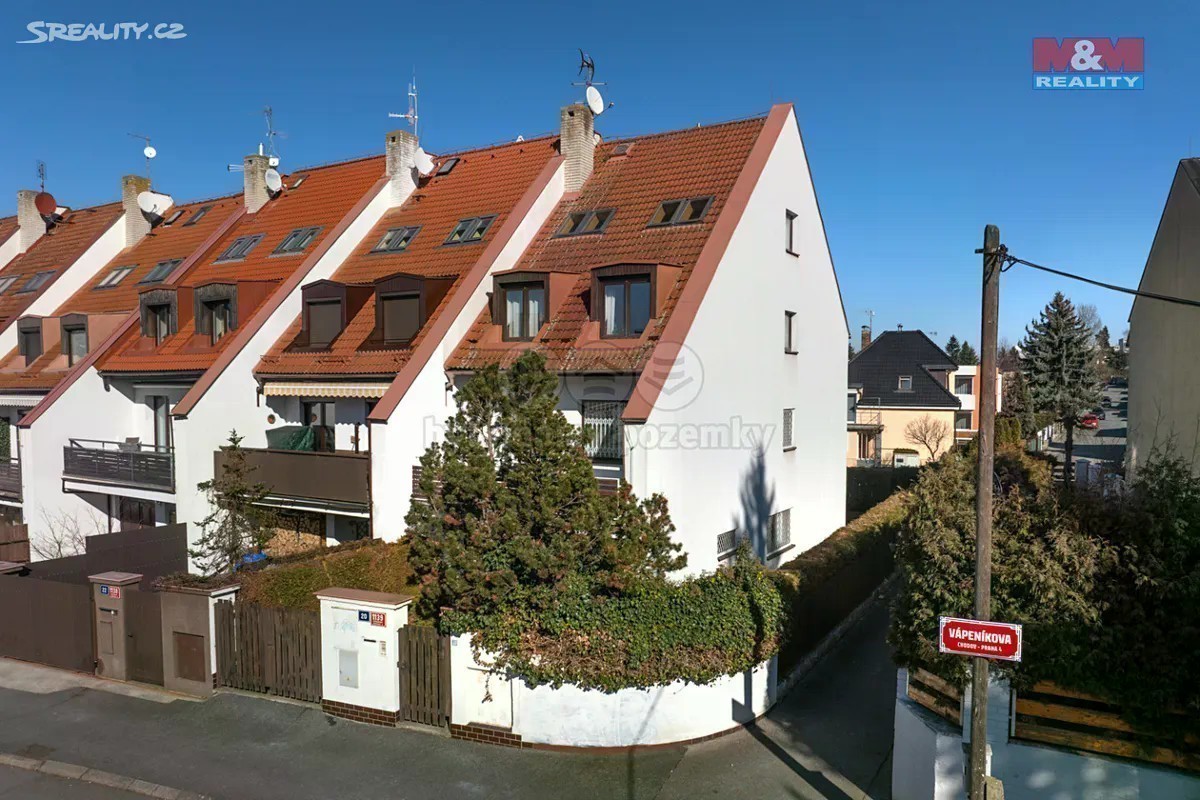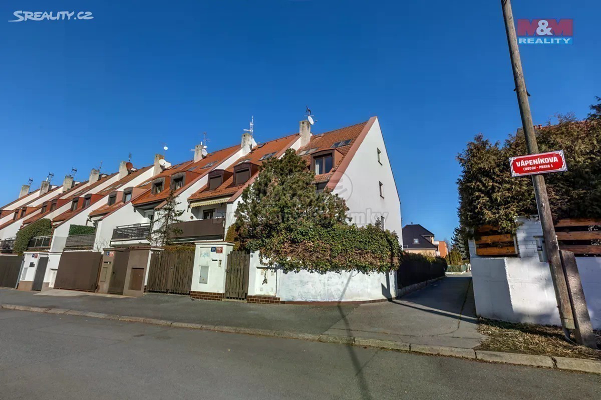 Ve výhradním zastoupení nabízíme k prodeji prostorný krajní řadový dům v atraktivní lokalitě Chodova, v klidné ulici Vápeníkova. Tento dům 7+1 o užitné ploše 234 m², leží na pozemku o velikosti 252 m². Je ideálním řešením pro pohodlné rodinné bydlení. Dům je ve velmi dobrém, pečlivě udržovaném stavu. Lokalita nabízí kompletní občanskou vybavenost a výbornou dostupnost městskou hromadnou dopravou. Stanice metra Chodov je vzdálena pouze 15 minut pěšky a zastávka MHD je jen 8 minut chůze, což zajišťuje rychlou dopravu do centra města. Dispozice: V přízemí domu se nachází garáž, prostorná vstupní hala, tech. místnost, pracovna a toaleta. V prvním patře je umístěn prosluněný obývací pokoj se vstupem na terasu, kuchyně propojená s jídelnou, se vstupem na balkon, toaleta. Ve druhém patře se nacházejí 3 ložnice, koupelna a samostatná toaleta. Ve třetím patře jsou dva podkrovní pokoje, Doporučuji osobní prohlídku, neváhejte mě kontaktovat. Těším se na Vás.