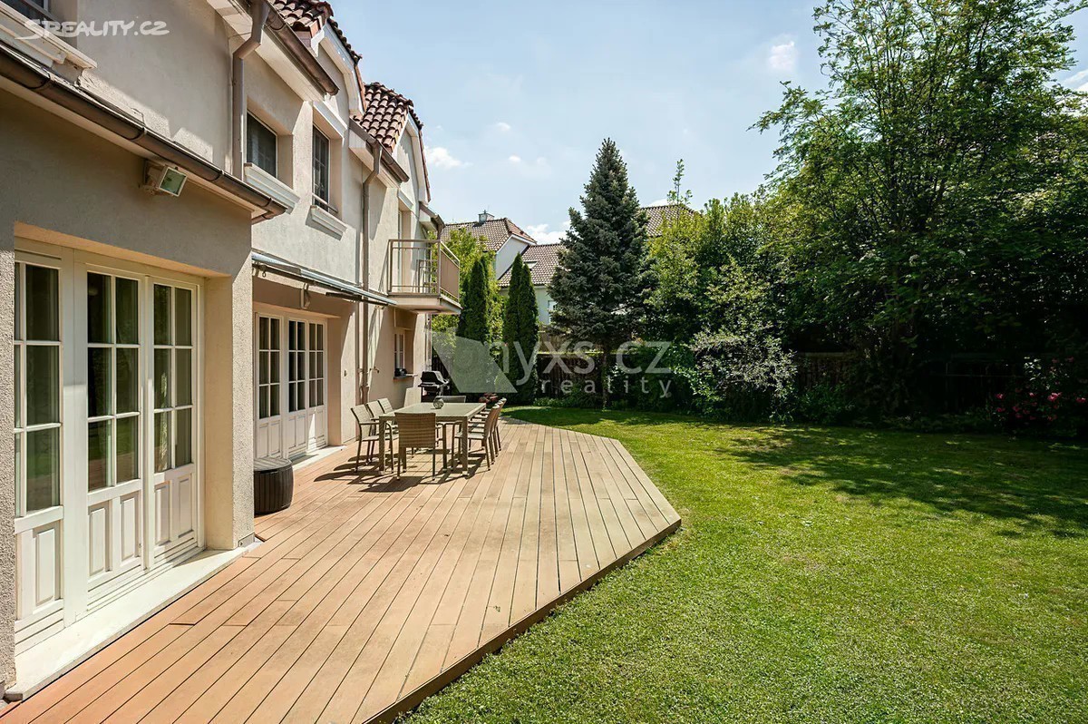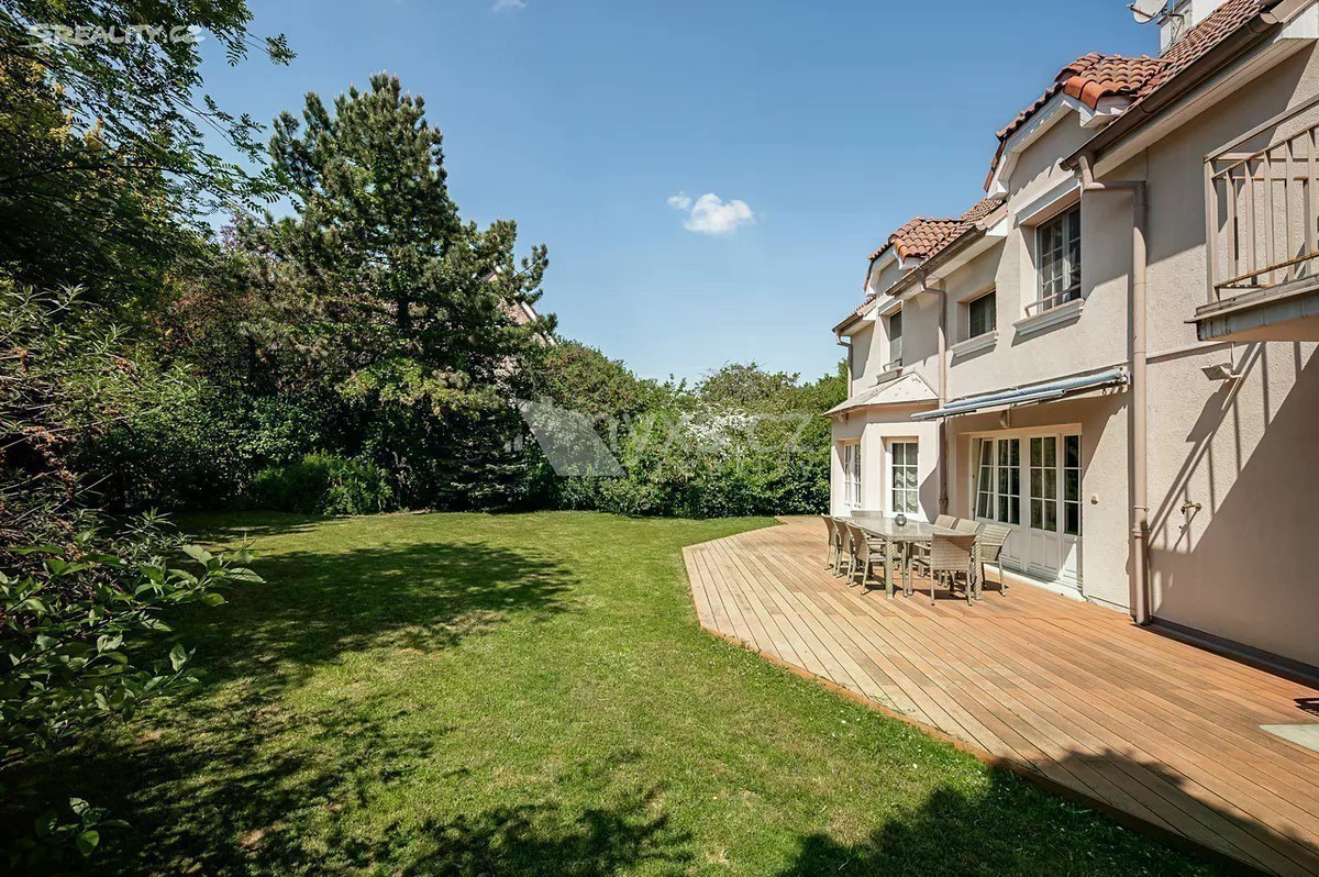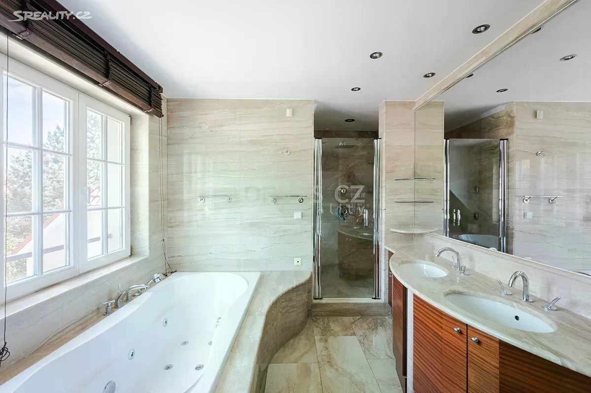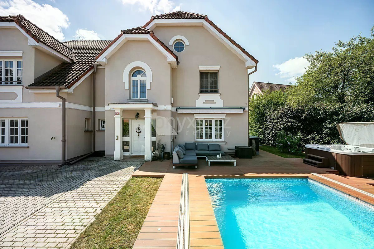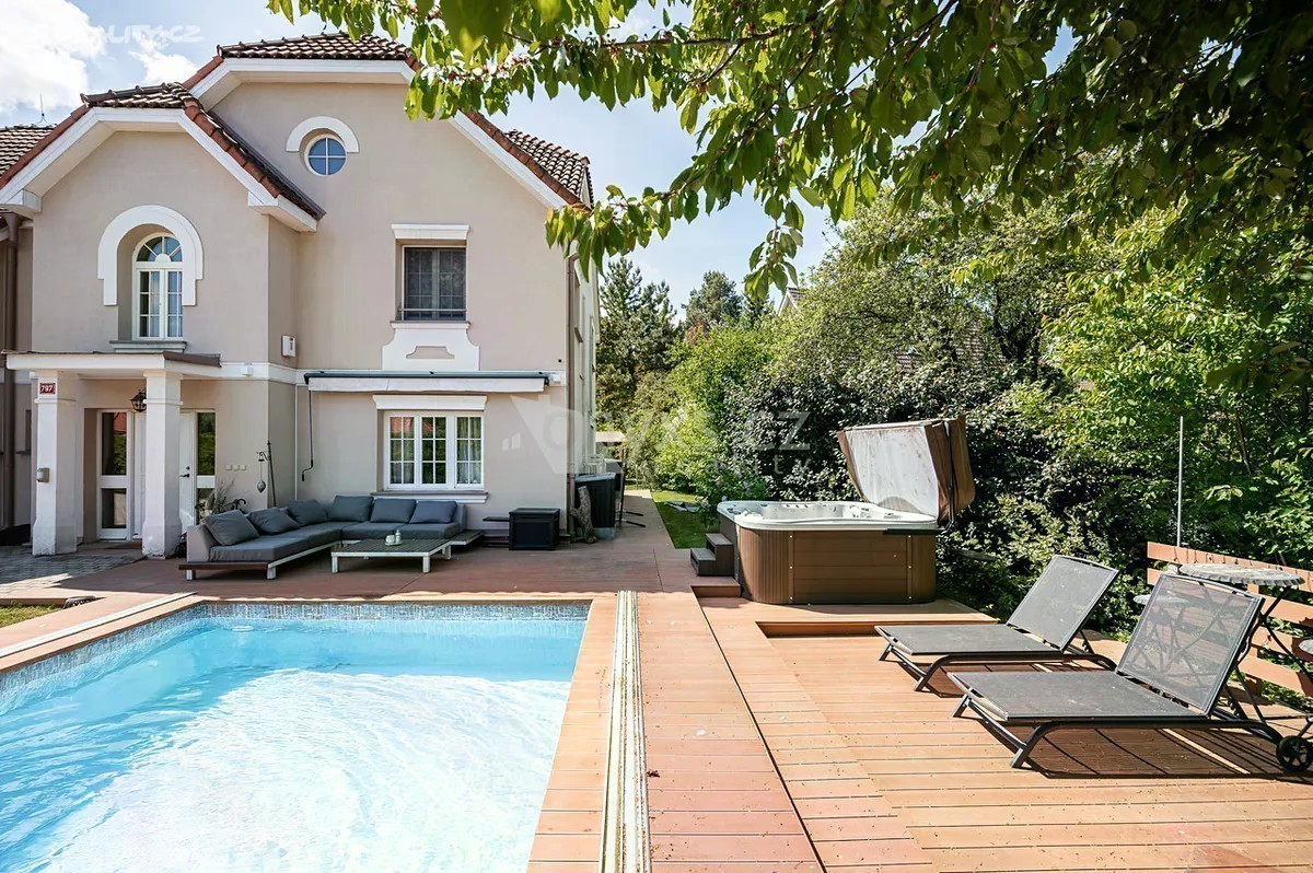 Samostatně stojící, klimatizovaný rodinný dům s 6 ložnicemi a 4 koupelnami, vzrostlou zahradou, bazénem a vířivkou se nachází v oblíbené lokalitě Prahy 6 - Nebušicích v rezidenčním areálu Malá Šárka. Výjimečná příležitost v Malé Šárce - nejunikátnější rezidence v okolí. Dům má ideální polohu v srdci čtvrti a nabízí naprosté soukromí a klid, jen pár minut chůze od mezinárodní školy ISP a pouhých 5 minut od stanice metra Bořislavka. Soukromá příjezdová cesta z ulice Na Malé Šárce zajišťuje diskrétní přístup, zatímco nemovitost je krásně obklopena vzrostlými stromy a bujnou zelení, což vytváří poklidnou, osamocenou atmosféru, kterou na tak centrálním místě najdete jen zřídka. Letiště je v krátkém dosahu. V přízemí najdeme prostornou obývací místnost s přístupem na zahradu a útulným krbem, komfortní kuchyni, jídelnu, vstupní halu a pokoj pro hosty s vlastní koupelnou a samostatnou toaletu. K dispozici jsou vestavěné skříně v chodbě i v pokoji pro hosty. Horní patro disponuje halou a master ložnicí, která nabízí elegantní en-suite koupelnu s masážní vanou a prostorným sprchovým koutem, praktickou walk-in šatnu a balkon s výhledem na zahradu. Toto patro dále nabízí tři ložnice s vestavěnými skříněmi a velkou koupelnu. Ze všech klimatizovaných ložnic se nabízí klidné výhledy do okolní zeleně. V obytném suterénu najdeme velkou TV místnost/obývací pokoj, ložnici s vlastní koupelnou, chodbu, prádelnu a úložné prostory. Prostorný suterén nabízí další možnosti využití jako fitness, dětská herna, pracovna, domácí kino, případně další ubytovací prostory pro návštěvy. Bezproblémové parkování, případně potenciál přestavby na samostatný byt či office, představuje dvojgaráž. Velký pozemek před domem, poskytuje vlastní parkovací stání pro 3-4 automobily. Teplo domova zajišťuje samostatný plynový kotel. Výše záloh na služby činí 10.000 Kč/měsíc plus elektřina, plyn a Internet. K dispozici v areálu je nepřetržitá bezpečnostní služba a recepce. Nebušice se pyšní veškerou občanskou vybaveností v okolí. V obci se nachází mateřská a základní škola, známá mezinárodní škola ISP, dětské hřiště, lékárna, pošta, květinářství, sportovní hala, tenisové kurty, fotbalové hřiště, kvalitně zásobený supermarket a restaurace s bowlingem. Skvělá dopravní dostupnost (za 5 minut na metru Bořislavka). Nádherná příroda a lesy v přírodním parku Šárka - Lysolaje, lákají k pohybu a aktivnímu životu.