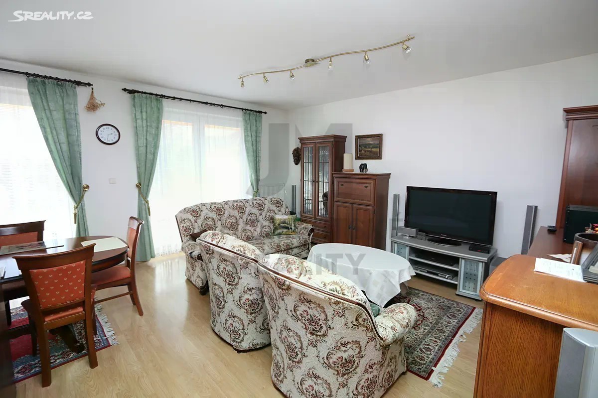 Prodej patrového řadového rodinného domu 4+kk s terasou, užitná plocha 103 m2 a 17 m2 garáž, zastavěná plocha 79 m2, užitná plocha pozemku je 245 m2, zkolaudováno v roce 2004. V přízemí se nachází vstupní chodba s odkládací šatní skříní, komora, koupelna s WC a kuchyň spojená s obývacím pokojem. Z garáže s úložným prostorem je možno vstoupit přímo do domu. V patře (podkroví) jsou 3 ložnice, koupelna s WC a pracovní koutek. Na podlahách v koupelně, WC, chodbě a v kuchyňském koutu je dlažba, v obývacím pokoji je plovoucí podlaha, ve zbývajících místnostech jsou koberce. Rozvody vody jsou plastové, voda se užívá z obecního vodovodního řadu, kanalizace je obecní. Vytápění je ústřední plynové - nový plynový kotel. Elektřina je na 230 V. Na zahradě je zahradní domek, venkovní posezení s přístupem přímo z obývacího pokoje. Před domem je 1 parkovací místo. Klasifikační třída energetické náročnosti D.