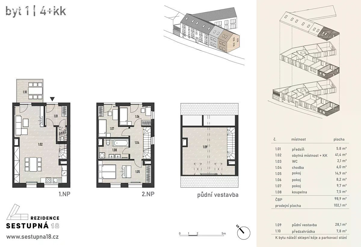 Projekt Rezidence Sestupná 18 s celkem 8 byty a 2 řadovými domky je koncipován jako moderní butiková forma bydlení. Bytový dům je naprojektován ve vysokém standardu z hlediska současných stavebních možností s osvědčenými hi-technologiemi pro každodenní využívání všech částí domu. Jedná se o dvoupodlažní podsklepený objekt s výtahem a s obytným podkrovím nacházející se v Praze 6, v blízkosti oblíbené Obory Hvězda. Architektonická koncepce projektu byla navržena tak, aby respektovala stávající zástavbu této oblíbené rezidenční části Prahy. Část zahrady je společná, část jsou předzahrádky náležející ke spodním bytům a řadovým domkům. Projekt byl zkolaudován v dubnu 2024 a jednotky jsou připravené k nastěhování. Řadový domek č. 1 (kolaudováno jako bytová jednotka) je rohový řadový domek, který má samostatný vstup ze společné zahrady. K tomuto bytu náleží předzahrádka/terasa o velikosti 52m2. Část z tohoto pozemku je nyní připravená jako venkovní parkovací stání s dlažbou. Takže kromě parkování v podzemní garáži může majitel využívat také plochu těsně vedle domu. Domek je rozložen do 3 podlaží, vestavěná půdní galerie není započítána v prodejní užitné ploše, nicméně může sloužit jako další pokoj či pracovna, dá se tady také dodělat koupelna. Pro účely inzerce tuto plochu zmiňujeme v užitné ploše. K jednotce dále náleží 1 parkovací stání v podzemní garáži a prostorný sklep. Tento domek/byt ocení zejména klienti, kteří hledají moderní bydlení s parkováním a s dispozicí větší než 4kk, současně touží po terase či zahrádce a po prémiové lokalitě v blízkosti parků a zeleně, a to vše s rozumným rozpočtem. V lokalitě Prahy 6 je tato nabídka velmi ojedinělá. Tato nemovitost je také vhodná investice na pronájem pro zahraniční klientelu z mezinárodních škol v okolí. V této oblasti je vzhledem k blízkosti zahraničních škol a letiště vysoká poptávka po bytech či domech na pronájem mezi tzv. expat klientelou a ceny nájemného jsou vyšší než obvyklé, proto jsou nemovitosti v tomto objektu vhodné také na investici.