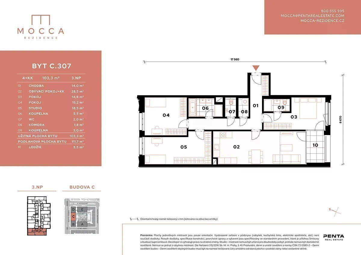 Nový byt C.307 o dispozici 4+kk (103,3 m2) s lodžií (5,5 m2) se nachází na 3. nadzemním podlaží sekce C projektu MOCCA Rezidence. Bytový dům má plánované dokončení v 1Q 2027. Prodej přímo od developera. MOCCA Rezidence nabízí všechny byty ve vysokém standardu Premium, který je synonymem pro moderní dispozice bytů s možnostmi individuálních klientských změn. Ve standardu naleznete značkové materiály vybavení předních světových výrobců keramiky, obkladů, koupelnových baterií. Hliníková okna jsou vybavena trojím zasklením, které perfektně izoluje jak v létě tak i v zimě. Navíc je ve všech oknech realizována i příprava pro předokenní elektrické žaluzie. Byty v posledních patrech jsou osazeny klimatizačními jednotkami. Dřevěné podlahy jsou třívrstvé, dlažby a obklady velkoformátové v moderním designu a několika barevných provedeních. Všechny byty jsou vytápěny teplovodním podlahovým topením a vybaveny technologií výměny vzduchu s centrální rekuperací. V podzemních podlažích jsou majitelům k dispozici garážová stání, zděné sklepy, kočárkárny, dílna a místnost pro mytí kol. Pro všechny majitele bude k dispozici také prostorný, multifunkční cvičební sál, který budou moci volně využívat. Developerský projekt MOCCA Rezidence od společnosti Penta Real Estate zaručuje vynikající dopravní spojení do centra města, ale i na výpadovky a městský okruh. Stanice metra B - Českomoravská je od projektu vzdálená 3 min chůze, což zajišťuje skvělou dopravní dostupnost do centra i dalších částí města. Stanice tramvajové zastávky Poliklinika Vysočany je vzdálena 2 min chůze. K bytu je nutné přikoupit 1x parkovací stání v ceně 672.000,- Kč vč. DPH a sklep v ceně 346.100,- Kč vč. DPH. Další parkovací stání je možné přikoupit v ceně 672.000,- Kč vč. Jejich ceny nejsou zahrnuty v uvedené kupní ceně bytu. DPH. Parkovací stání a sklepy se nachází na třech podlažích. V případě zájmu nás neváhejte kontaktovat. Více informací o tomto bytu, projektu, lokalitě a kompletní nabídku bytů ve výstavbě najdete na webu projektu MOCCA Rezidence.
