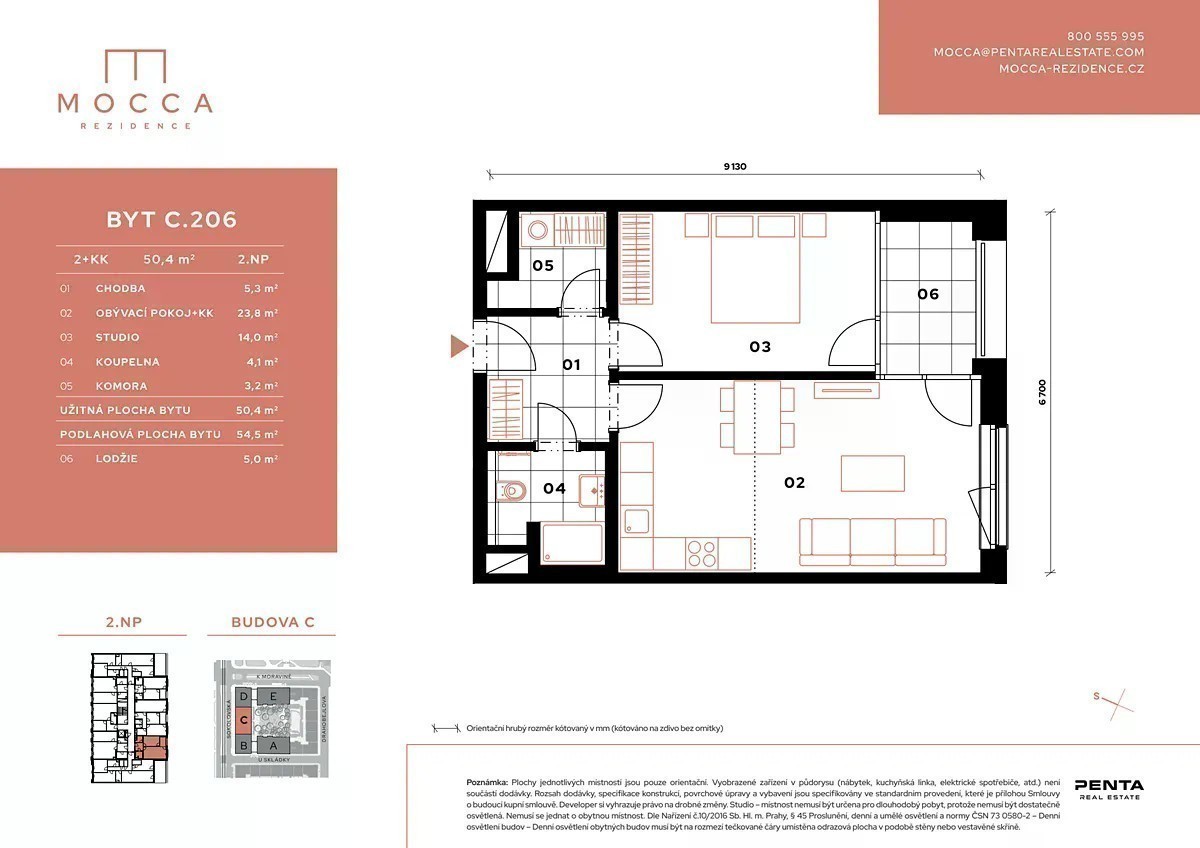 Nový byt A.301 o dispozici 2+kk (45,7 m2) s lodžií (5,8 m2) se nachází na 3. nadzemním podlaží sekce A v projektu MOCCA Rezidence. Bytový dům má plánované dokončení v 1Q 2027. Prodej přímo od developera. MOCCA Rezidence nabízí všechny byty ve vysokém standardu Premium, který je synonymem pro moderní dispozice bytů s možnostmi individuálních klientských změn. Ve standardu naleznete značkové materiály vybavení předních světových výrobců keramiky, obkladů a koupelnových baterií. Hliníková okna jsou vybavena trojím zasklením, které perfektně izoluje jak v létě tak i v zimě. Navíc je ve všech oknech realizována i příprava pro předokenní elektrické žaluzie. Byty v posledních patrech jsou osazeny klimatizačními jednotkami. Dřevěné podlahy jsou třívrstvé, dlažby a obklady velkoformátové v moderním designu a několika barevných provedeních. Všechny byty jsou vytápěny teplovodním podlahovým topením a vybaveny technologií výměny vzduchu s rekuperací. V podzemních podlažích jsou majitelům k dispozici parkovací stání, zděné sklepy, kočárkárny, dílna a místnost pro mytí kol. Pro všechny majitele bude k dispozici také prostorný, multifunkční cvičební sál, který budou moci volně využívat. Developerský projekt MOCCA Rezidence od společnosti Penta Real Estate zaručuje vynikající dopravní spojení do centra města, ale i na výpadovky a městský okruh. Stanice metra B - Českomoravská je od projektu vzdálená 3 min chůze, což zajišťuje skvělou dopravní dostupnost do centra i dalších částí města. Stanice tramvajové zastávky Poliklinika Vysočany je vzdálena 2 min chůze. K bytu je možné přikoupit parkovací stání v ceně 672.000 Kč včetně DPH a nutné přikoupit sklep v ceně 256.500 Kč vč. DPH. DPH. Jejich ceny nejsou zahrnuty v uvedené kupní ceně bytu. Parkovací stání a sklepy se nachází na třech podlažích. V případě zájmu nás neváhejte kontaktovat. Více informací o tomto bytu, projektu, lokalitě a kompletní nabídku bytů ve výstavbě najdete na webu projektu MOCCA Rezidence.