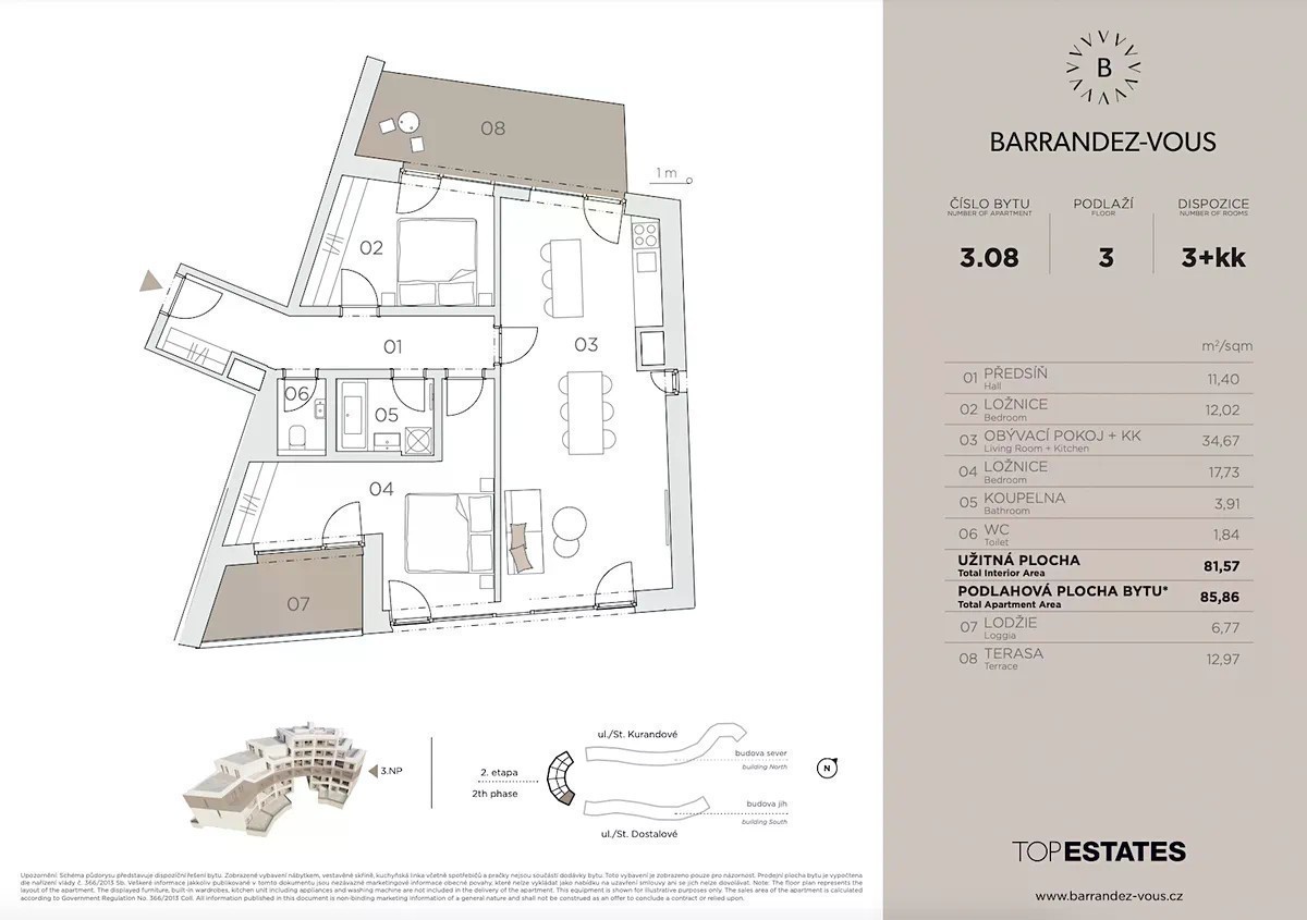 POSLEDNÍ VOLNÝ STYLOVÝ BYT S TERASOU A LODŽIÍ V PROJEKTU! Prostorný atypický byt 3.12 (3kk) je umístěn ve 3.NP 6-ti podlažní budovy. Pokoje jsou orientované na východ, jih a západ se vstupem na prostornou terasu nebo lodžii obloženou dřevem, kde si můžete užívat slunce celý den. Rozšířené snížené parapety navíc přímo vybízí k vytvoření nejútulnějších míst vašeho nového domova. Představte si, jak se usadíte přímo u okna do polštářů a s knížkou v ruce se necháte unášet příběhem. Sníte o takovém bydlení i vy? V Rezidenci Barrandez-Vous najdete pro váš komfort vše. K pohodové atmosféře přispívají světlé prostory díky velkoformátovým hliníkovým oknům. Poskytují dostatek přirozeného světla a vytvoří posezení, odkud si můžete vychutnávat krásné výhledy v každém ročním období. Pro tepelnou pohodu i stínění jsou již ve standardu venkovní žaluzie. Promyšlené dispozice a prostorné interiéry s vyšší světlou výškou budou doplňovat dřevěné podlahy a designové koupelny s podlahovým vytápěním, celkový komfort bydlení zajistí moderní technologie a parkování v podzemních garážích s možností dobíjecích stanic pro elektromobily. Dalším výjimečným benefitem je v BARRANDEZ-VOUS venkovní prostor. Originální rukopis Ferdinanda Lefflera, krále českých zahrad, je tady znát na každém kroku. Sdílený park uprostřed nejsou jen stromy a květiny. Součástí jsou i venkovní relaxační a herní prvky, které jsou citlivě zasazeny do celého konceptu zeleně. Pro děti vznikla bezpečná místa pro zábavu a hry a pro všechny ostatní věkové kategorie zóny pro odpočinek i setkávání. Neváhejte se přijít podívat i na dokončenou I. etapu na sousedním pozemku, překvapí vás klidná lokalita, relaxační zóny a příjemná atmosféra nového parku. Naleznete jej v ulici Kurandové na Barrandově, v lokalitě s kompletní občanskou vybaveností a přímým spojením do centra jak MHD, tak autem. V okolí můžete k procházkám do přírody využít blízký Chuchelský háj, Červený lom i kouzelné Prokopské údolí. Unikátnost a kvalitu I. etapy projektu několikrát ocenila také odborná porota prestižními cenami za architekturu a veřejný prostor. OBJEVTE propojení města s přírodou a ŽIJTE SPOKOJENĚ v BARRANDEZ-VOUS. Kompletní nabídku bytů naleznete na stránce projektu.