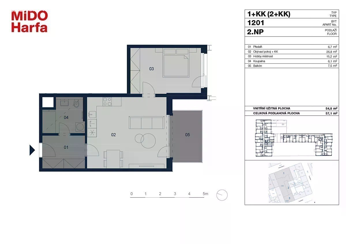 Rádi bychom Vám nabídli byt o dispozici 2+kk (obch.ozn. 1201) s celkovou katastrální plochou 57,1 m2 v nově realizovaném projektu MiDO Harfa, který vyroste přímo u stanice metra "Českomoravská", v lokalitě Prahy 9 - Libni. Bytová jednotka je koncipována ve 2. nadzemním podlaží a je orientovaná jižním směrem. K bytu náleží balkon 7,5 m2. Předností tohoto projektu je uzavřený, zelený vnitroblok - ideální místo pro odpočinek a relaxaci, poskytující svým obyvatelům klid a soukromí. Je to místo, kde se setkává město se zelení v harmonii. Další devízou je velkorysé dispoziční řešení a vnitřní vybavení jednotek, jako jsou například velkoformátové obklady a dlažby, plastová okna s izolačním trojsklem, kvalitní vinylová podlaha, případně elektricky ovládané žaluzie či příprava na klimatizaci u vybraných bytů. Cena bytu je uvedena včetně DPH, neobsahuje cenu garážového stání, které je možné dokoupit. Projekt je koncipován v místě s perfektní dopravní dostupností a občanskou vybaveností - v bezprostřední blízkosti najdete stanici metra „B“ Českomoravská, zastávky TRAM Ocelářská či Divadlo Gong, nákupní centrum Galerie Harfa, množství kaváren a restaurací, rozlehlý park Podviní a vše co patří k plnohodnotnému městskému životu. Rádi Vám poskytneme více informací či pomůžeme s vyřízením hypotečního úvěru přes naši partnerskou společnost.