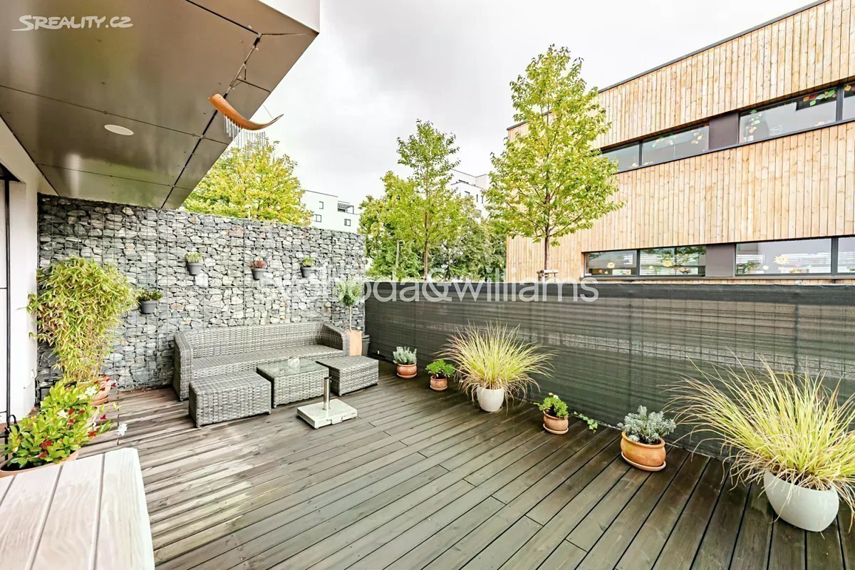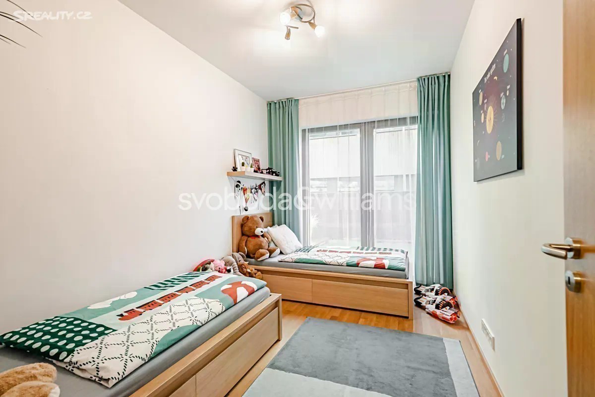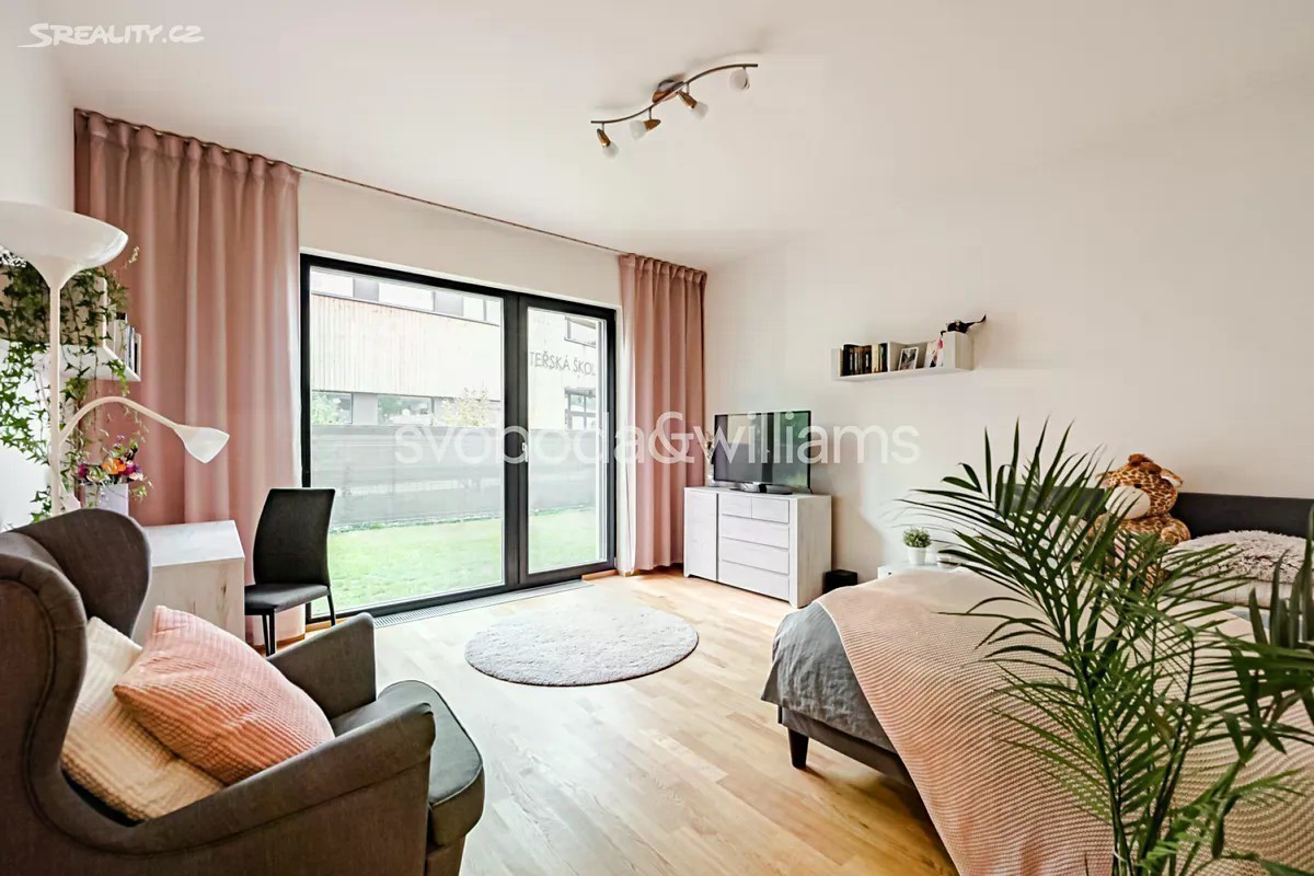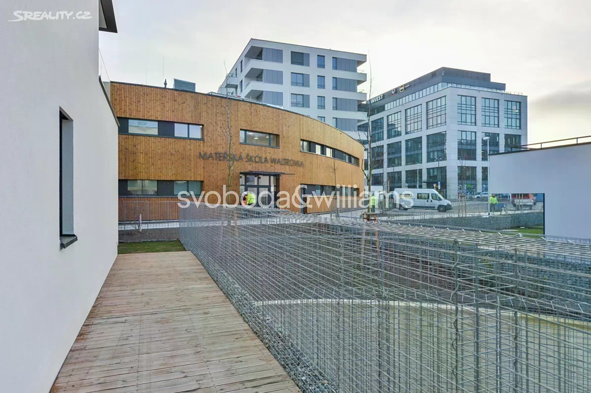 Více než stometrový zařízený byt s předzahrádkou je umístěn v přízemí bytového domu v oblíbeném rezidenčním komplexu Waltrovka s velkým parkem, podzemním parkováním a širokou nabídkou restaurací, obchodů a služeb. Moderní čtvrť leží v klidné části Prahy 5 nedaleko Prokopského údolí, blízká stanice metra umožňuje rychlé spojení do centra. Plocha bytu je rozdělena na prostorný obývací pokoj s jídelnou a kuchyní, hlavní ložnici s en-suite koupelnou (sprchový kout, WC), další 2 ložnice, hlavní koupelnu (s masážní vanou), samostatnou toaletu, vstupní halu a technickou místnost s úložním prostorem. Všechny pobytové místnosti mají vstup na jižně orientovanou terasu nebo zahradu. Interiér zútulňují dřevěné podlahy, dostatek světla propouštějí francouzská okna, která lze zastínit elektricky ovládanými předokenními žaluziemi. Ke standardu patří také bezpečnostní vstupní dveře nebo centrální vytápění. Kupní cena zahrnuje 2 garážové stání, obyvatelům je k dispozici společná kolárna/kočárkárna. V areálu funguje supermarket, drogerie, kavárny, restaurace, čistírna oděvů, zdravotnická zařízení, lékárna i pošta, lokalitu zpříjemňuje rozlehlý upravený park s dětským hřištěm i nedaleké Prokopské údolí. U domu je mateřská škola, nedaleko jsou i další školky a školy včetně Fakulty sociálních věd UK, v krátké dojezdové vzdálenosti je Deutsche Schule nebo Japonská škola v Praze. Pohodlné spojení s centrem zajišťuje metro z blízké stanice Jinonice, v přípravě je také trolejbusová linka se zastávkou přímo u rezidenčního komplexu. Podlahová plocha 114,7 m2, zahrada 74,6 m2.