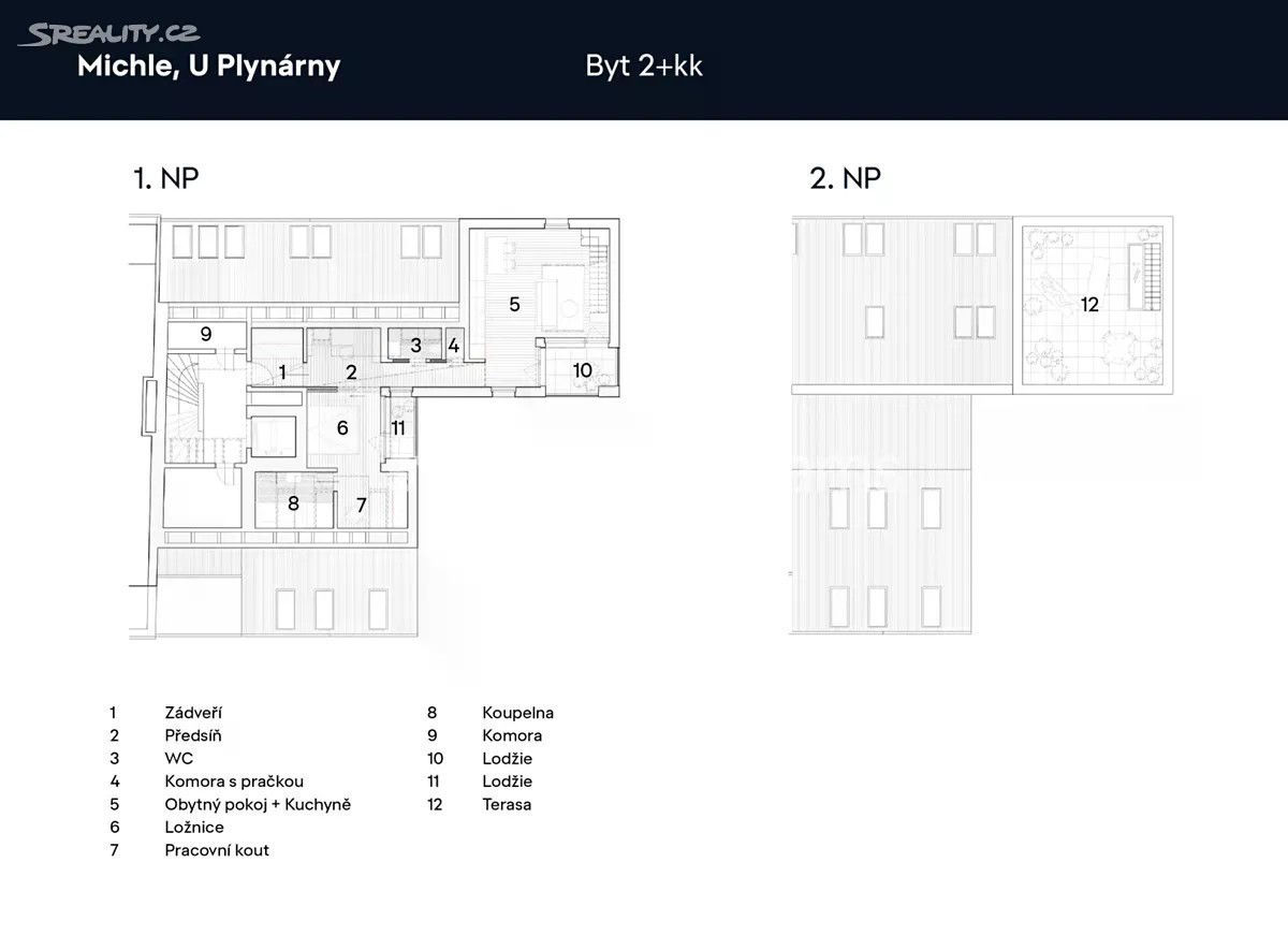 Byt se dvěma lodžiemi a interiérem navrženým architektonickým studiem se jako jediná jednotka rozkládá v 8. podlaží nízkoenergetické novostavby stojící v Praze 10 - Michli blízko tramvajové zastávky. Plochu bytu tvoří obývací pokoj s kuchyní, ložnice s přilehlou pracovnou, vzdušná koupelna (s vanou i sprchovým koutem), samostatná toaleta, komora s přípojkou na pračku a sušičku, prostorné zádveří a předsíň. Na obývací pokoj i ložnici navazují lodžie, z obývacího pokoje navíc vede schodiště na pochozí střechu využívanou jako terasa. Z lodžií i střechy se otevírají výhledy do dalekého okolí. Nízkoenergetická budova s podzemní garáží a výtahem byla zkolaudována v r. 2021. K vysokému standardu patří třívrstvé dřevěné podlahy Kährs, velkoplošná okna s přípravou na elektricky ovládané žaluzie, rekuperace, klimatizace, sanita Villeroy & Boch, baterie Hansgrohe, protipožární bezpečnostní vstupní dveře, bezfalcové interiérové dveře s magnetickými zámky. Interiér byl navržen na míru renomovaným architektonickým studiem, kuchyně má betonovou pracovní desku. Možnost přikoupit 3 propojené sklepy v suterénu o celkové výměře 6 m2 za 300 000 Kč a garážové stání se šířkou 3,6 metru za 750 000 Kč. Vstup do budovy je na čip. Hned u domu funguje supermarket, v dosahu je také nákupní centrum Eden, fitness centrum a další sportoviště včetně plaveckého stadionu. Snadnou dopravní dostupnost zajišťují tramvaje a autobusy, autem se dá rychle napojit na Jižní i Spořilovskou spojku. Podlahová plocha 81,6 m2, lodžie 3,3 m2 a 6,5 m2, sklep 6 m2.