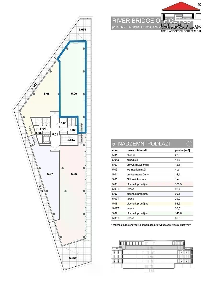 Dovolujeme si Vám nabídnout nové moderní obchodní prostory v přízemí na Praze 5 - Hlubočepy, v blízkosti Dvoreckého mostu, který v dohledné době propojí oba břehy řeky Vltavy. Prostory č. 1.10 o celkové výměře 123,8 m2 se nachází v přízemí administrativní budovy na břehu řeky Vltavy, která se stane součástí areálu River Business Centre. Je možné k nim využívat sociální zázemí o velikosti 66 m2, které se nachází na patře. Služby spojené s užíváním prostorů jsou stanovené na cenu 140 Kč za m2 plochy pronájmu. Areál disponuje recepcí, včetně obsluhy, ostrahou objektu 24/7, výtahem a skvělou dopravní dostupností - navazuje na Strakonickou a pouze pár metrů od kanceláří se nachází zastávka MHD Lihovar. Areál nabízí také parkovací místa - jedná se o krytá i venkovní parkovací stání v areálu a okolí. První měsíce jsou za zvýhodněné nájemné, tedy pouze za 7,99 EUR/m2/měsíc. Volné od 1.3.2026 k nastěhování. Je možné také pronajmout celé patro. Provizi RK neplatíte.