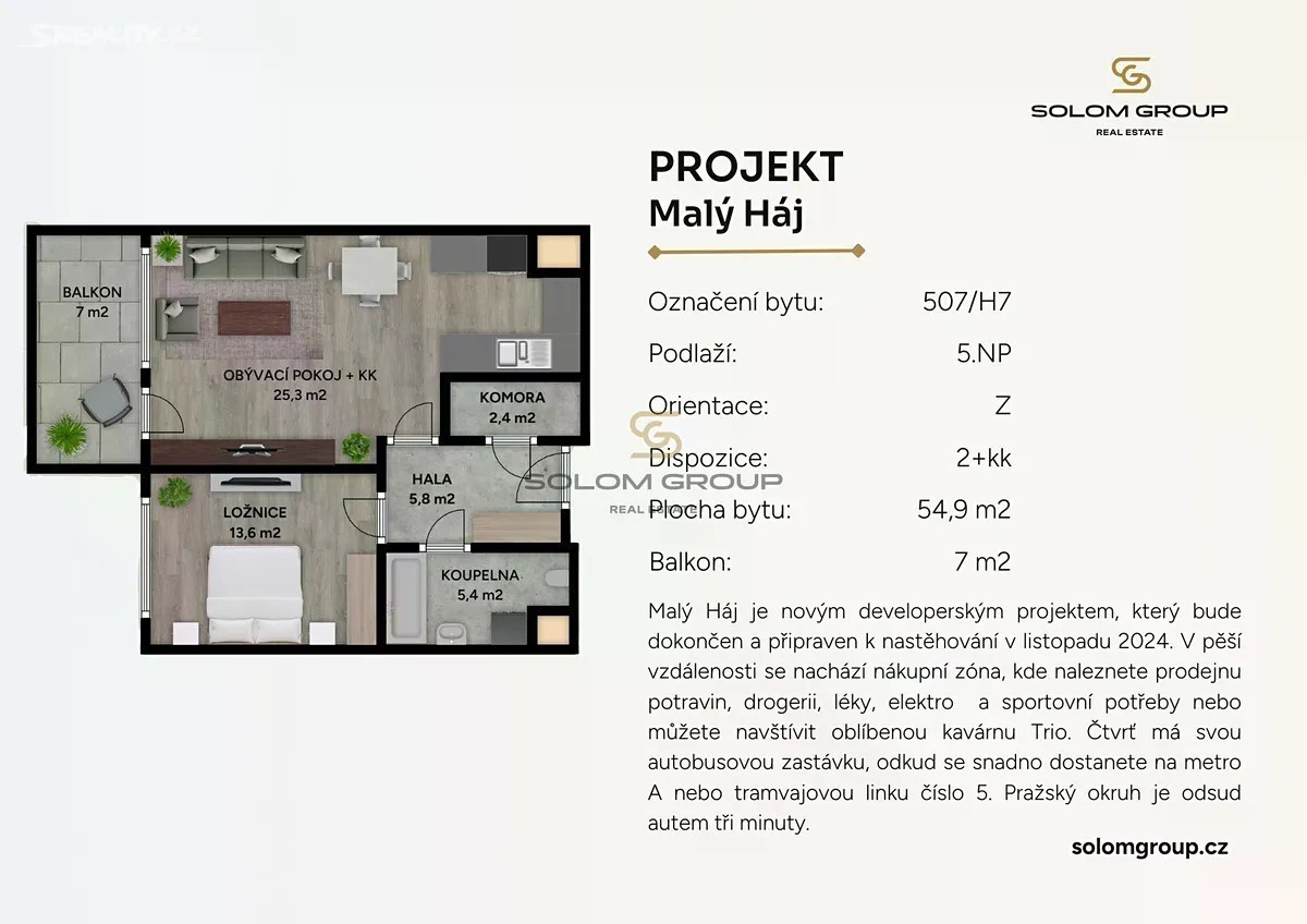 Prodej nového bytu 2+kk o velikosti 55,1 m² + balkon 7 m² + komora, který se nachází v 5. patře cihlové novostavby v rezidenci Malý Háj - Praha 10 Štěrboholy, budova H6. Vše nové - plastová okna, rozvody vody, elektřiny a odpadů, koupelna s vanou a toaletou + místo pro pračku, interiérové dveře, příprava pro kuchyňskou linku, nová dlažba. Jelikož se jedná o družstevní byt, neprokazujete výši příjmu, nepotřebujete hypoteční úvěr a cenu bytu splácíte formou splátek v měsíčních poplatcích („měsíční splátka anuity“) Možnost vložení mimořádné splátky či doplacení celé výše anuity a převedení bytu do osobního vlastnictví. Výborná dopravní dostupnost, 1 min. chůzí BUS, zast. Kardausova, poté 10 min. metro A, zast. Depo Hostivař. V blízkosti domu se nachází Obchodní centrum Retail Park, sportovní areál BB Arena nebo OC Europark Štěrboholy. Lokalita je vhodná jak k vlastnímu bydlení, tak za účelem pronajímání. K bytu přísluší balkon, komora v bytě a sklep. Akontace za byt včetně garážového stání: 2.690.000,- Kč Anuita k bytu: 5.682.650,- Kč Anuita ke garážovému stání: 354.636,-Kč. Pro více informací kontaktujte manažera nabídky.