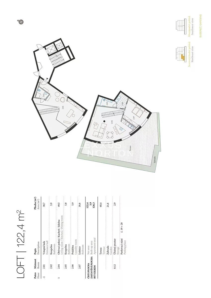 K prodeji nabízíme jedinečný mezonetový byt 2+kk s galerií o výměře 122,4 m2. Přízemí bytu nabízí velkorysý obývací prostor s vysokými stropy a francouzskými okny, díky kterým je celý otevřený prostor dokonale prosvětlený. V přízemí bytu je obývací prostor s přípravou pro kuchyňský kout, ložnice s vlastní koupelnou a prostorem pro šatnu. Z obývacího pokoje i ložnice je vstup na rozlehlou terasu (60,4 m2) se zahradou (21,6 m2). V prvním patře bytu se nachází prostorná galerie s koupelnou, kterou lze využít například jako pracovnu nebo ji lze zcela oddělit a vytvořit tak prostorný byt 3+kk. K bytu náleží sklep a dvě parkovací stání v podzemní garáži. K vysokému standardu vybavení patří dvouvrstvé dřevěné podlahy, kvalitní velkoformátové obklady v koupelnách, sanita značky Laufen a Hansgrohe, dřevěná okna s termoizolačním trojsklem, bezpečnostní vstupní dveře NEXT, bezfalcové a posuvné interiérové dveře, skleněné zábradlí na schodišti a galerii. V bytě je příprava pro systémy inteligentní elektroinstalace. V bytě je podlahové vytápění a podlahové konvektory. V objektu je tepelné čerpadlo se zemními vrty, které zajišťuje topení a chlazení všech obytných místností. Jako záložní zdroj je v domě plynový kotel. Byt se nachází na Praze 6 ve vyhledávané rezidenční čtvrti Bubeneč v ulici Rooseveltova. V lokalitě je k dispozici veškerá občanská vybavenost včetně škol, školek, vyhlášených restaurací a obchodů. V docházkové vzdálenosti je zastávka metra A - Dejvická. Autobusová a tramvajová zastávka je necelých 5 minut pěšky od rezidence. Do centra města je to necelých 15 minut autem. Na Letiště Václava Havla potom zhruba 20 minut. Relax a sportovní vyžití nabízí park Stromovka, který je vzdálený asi 3 minuty chůze. V inzerci jsou použity vizualizace možného řešení interiéru, byt není vybaven kuchyňským koutem a nábytkem.