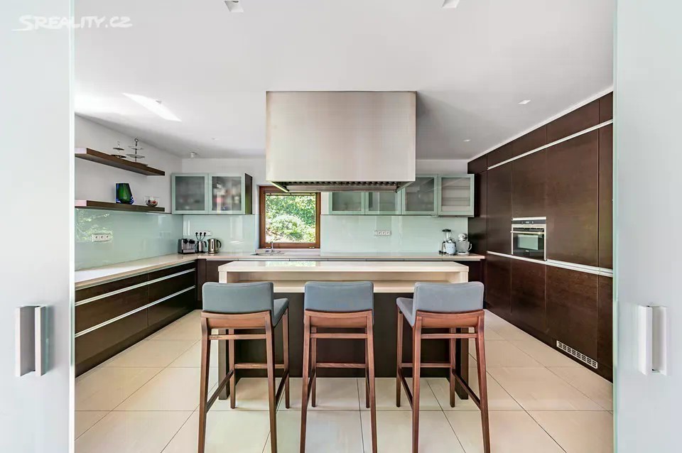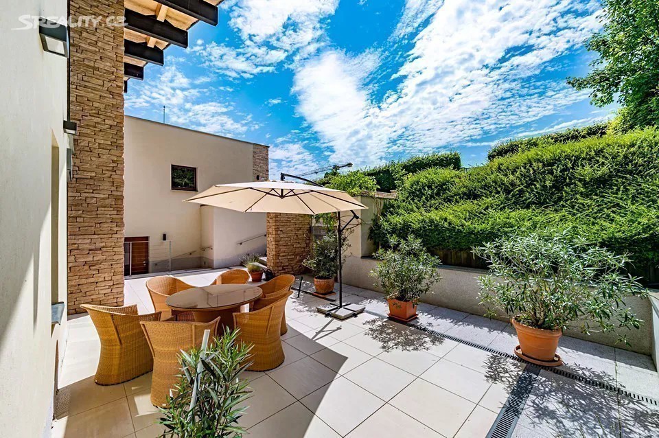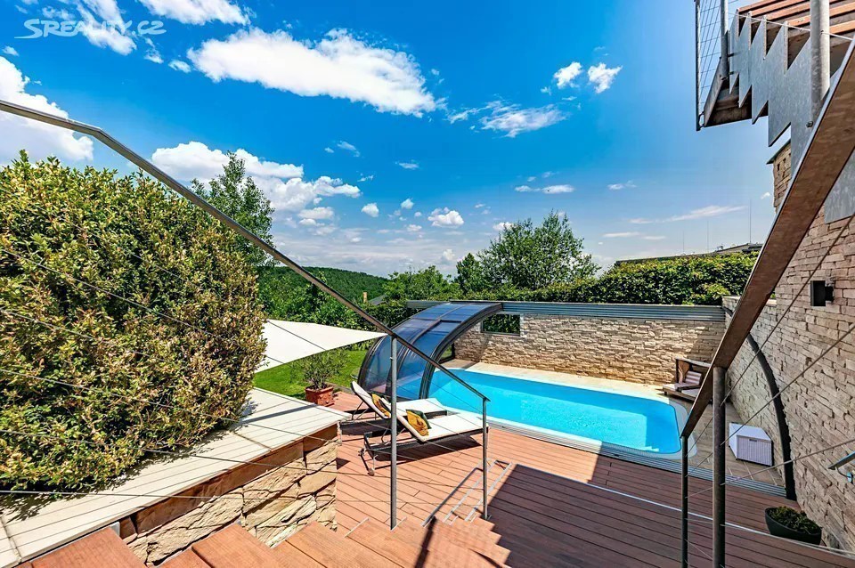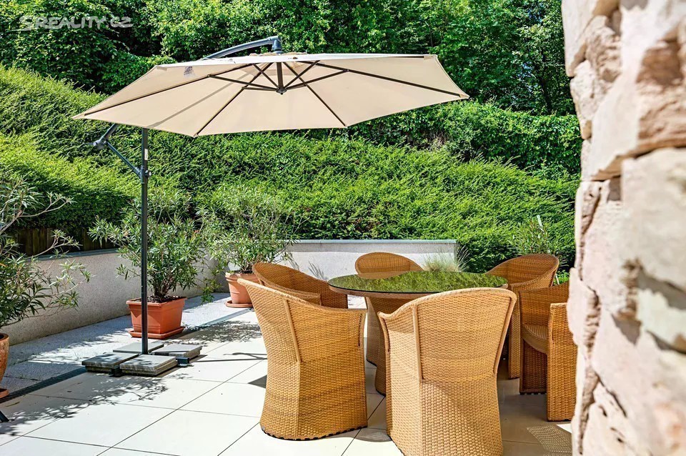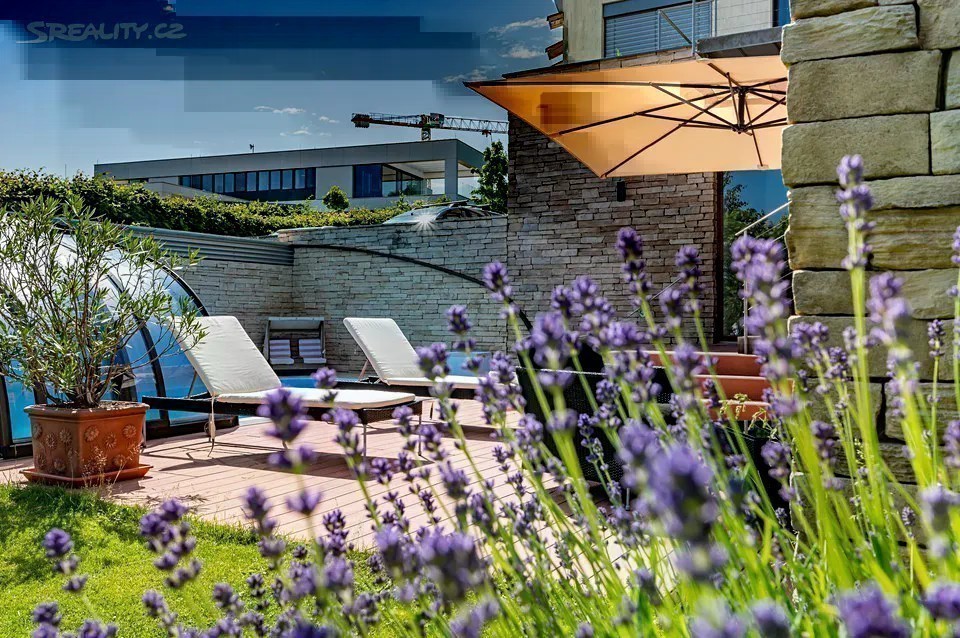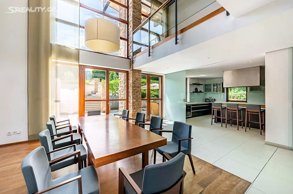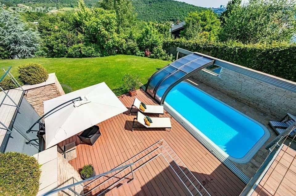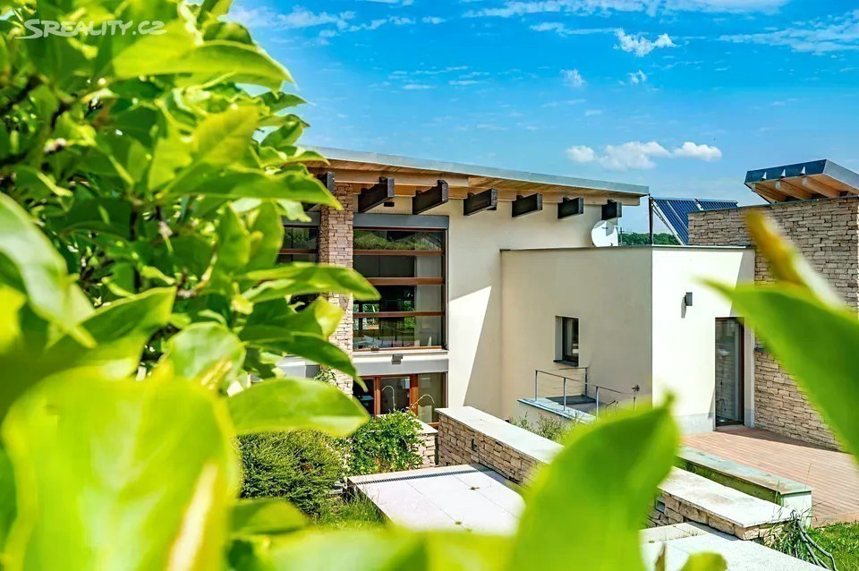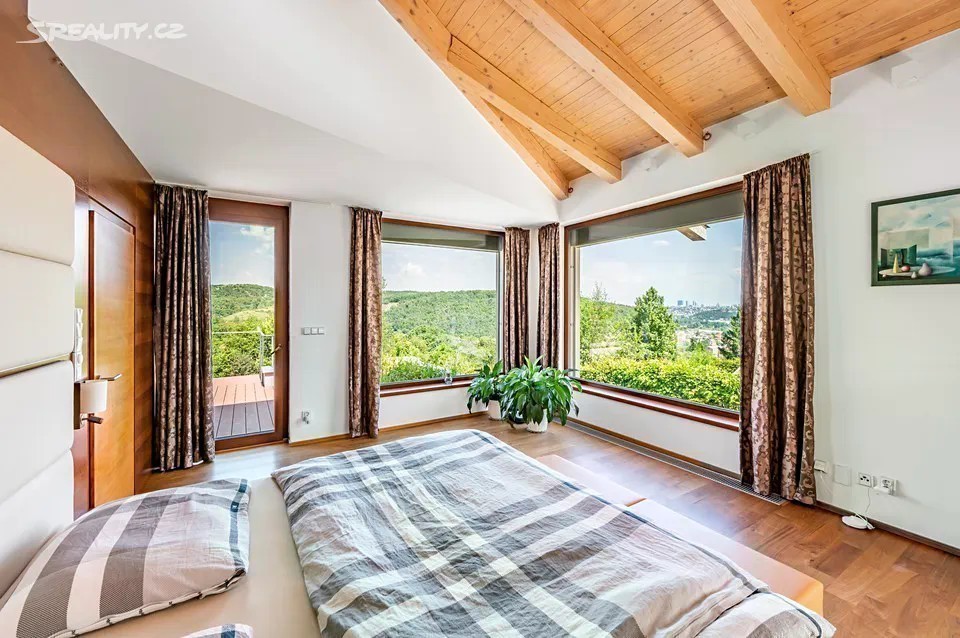 Nadčasová, nízkoenergetická (B), velkoryse pojatá, třípodlažní vila (z roku 2012) s bazénem, prosvětleným a vzdušným interiérem na slunném upraveném pozemku (2276m2) je součástí uzavřeného, rezidenčního komplexu luxusních vil v mimořádně klidné lokalitě v krásné komorní čtvrti se vzrostlou zelení zasazené do klidného, jedinečného místa obklopeného vzrostlou zelení, v blízkosti Radotínsko-Chuchelského háje a přírodní rezervace Homolka nabízí ničím nerušené výhledy do zahrady, přilehlé zeleně a panorama Prahy. Luxusně vybavená vila je vhodná i pro vícegenerační bydlení nebo pro velkou rodinu s chůvou. Prosluněný interiér skýtá dvě podlaží a suterén, 10 ložnic s en-suite koupelnami i walk-in šatnu do hlavní ložnice, zajímavě řešenou kuchyni která má prosklenou posuvnou stěnu, otevřený a velkorysý koncept obývacího pokoje a jeho propojení se zahradní terasou s neopakovatelnými výhledy na panorama Prahy a následně přímý výstup do zahrady na letní, slunící se terasu s bazénem. Nechybí samozřejmě nezbytné technické a provozní zázemí včetně prádelny s výstupem do zahrady. Při zařizování vily byl kladen velký důraz na nadčasovou eleganci a vysoký uživatelský komfort. Francouzská okna jsou dřevěná s izolačními skly, podlahy dřevěné a s velkoformátovou dlažbou. Podlahové topení v celém domě zajišťuje tepelné čerpadlo s vrty. Nechybí vrtaná studna či retenční nádrž na dešťovou vodu. K vybavení patří nábytek, fitness, venkovní vyhřívaný bazén, krb na dřevo, klimatizace v celém domě, kuchyně se spotřebiči (sporák plynový), připojení TV a wi-fi ve všech místnostech, systém automatické závlahy zahrady. Bezproblémové parkování poskytuje garáž pro cca pro 6 aut přístupná „suchou nohou“ a 4 venkovní stání. Zahradu lemují vzrostlé stromy. Bydlení zpříjemňuje spousta okolní zeleně a mnoho možností procházek či cyklovýletů v přírodním parku Homolka a Chuchelský Háj. Jedinečná přírodní lokalita poskytuje klidné prostředí, soukromí a relaxační výhledy do zeleně. Z místa se dá rychle dostat do centra i na letiště, autobusovými spoji též k metru. Pohodlí zajišťuje blízkost občanské vybavenosti. Jsou zde mateřské školy, základní škola i gymnázium, sportovní centrum, potraviny. Užitná plocha 674 m2 zastavěná plocha 480m2, pozemek 773 m2 (zahrada 1796m2 + 480m2 zastavěná plocha).