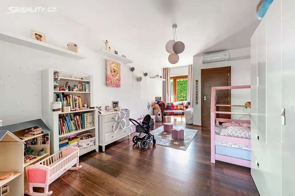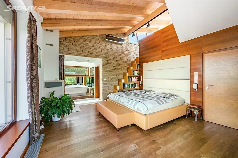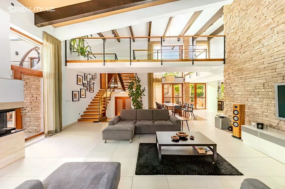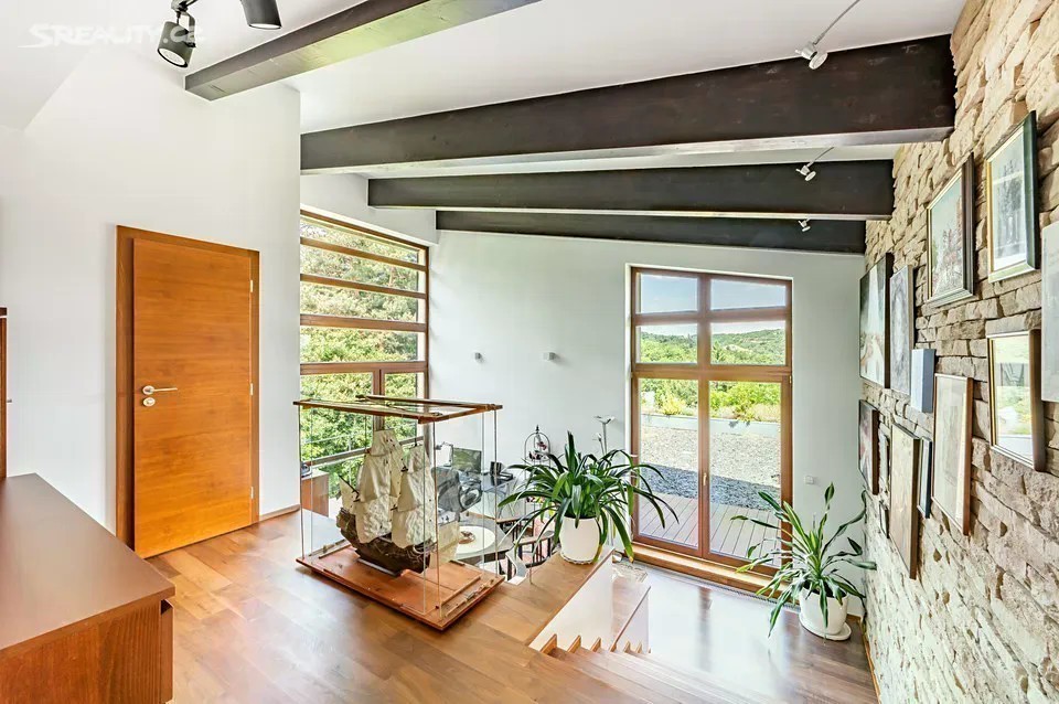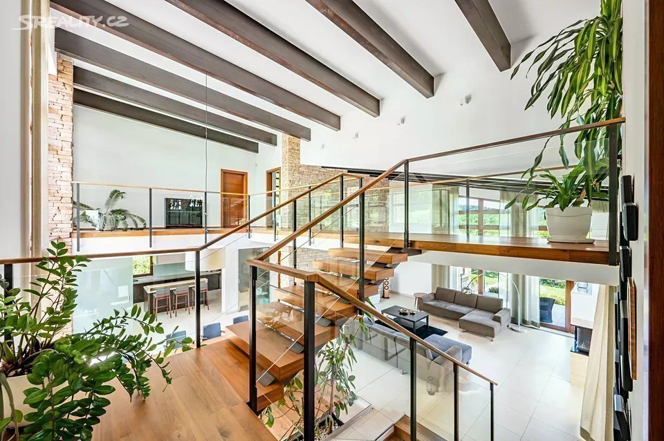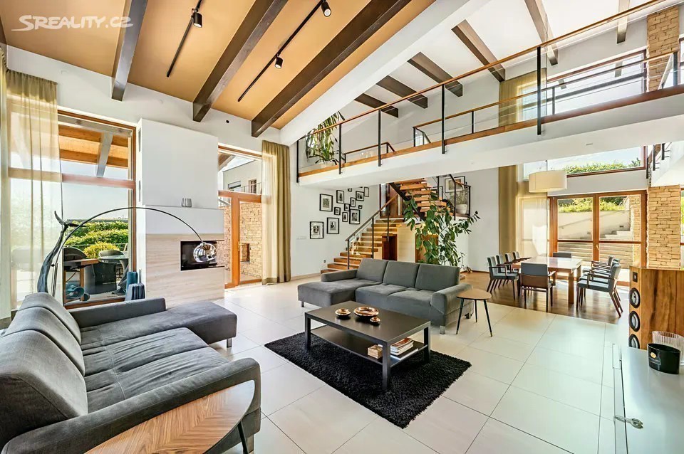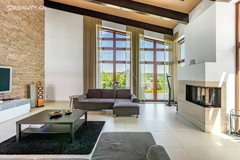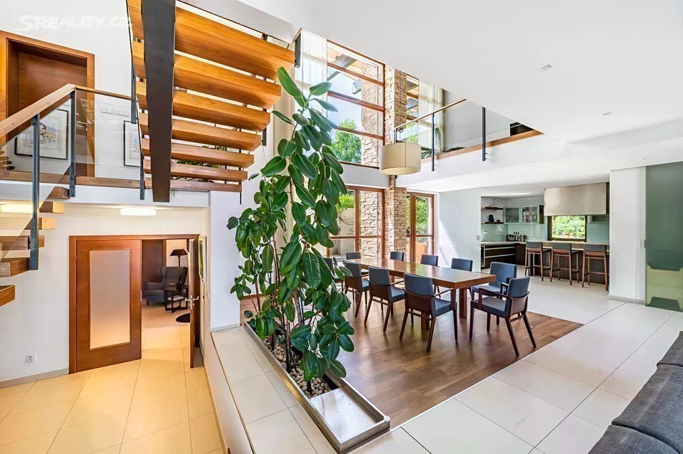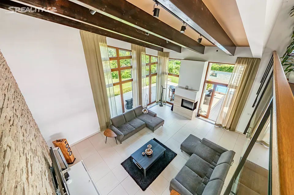 Nadčasová, nízkoenergetická (B), velkoryse pojatá, třípodlažní vila (z roku 2012) s bazénem, prosvětleným a vzdušným interiérem na slunném upraveném pozemku (2276m2) je součástí uzavřeného, rezidenčního komplexu luxusních vil v mimořádně klidné lokalitě v krásné komorní čtvrti se vzrostlou zelení zasazené do klidného, jedinečného místa obklopeného vzrostlou zelení, v blízkosti Radotínsko-Chuchelského háje a přírodní rezervace Homolka nabízí ničím nerušené výhledy do zahrady, přilehlé zeleně a panorama Prahy. Luxusně vybavená vila je vhodná i pro vícegenerační bydlení nebo pro velkou rodinu s chůvou. Prosluněný interiér skýtá dvě podlaží a suterén, 10 ložnic s en-suite koupelnami i walk-in šatnu do hlavní ložnice, zajímavě řešenou kuchyni která má prosklenou posuvnou stěnu, otevřený a velkorysý koncept obývacího pokoje a jeho propojení se zahradní terasou s neopakovatelnými výhledy na panorama Prahy a následně přímý výstup do zahrady na letní, slunící se terasu s bazénem. Nechybí samozřejmě nezbytné technické a provozní zázemí včetně prádelny s výstupem do zahrady. Při zařizování vily byl kladen velký důraz na nadčasovou eleganci a vysoký uživatelský komfort. Francouzská okna jsou dřevěná s izolačními skly, podlahy dřevěné a s velkoformátovou dlažbou. Podlahové topení v celém domě zajišťuje tepelné čerpadlo s vrty. Nechybí vrtaná studna či retenční nádrž na dešťovou vodu. K vybavení patří nábytek, fitness, venkovní vyhřívaný bazén, krb na dřevo, klimatizace v celém domě, kuchyně se spotřebiči (sporák plynový), připojení TV a wi-fi ve všech místnostech, systém automatické závlahy zahrady. Bezproblémové parkování poskytuje garáž pro cca pro 6 aut přístupná „suchou nohou“ a 4 venkovní stání. Zahradu lemují vzrostlé stromy. Bydlení zpříjemňuje spousta okolní zeleně a mnoho možností procházek či cyklovýletů v přírodním parku Homolka a Chuchelský Háj. Jedinečná přírodní lokalita poskytuje klidné prostředí, soukromí a relaxační výhledy do zeleně. Z místa se dá rychle dostat do centra i na letiště, autobusovými spoji též k metru. Pohodlí zajišťuje blízkost občanské vybavenosti. Jsou zde mateřské školy, základní škola i gymnázium, sportovní centrum, potraviny. Užitná plocha 674 m2 zastavěná plocha 480m2, pozemek 773 m2 (zahrada 1796m2 + 480m2 zastavěná plocha).