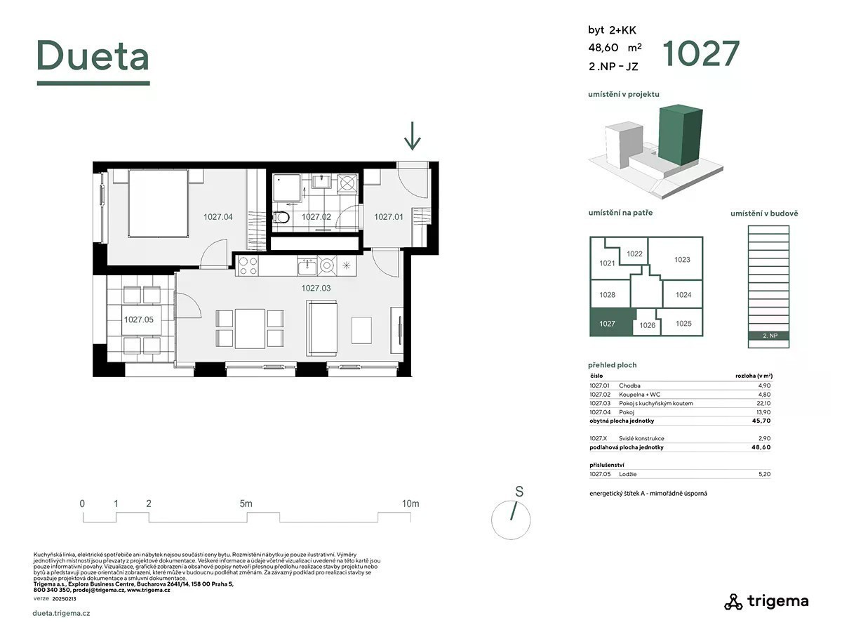 Byt č. 1024: Světlé 2+kk s promyšleným uspořádáním Výstavba zahájena - 40 % bytů prodáno během 6 měsíců! Neváhejte s výběrem - právě teď máte možnost zvolit si ideální dispozici i orientaci bytu v atraktivním projektu Dueta Kamýk, který spojuje moderní bydlení s přírodou Byt č. 1024 o dispozici 2+kk a podlahové ploše 53,10 m² je situován ve 2. nadzemním podlaží s orientací na východ, což zajišťuje ranní světlo a příjemnou atmosféru. Dispozice bytu zahrnuje prostorný obývací pokoj s kuchyňským koutem (24,40 m²), ložnici, koupelnu s WC a chodbu. Obytná plocha činí 49,70 m², doplněná o konstrukční prvky. · Dobře navržený půdorys 2+kk · Východní orientace pro ranní světlo · Kompaktní dispozice s efektivním využitím prostoru · Energetická třída A - mimořádně úsporná Vhodné pro: Páry nebo jednotlivce, kteří hledají moderní byt s příjemnou atmosférou a efektivním řešením. Projekt Dueta Kamýk přináší jedinečnou kombinaci klidného bydlení uprostřed přírody a skvělé dostupnosti do centra Prahy díky plánované trase metra D. Lokalita nabízí nejen blízkost lesoparku a rozsáhlé zeleně, ale i atraktivní výhledy, které ocení každý milovník přírody. Byty jsou vybaveny nadstandardními technologiemi - rekuperací, podlahovým vytápěním, předokenními žaluziemi a kvalitními materiály, které zaručují pohodlí i úsporný provoz. Dueta Kamýk je ideálním řešením jak pro vlastní bydlení, tak jako chytrá investice v rychle se rozvíjející lokalitě.