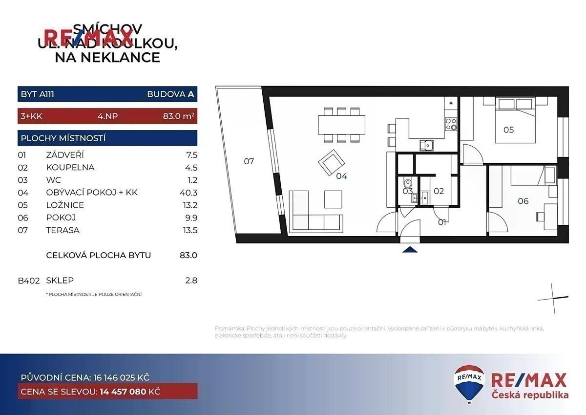 Hledáte moderní bydlení v klidné lokalitě s výbornou dostupností centra Prahy? V oficiálním zastoupení představujeme unikátní rezidenční projekt přímo od developera. Nabízíme prostorný byt 3+KK o rozloze 83 m² ve třetím patře moderního bytového domu. Byt je krásně prosvětlený díky velkým oknům, která do něj vpouštějí spoustu přirozeného světla. K bytu náleží prostorná terasa o rozloze 14 m². K bytu navíc patří sklepní kóje o velikosti 3 m², která poskytuje dostatek úložného prostoru. K dispozici je také možnost zakoupení parkovacího místa. Rezidenční bydlení tvoří tři bytové domy se společným vnitroblokem. Projekt je navržen ve vysokém standardu, který odpovídá prestižní lokalitě v Praze. Byty mají velká okna poskytující nádherný výhled na přírodu a panorama Prahy. Interiéry jsou vybaveny eurookny s trojsklem, vinylovými podlahami, velkoformátovou dlažbou v koupelnách a WC, vchodovými dveřmi a hladkými bílými interiérovými dveřmi s grafitovým kováním. V koupelně je umyvadlo se skříňkou, vana a závěsné WC značky Willeroy&Boch. Lokalita nabízí blízkost přírody a zároveň skvělou dostupnost do centra Prahy. Oblíbená lokalita Anděl je 3 minuty autem, 10 minut hromadnou dopravou nebo 20 minut pěšky a nabízí kompletní občanskou vybavenost - nákupní centrum, restaurace, kavárny, stanici metra B a proslulou Náplavku. Nejbližší tramvajová zastávka je pouze 2 minuty chůze. Nová cena bytu se slevou. Byt je k nastěhování ihned. K dispozici máme také další krásné a prostorné byty 2+KK až 3+KK. Rádi Vám pomůžeme s možností financování hypotečním úvěrem. Kontaktujte nás ještě dnes a domluvte si prohlídku!