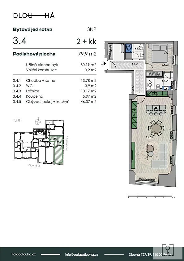 Nabízíme vám výjimečný byt 2+kk o ploše 79,9 m², který se nachází ve 3. nadzemním podlaží prestižního projektu Palác Dlouhá. Spojení noblesní historické architektury a moderního interiérového designu vytváří ideální prostor pro náročné městské bydlení i investici v top lokalitě. Dominantou bytu je vzdušný obývací prostor s kuchyňským koutem (46,37 m²), ideální pro každodenní život i společenské chvíle. Ložnice (10,17 m²) nabízí klidné útočiště, zatímco praktická chodba se šatnou (13,78 m²) poskytuje dostatek úložného prostoru. Dále je k dispozici elegantní koupelna (5,97 m²) a samostatné WC (3,9 m²). Byt vyniká vysokými stropy, velkými okny a nadčasovou atmosférou zrekonstruovaného historického domu. Světlo a prostor zde hrají hlavní roli. Lokalita? Absolutní centrum Prahy. V bezprostřední blízkosti najdete špičkové restaurace, kavárny, obchody i kulturní instituce. Skvělá dopravní dostupnost (metro, tramvaje) i pěší dostupnost památek dělají z této adresy mimořádné místo pro život i investici.